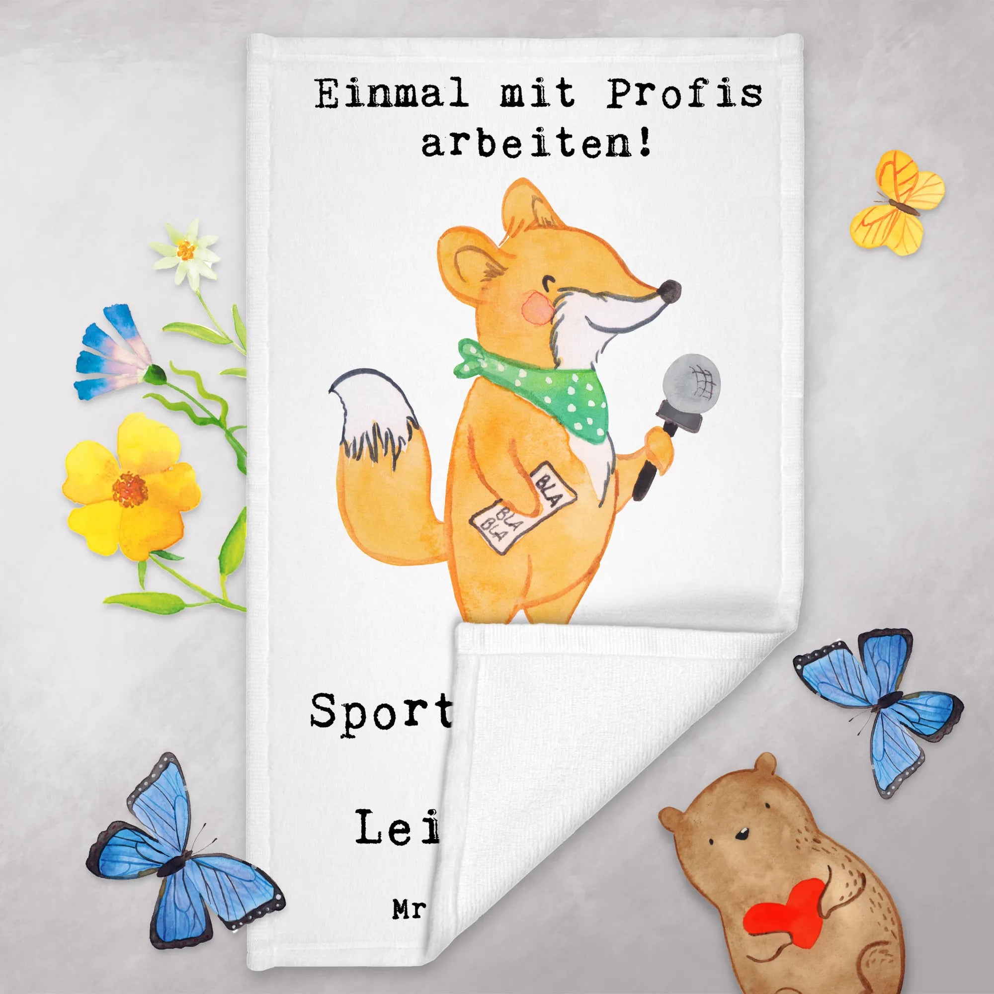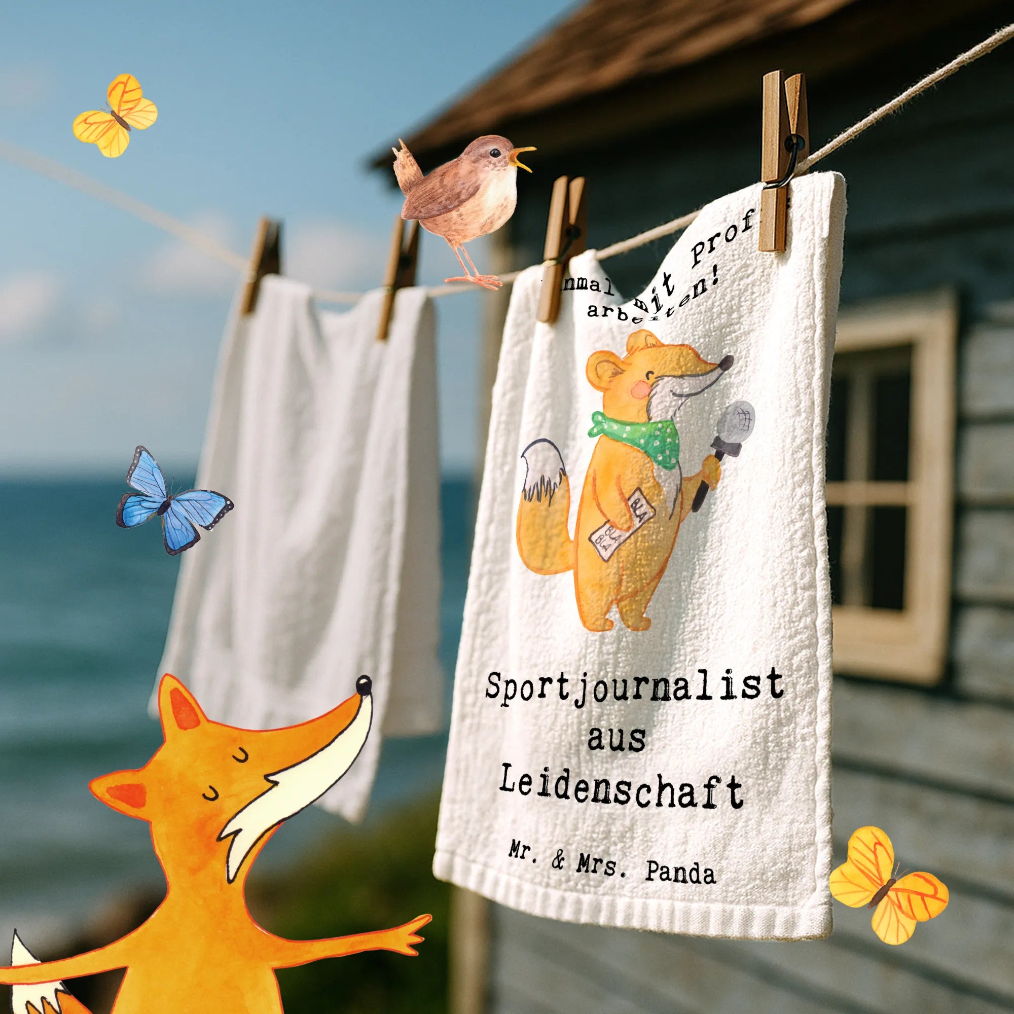Das Gästehandtuch "Sportjournalist aus Leidenschaft" von Mr. & Mrs. Panda ist das perfekte Geschenk für Sportjournalisten und alle, die die Welt des Sports lieben. Mit einem süßen Motiv eines Fuchses, der begeistert in ein Mikrofon spricht, bringt dieses Handtuch nicht nur Farbe in jedes Badezimmer, sondern auch ein Lächeln auf die Gesichter deiner Gäste.