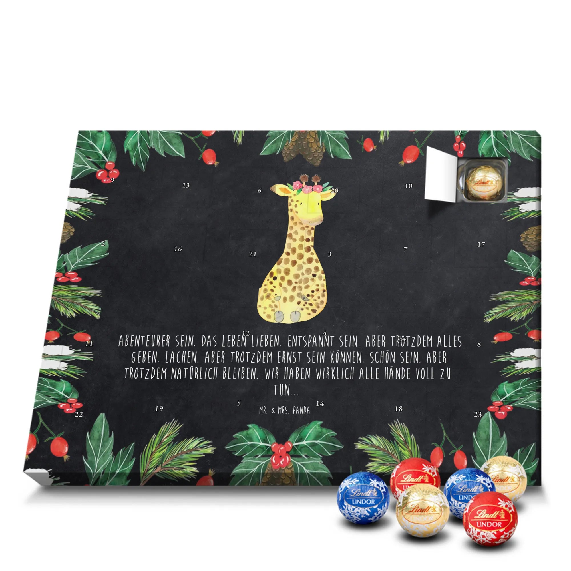 Unser liebevoller Schokoladen Adventskalender von Mr. & Mrs. Panda ist perfekt für alle, die sich eine fröhliche und süße Adventszeit wünschen. Aufwendig bedruckt mit unseren typischen Motiven & Sprüchen, nicht personalisierbar – dafür aber unglaublich hübsch anzusehen. Die brillante Druckqualität mit seidenmatter Oberflächenveredelung verleiht dem Kalender ein edles Aussehen, und die bedruckten Seitenflächen runden das Design ab. Maße: 233 mm x 178 mm x 24 mm. Besonderheit: kann aufgehängt oder aufgestellt werden, so bleibt er flexibel für deinen Deko-Stil. Gefüllt mit Lindt Lindor: 24 einzeln verpackte Markenschokoladen Kugeln in drei leckeren Sorten – Vollmilch, Feinherb und Weiße Schokolade – sorgen für tägliche Genussmomente. Zutaten: Zucker, pflanzliches Fett (Kokosnuss, Palmkern), Kakaobutter, Vollmilchpulver, Kakaomasse, Milchzucker, Magermilchpulver, Butterreinfett, Emulgator (Sojalecithin), Gerstenmalzextrakt, Aromen. Besondere Hinweise: Kann Haselnüsse und Mandeln enthalten. Ein tolles Geschenk oder eine hübsche Dekoration – unser Schokoladen Adventskalender macht die Wartezeit bis Weihnachten noch schöner!