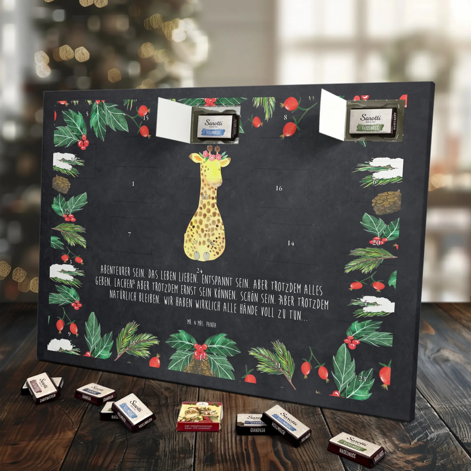 Adventskalender Giraffe Blumenkranz - Sarotti - mit Spruch - Eisblau