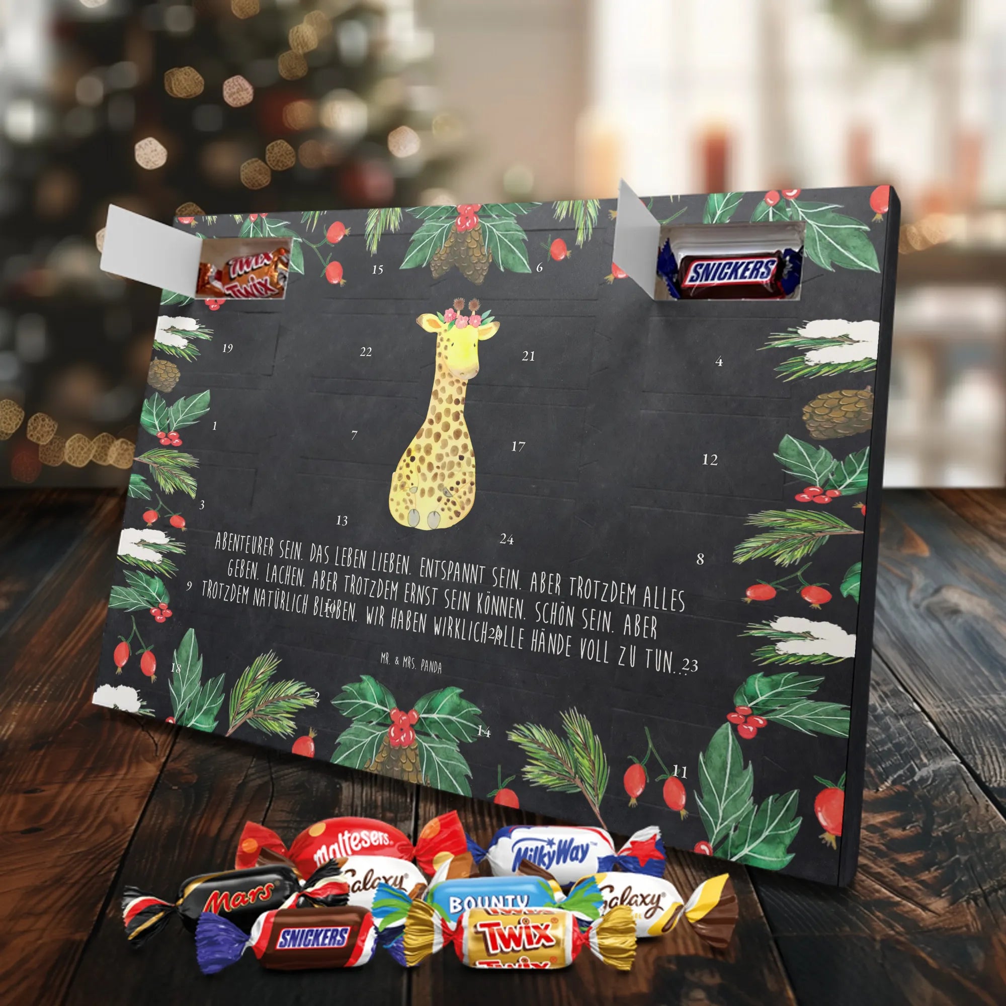 Unser Schoko Adventskalender von Mr. & Mrs. Panda bringt dir und deinen Lieben jede Menge Vorfreude und zauberhafte Momente in die Adventszeit. Der Kalender ist liebevoll bedruckt mit wunderschönen Motiven und frechen Sprüchen im typischen Mr. & Mrs. Panda Stil – ein echter Blickfang auf dem Tisch oder an der Wand. Die brillante Druckqualität kombiniert mit einer seidenmatten Oberflächenveredelung sorgt für edle Farben und ein angenehmes Gefühl beim Anfassen. Auch die Seitenflächen sind bedruckt, sodass der Kalender von allen Seiten hübsch aussieht. Er ist nicht personalisierbar, dafür aber in seiner Gestaltung rundum stimmig. Gefüllt ist der Adventskalender mit 24 hochwertigen Celebrations-Füllungen in acht verschiedenen Sorten: Maltesers, Mars, Snickers, Twix, Milky Way, Bounty, Galaxy und Galaxy Caramel — so ist für jede Naschkatze etwas dabei. Die Besonderheit: Du kannst den Kalender entweder aufstellen oder dank rückseitiger Aufhängung an die Wand hängen. Maße: 325 mm x 225 mm x 27 mm. Ein liebevolles Geschenk für Familie, Freunde oder einfach für dich selbst, das kleine tägliche Glücksmomente schenkt und die Adventszeit versüßt.
