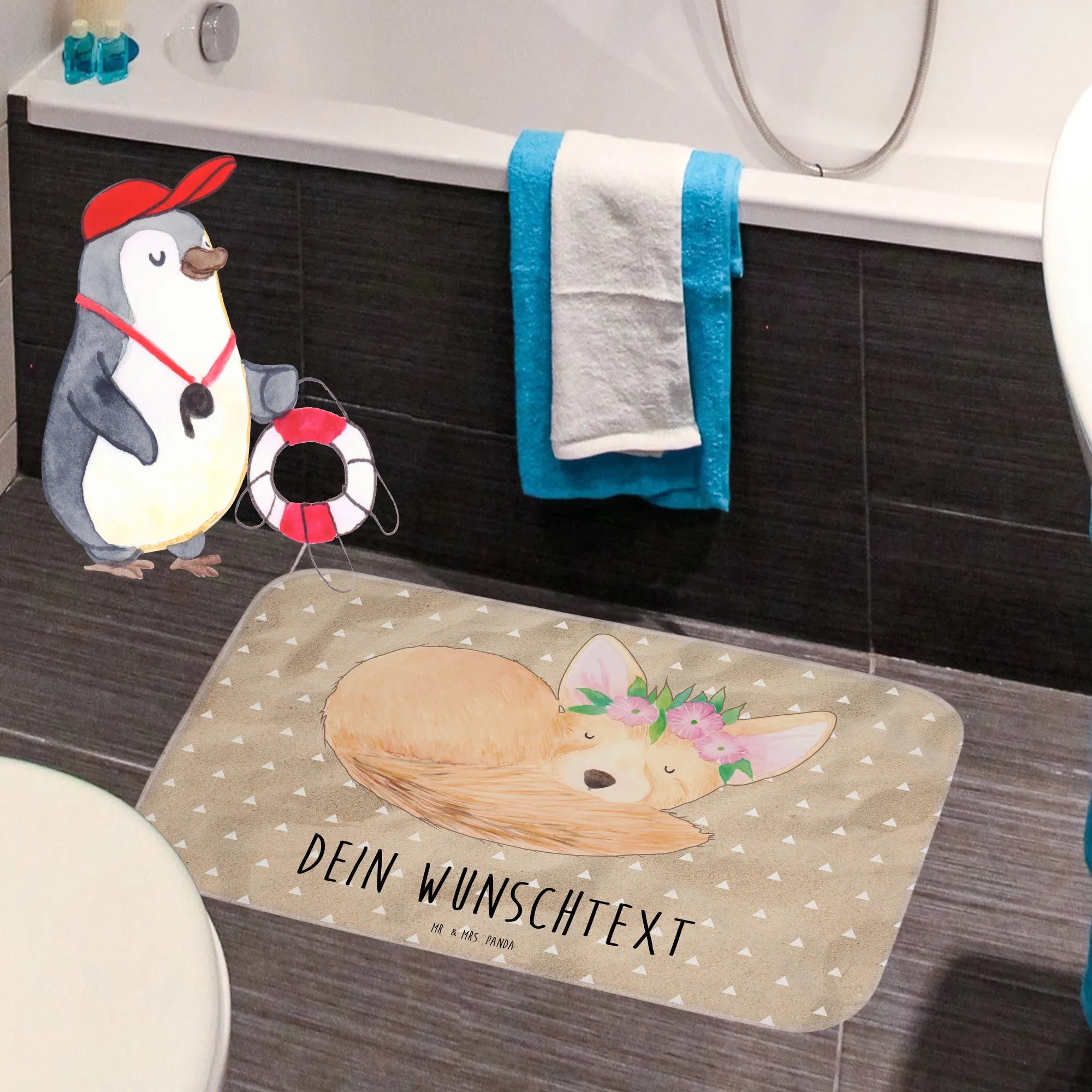Der personalisierte Badvorleger mit dem Motive Wüstenfuchs Blumenkranz von Mr. & Mrs. Panda ist der perfekte Blickfang für dein Badezimmer! Er sorgt nicht nur für eine gemütliche Atmosphäre, sondern bietet auch zusätzlichen Komfort und Sicherheit. Dieser wunderschöne Badvorleger ist nicht nur flauschig, sondern auch mit einer rutschfesten Gummibeschichtung ausgestattet, die dir jeden Tag ein sicheres Gefühl im Badezimmer gibt. Die zauberhafte Darstellung des Wüstenfuchses, der friedlich mit einem Blumenkranz auf dem Kopf schläft, zaubert dir garantiert ein Lächeln ins Gesicht.