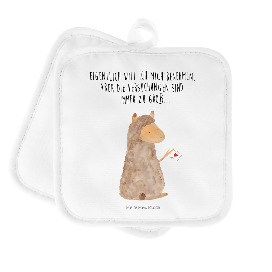 Die Mr. & Mrs. Panda Topflappen im 2er Set mit dem lustigen Alpaka Fahne Motiv sind das perfekte Geschenk für jeden Koch und Backliebhaber!