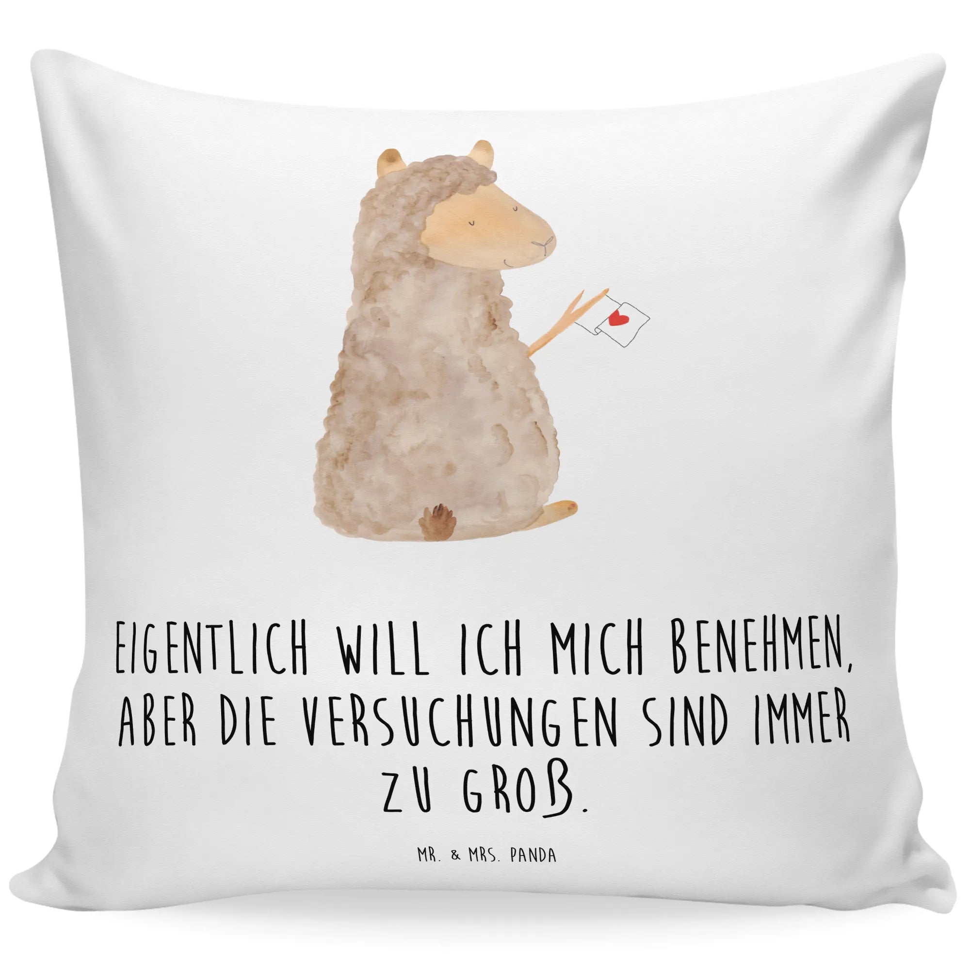Dieses liebevoll gestaltete Dekokissen zeigt ein fröhliches Alpaka mit einer Fahne und einem großen Herz – dazu der freche Spruch: „Eigentlich will ich mich benehmen, aber die Versuchungen sind immer zu groß.“ Ein echter Blickfang, der deinem Sofa, Sessel oder Bett sofort Wärme und gute Laune verleiht.