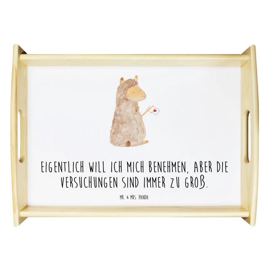 Verwöhne Deine Liebsten mit unserem bezaubernden Serviertablett von Mr. & Mrs. Panda! Mit den Maßen von 480 mm x 480 mm x 65 mm und einem gewicht von 925 g ist es nicht nur hübsch, sondern auch praktisch. Aus lasiertem Echtholz gefertigt, begeistert es mit einem lebendigen Druck, der gute Stimmung verbreitet. Egal ob beim Frühstück im Bett oder beim gemütlichen Abendessen auf dem Sofa – die seitlichen Griffmulden ermöglichen ein einfaches Tragen. Die Anti-Rutsch Pads auf der Unterseite sorgen dafür, dass alles sicher an seinem Platz bleibt. Dank der kratzfesten Oberfläche bleibt dein Tablett nach jeder Benutzung in bestem Zustand – einfach mit einem feuchten Tuch und Spülmittel abwischen, aber nicht einweichen! Beachte bitte die längere Anfertigungszeit aufgrund der besonderen Verarbeitung.