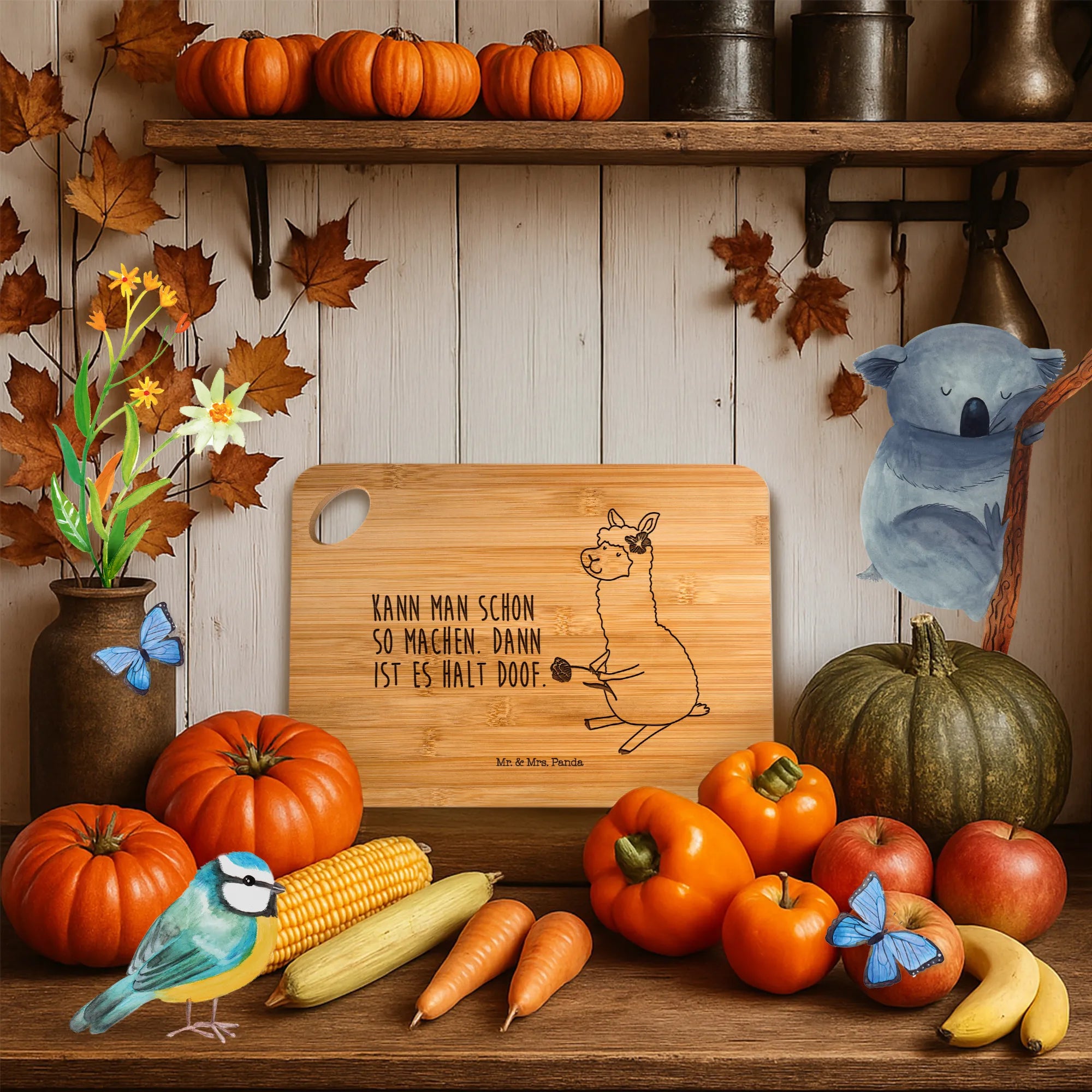 Unser kleines Holzbrettchen mit dem liebenswerten Alpaka Motiv bringt gute Laune in deine Küche. Das flauschige Alpaka trägt eine Blume im Haar und hält eine weitere Blume in der Hand – ein Motiv, das zum Verweilen einlädt. Der lustige Spruch „Kann man schon so machen. Dann ist es halt doof.“ ist quer auf dem Brett graviert und sorgt garantiert für ein Schmunzeln bei dir und deinen Gästen.