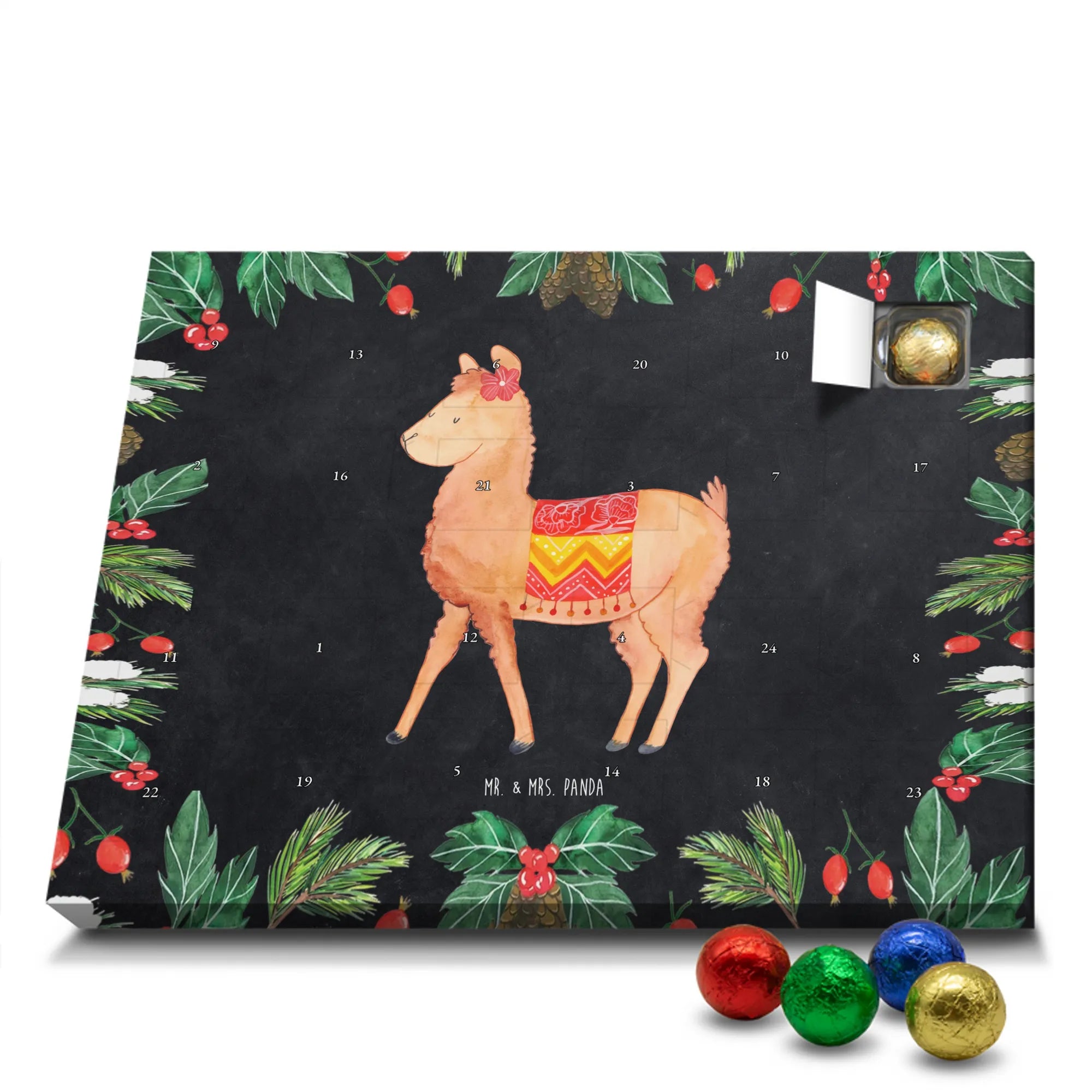 Wunderschöner Schokoladen Adventskalender von Mr. & Mrs. Panda – perfekt, um dir oder deinen Liebsten die Vorweihnachtszeit zu versüßen. Unser liebevoll gestalteter Schoko Adventskalender ist bedruckt mit wunderschönen Motiven & Sprüchen von Mr. & Mrs. Panda und bleibt ein fröhlicher Blickfang auf dem Tisch oder an der Wand. Er ist nicht personalisierbar, dafür aber mit viel Herz und Details gestaltet. Brillante Druckqualität mit seidenmatter Oberflächenveredelung sorgt dafür, dass die Farben strahlen und die Motive besonders edel wirken. Die Seitenflächen sind ebenfalls bedruckt, sodass der Kalender von allen Seiten hübsch aussieht. Maße: 233 mm x 178 mm x 24 mm und durch seine stabile Bauweise kannst du ihn sowohl aufstellen als auch an die Wand hängen – Besonderheit: kann aufgehängt oder aufgestellt werden. Gefüllt mit MARKENNAMEN Schokolade und leckeren Schokoladenkugeln, bietet jeder Tag eine kleine, köstliche Überraschung. Bitte beachte die besonderen Hinweise: (Kann Spuren von Haselnüssen, Mandeln, Gluten und Soja enthalten!), kühl und trocken lagern. Der Kalender eignet sich toll als Geschenk, als Adventsdekoration oder als liebevolle Aufmerksamkeit für Freunde und Familie. Mr. & Mrs. Panda wünscht dir eine süße und gemütliche Vorweihnachtszeit!