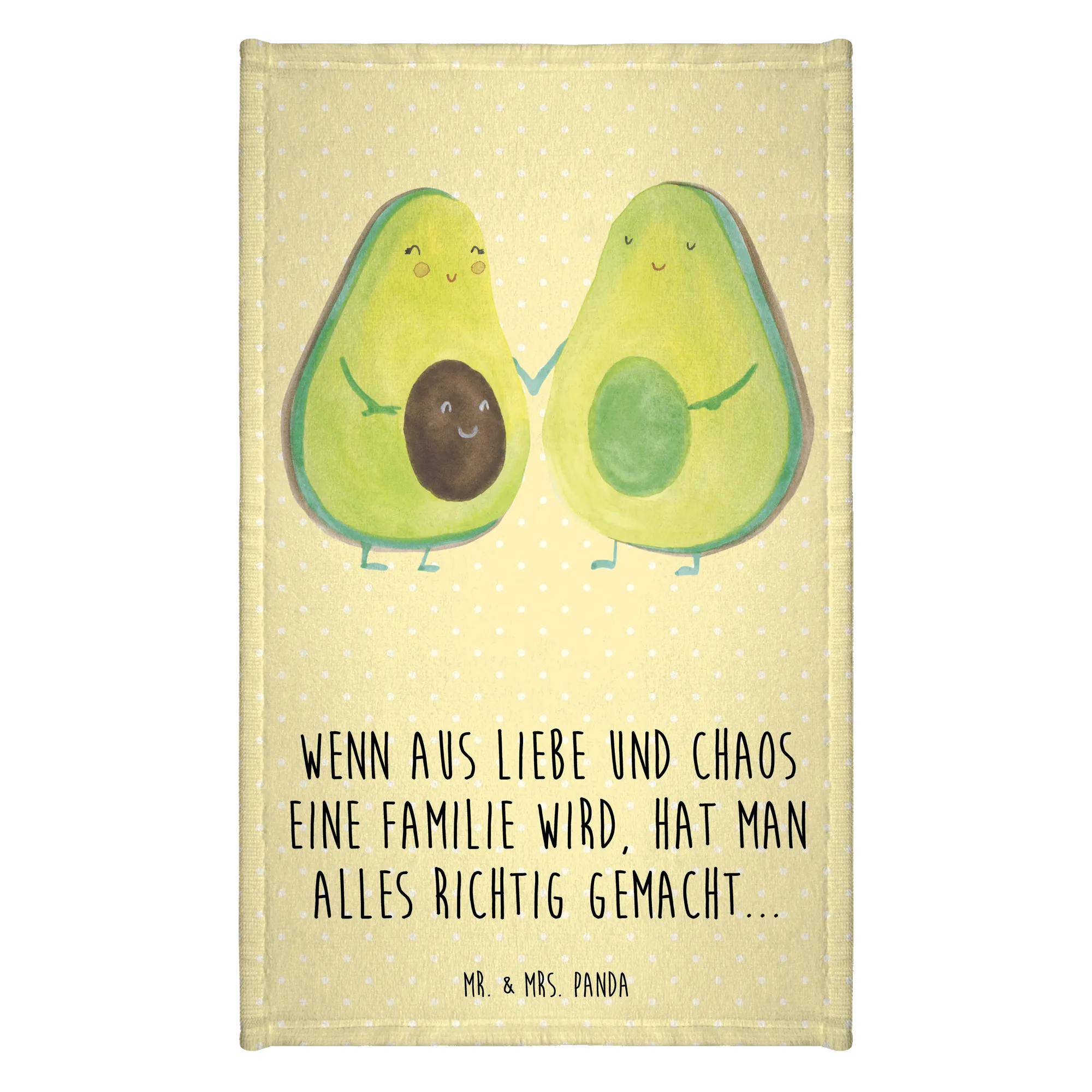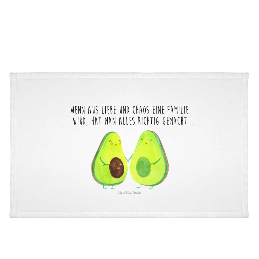 Das Gästehandtuch mit dem süßen Avocado-Pärchen aus der Avocado Kollektion von Mr. & Mrs. Panda ist das perfekte Geschenk für jede Gelegenheit! Ob zur Babyshower, Babyparty, Hochzeit oder einfach nur, um deine Familie und Freunde zu überraschen – mit diesem Handtuch bringst du garantiert ein Lächeln auf die Gesichter. Das Design zeigt ein niedliches Avocado-Pärchen, das verliebt Händchen hält und strahlt förmlich vor Liebe und Optimismus. Die Botschaft "Wenn aus Liebe und Chaos eine Familie wird, hat man alles richtig gemacht..." übt eine besondere Anziehungskraft aus und spricht Menschen an, die das Glück der Familie feiern möchten.