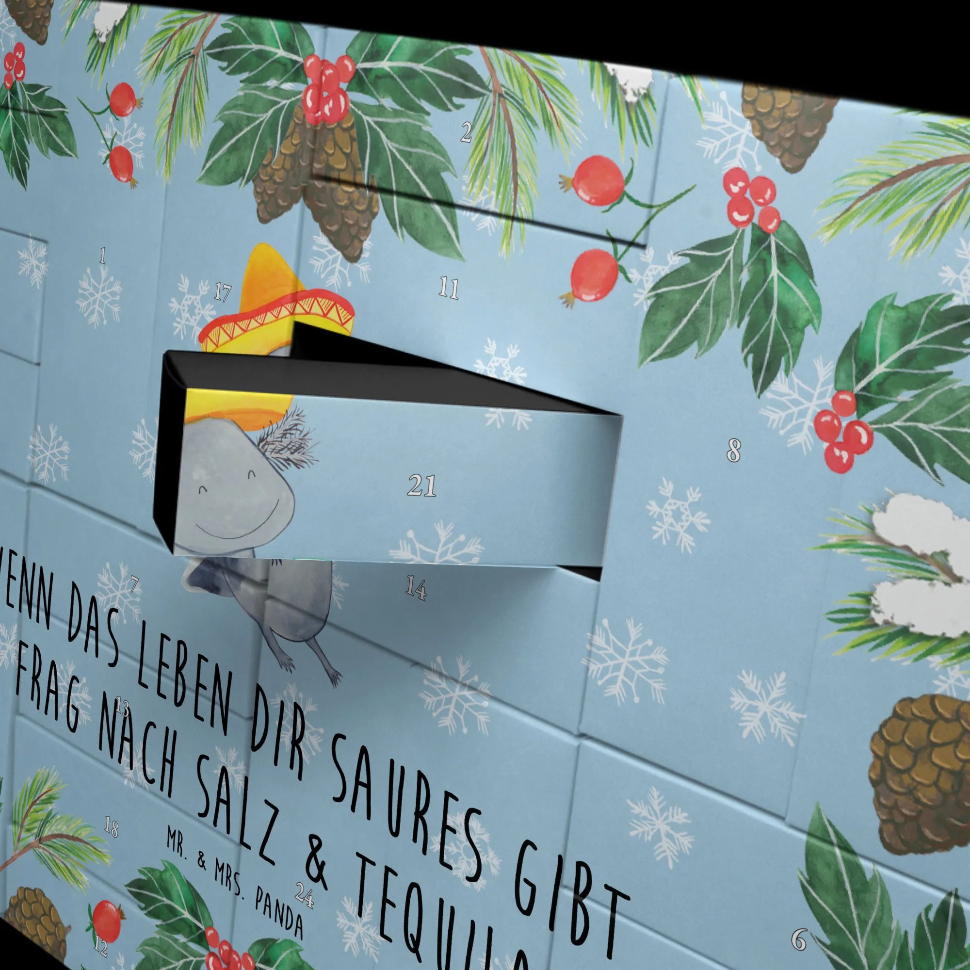 Feiere die Adventszeit mit Fiesta-Stimmung: Unser befüllbarer Adventskalender "Axolotl Tequila" von Mr. & Mrs. Panda bringt mexikanisches Flair in dein Zuhause. Das liebevoll handgezeichnete Axolotl mit Sombrero, Tequila-Glas und Zitrone kombiniert Niedlichkeit mit einem frechen Spruch: „Wenn das Leben dir saures gibt, frag nach Salz & Tequila.“