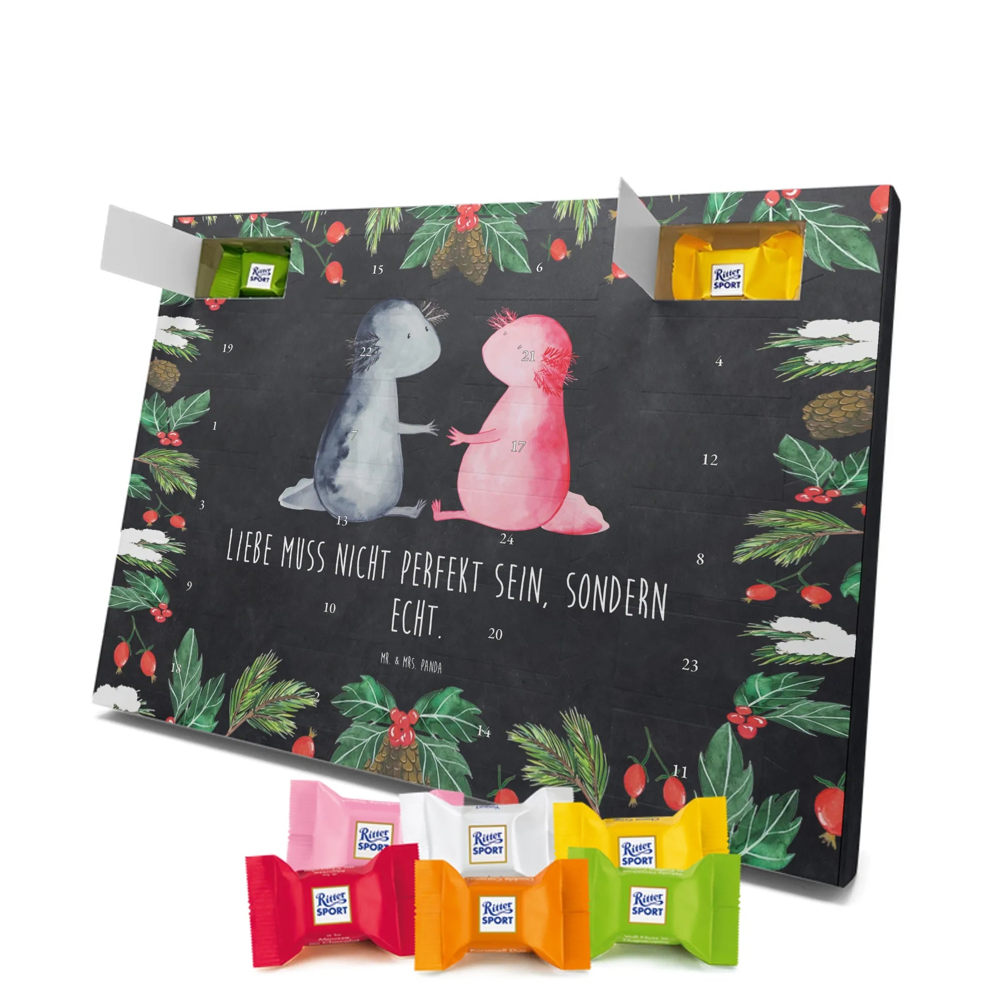 Mr. & Mrs. Panda Schoko Adventskalender „Axolotl Liebe“ – ein kleiner Liebesbeweis für die Vorweihnachtszeit. Die beiden niedlichen Axolotl sitzen sich gegenüber, halten Händchen und vermitteln eine warme, zärtliche Stimmung. Das liebevoll handgezeichnete Aquarell-Motiv von Mrs. Panda wird ergänzt durch den schönen Satz: „Liebe muss nicht perfekt sein, sondern echt.“ – perfekt für Paare, Verlobte oder als Geschenk zum Jahrestag oder Valentinstag. 💕
