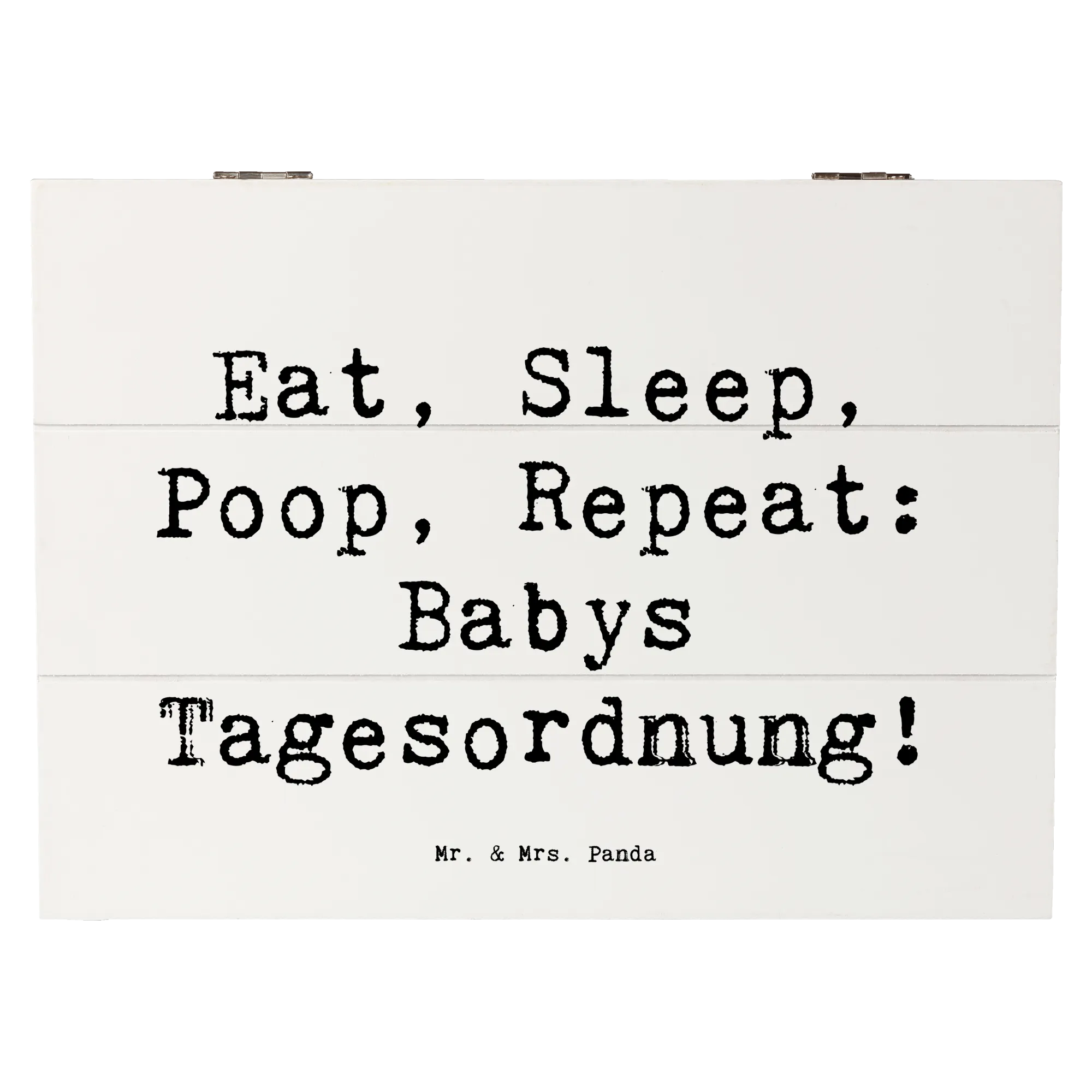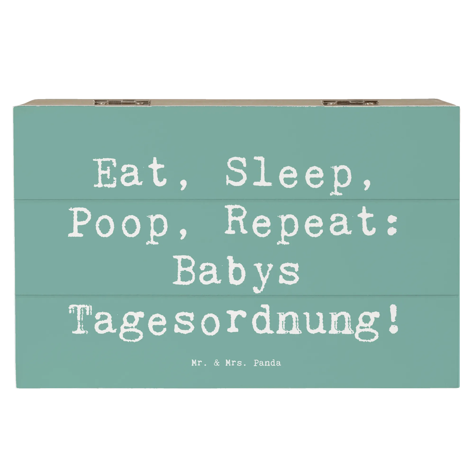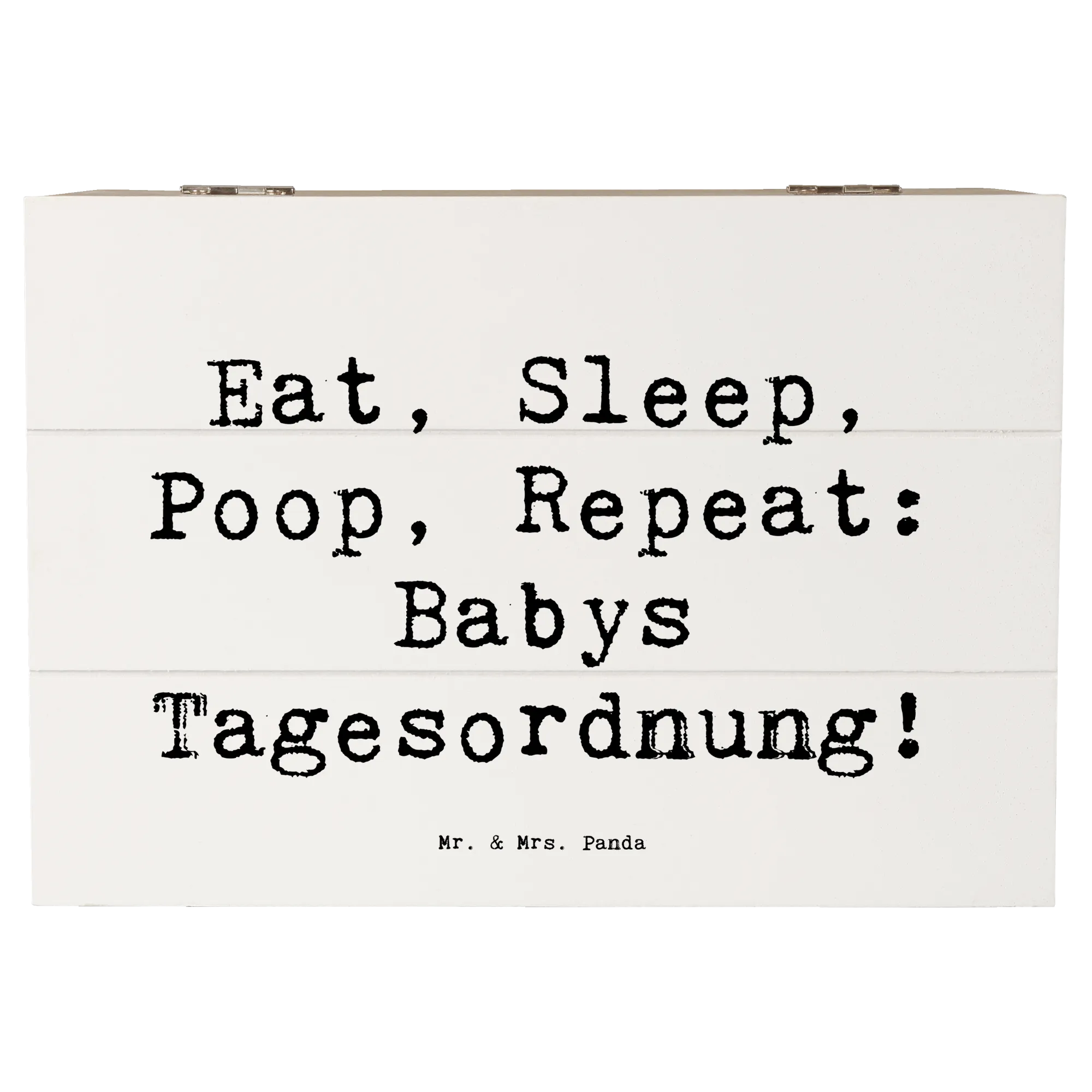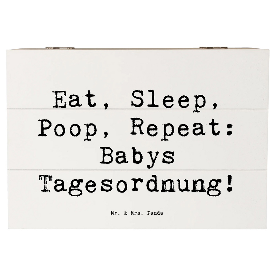 In der liebevoll gestalteten Kollektion "Familie & Verwandte" von Mr. & Mrs. Panda findest du zahlreiche Produkte, die ideal als Geschenke für Familie, Freunde und Verwandte geeignet sind. Diese Holzkiste mit dem Spruch "Eat, Sleep, Poop, Repeat: Babys Tagesordnung!" ist ein wunderbares Geschenk zur Geburt, zur Taufe oder einfach um jemandem ein kleines Lächeln ins Gesicht zu zaubern.