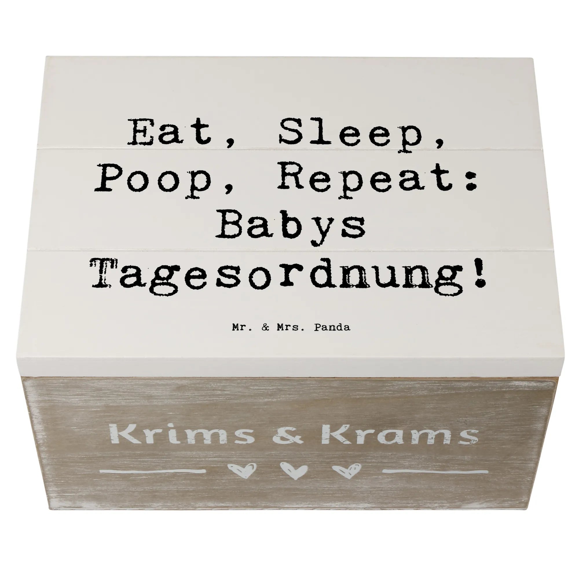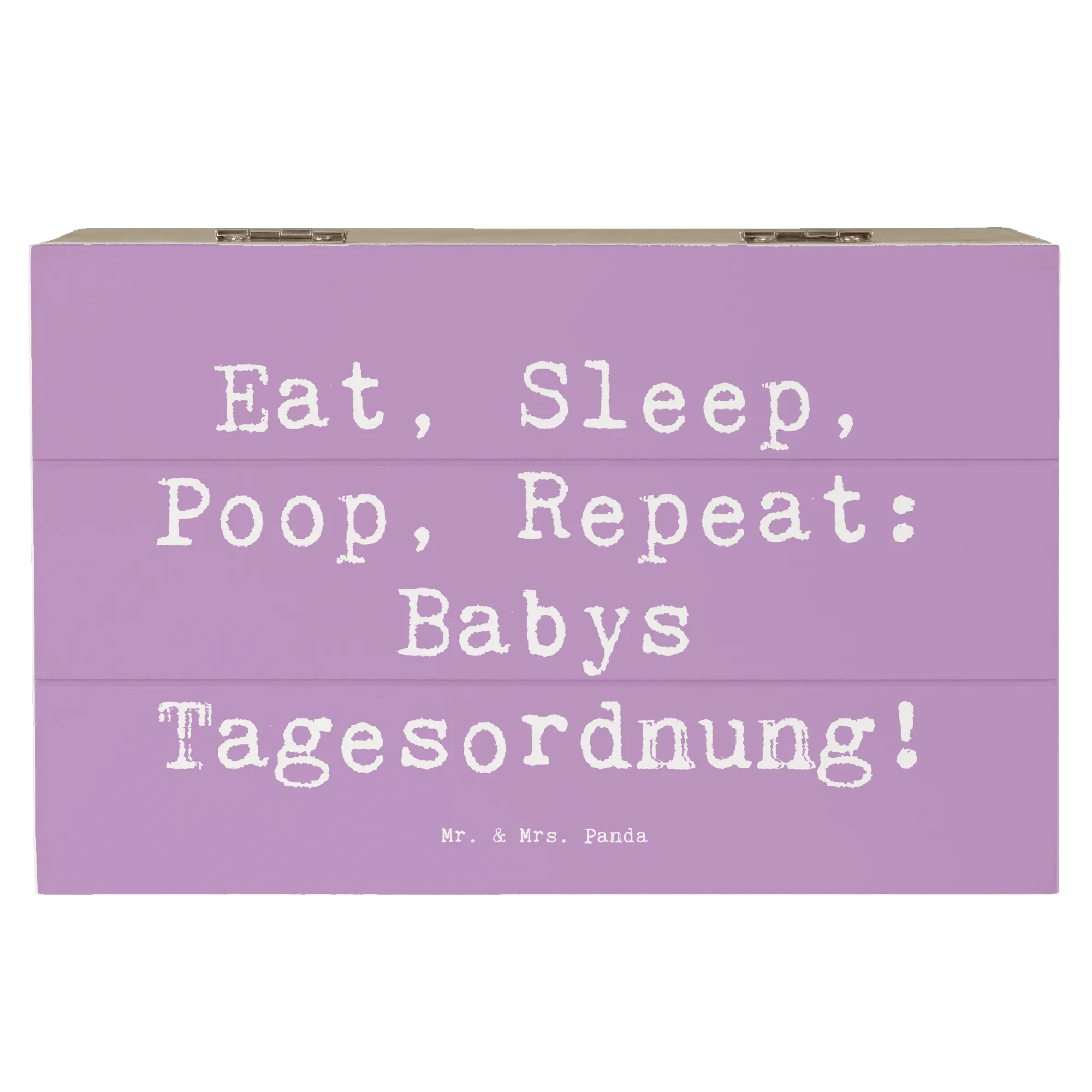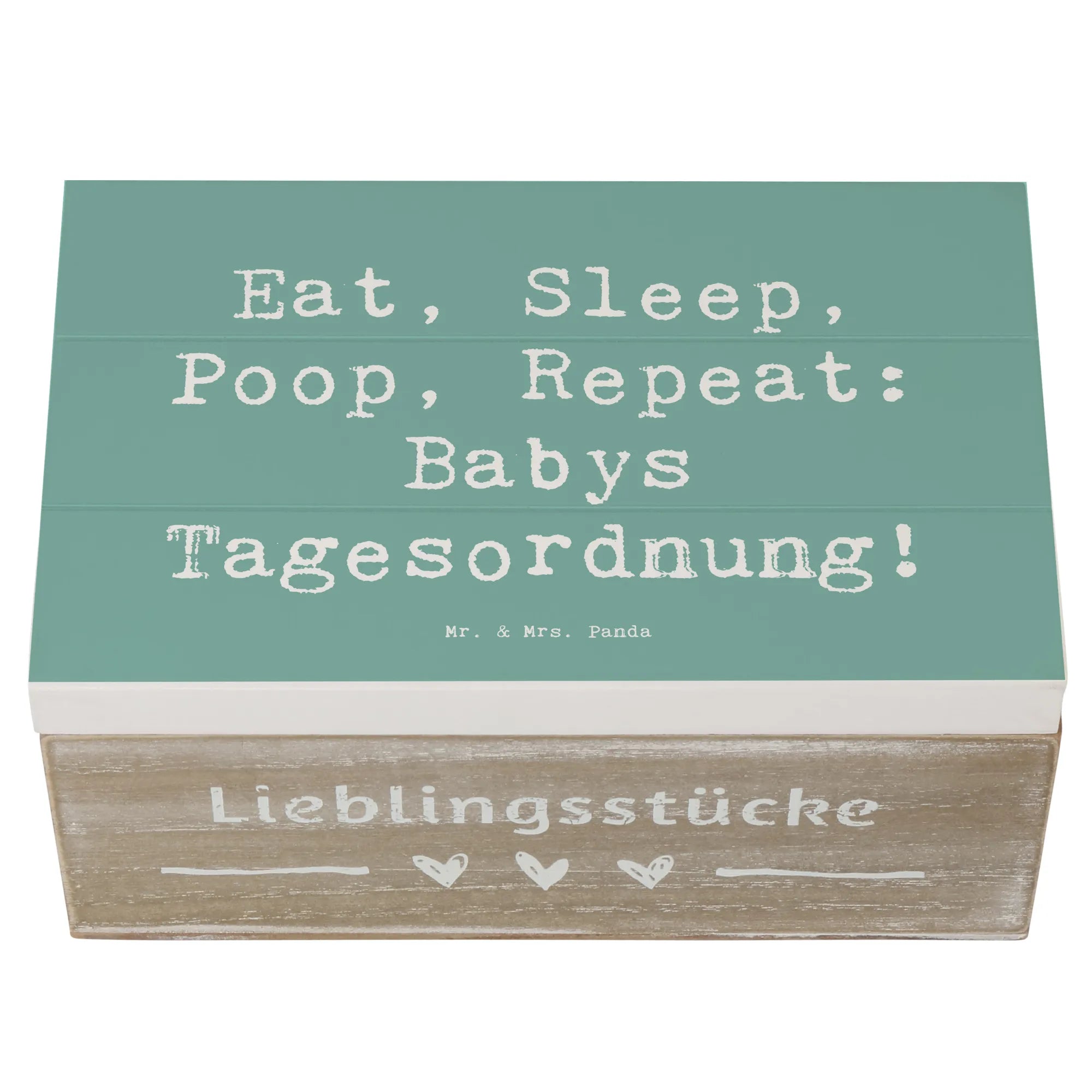 In der liebevoll gestalteten Kollektion "Familie & Verwandte" von Mr. & Mrs. Panda findest du zahlreiche Produkte, die ideal als Geschenke für Familie, Freunde und Verwandte geeignet sind. Diese Holzkiste mit dem Spruch "Eat, Sleep, Poop, Repeat: Babys Tagesordnung!" ist ein wunderbares Geschenk zur Geburt, zur Taufe oder einfach um jemandem ein kleines Lächeln ins Gesicht zu zaubern.