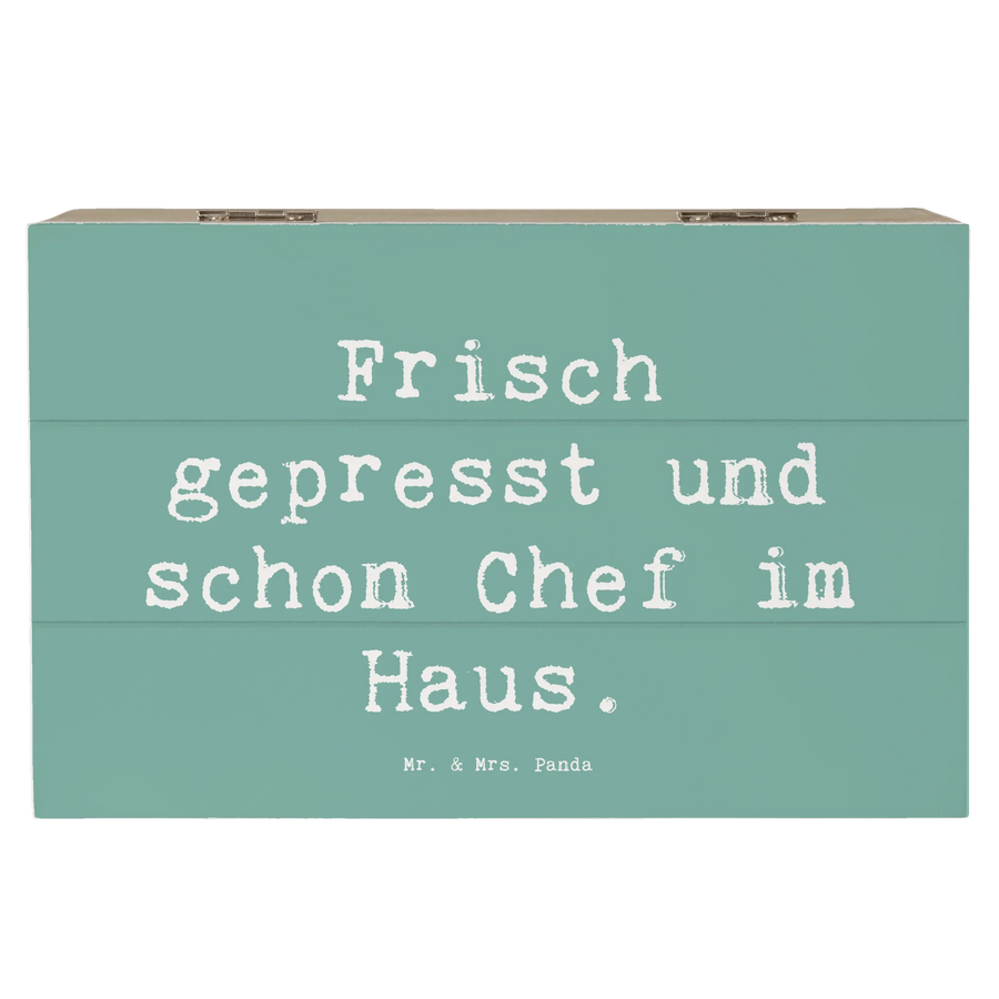 Der charmante Spruch "Frisch gepresst und schon Chef im Haus" wird garantiert ein Lächeln bei jedem Beschenkten hervorrufen. Die besondere Stabilität und die Einschlagscharniere ermöglichen ein einfaches Öffnen und Schließen der Kiste, damit Du die Erinnerungen jederzeit leicht erreichen kannst.