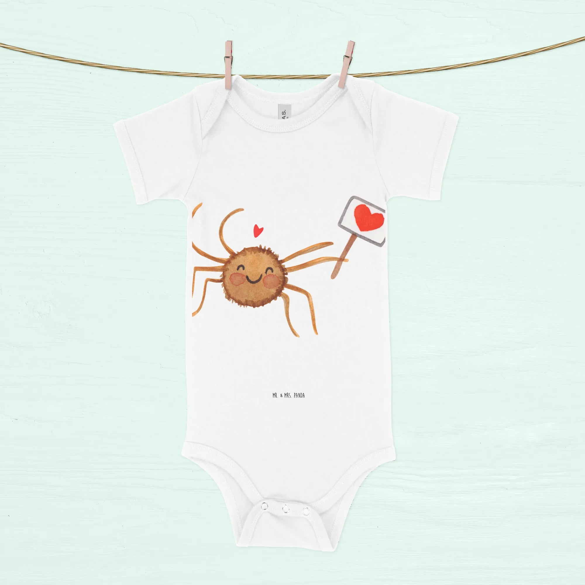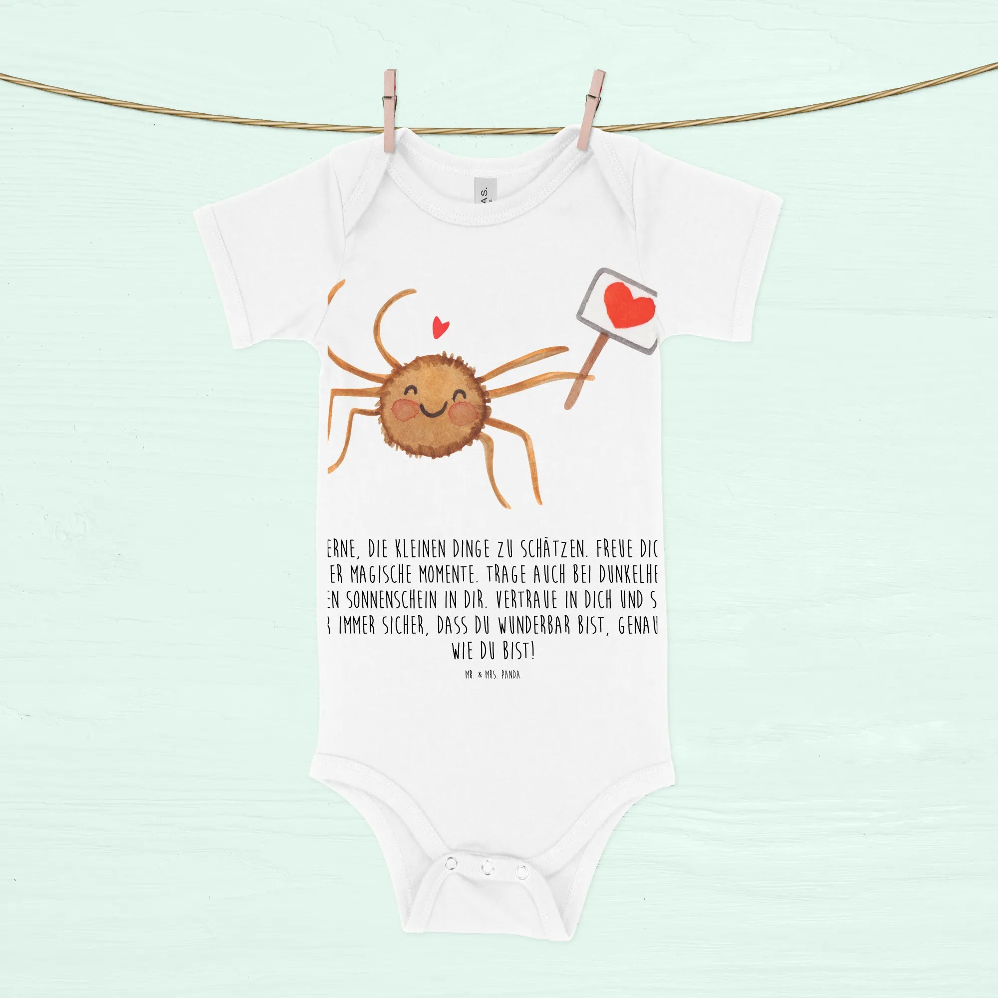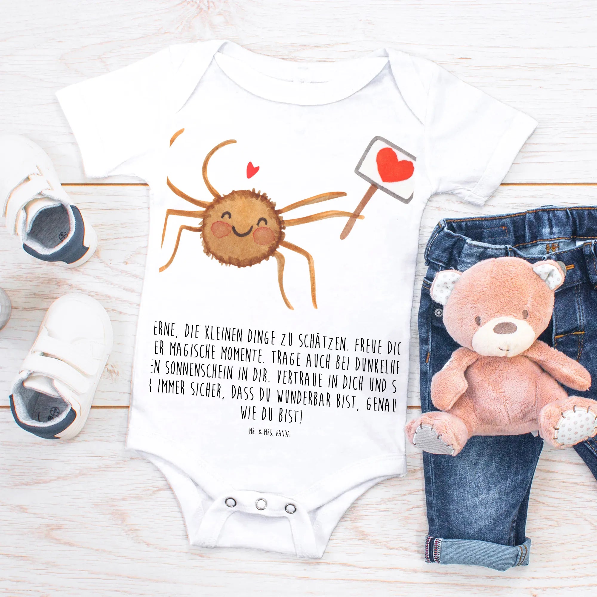 Der Baby Body mit dem Motiv "Spinne Agathe Motivation" aus der einzigartigen Kollektion von Mr. & Mrs. Panda ist das ideale Geschenk für kleine Schätze. Speziell für frisch gebackene Eltern oder zur Baby-Erstausstattung entworfen, vereint dieser Strampler Komfort und eine liebevolle Botschaft. Die niedliche Spinne Agathe, die strahlend lächelt, hält ein Herzchen in ihren kleinen Händen und erinnert uns daran, die kleinen Dinge zu schätzen.