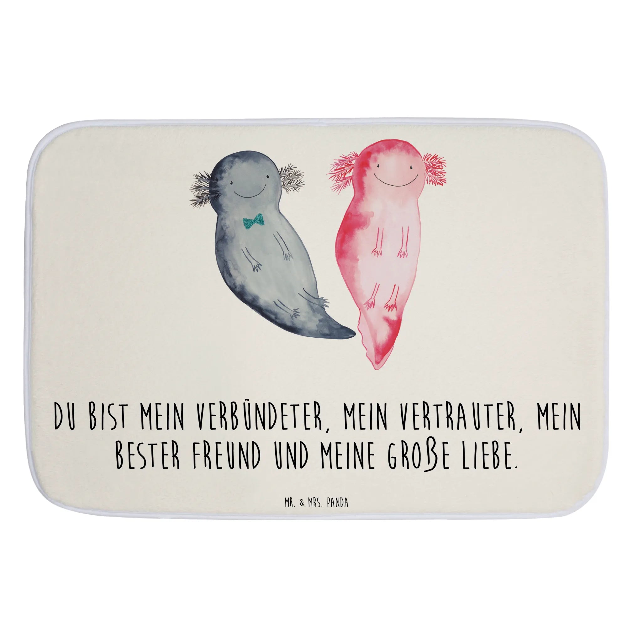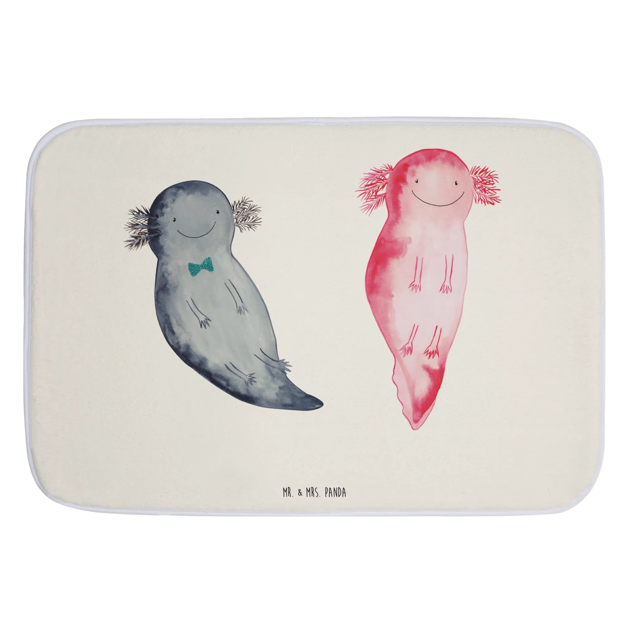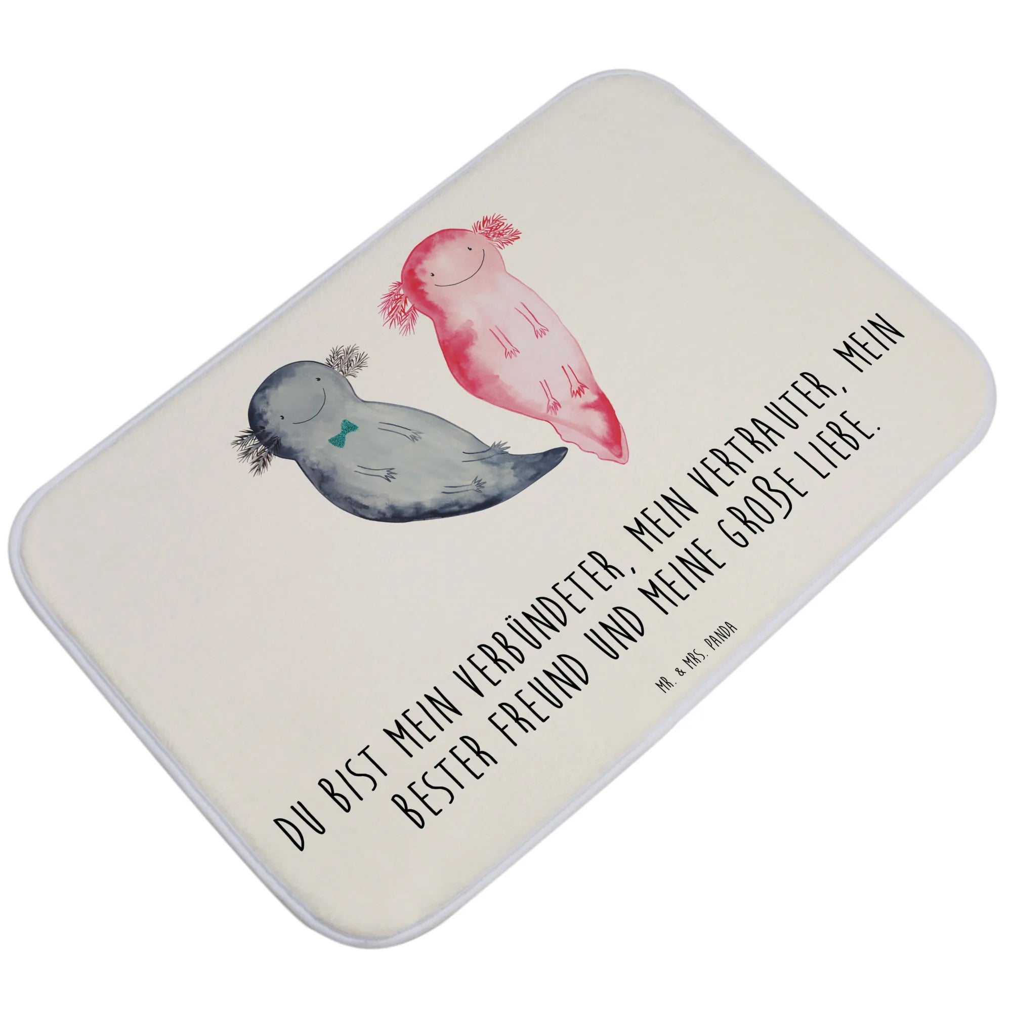 Der Badvorleger Axolotl Axel+Lotte von Mr. & Mrs. Panda ist das perfekte Wohnaccessoire für dein Badezimmer. Mit zwei niedlichen Axolotl, die fröhlich Seite an Seite schwimmen, bringt dieser Badteppich einen Hauch von Unterwasserwelt in dein Bad. Die liebevolle Aquarellzeichnung und die harmonische Farbgebung in pastelligen Tönen sorgen für eine angenehme Optik und schaffen eine entspannte Atmosphäre.