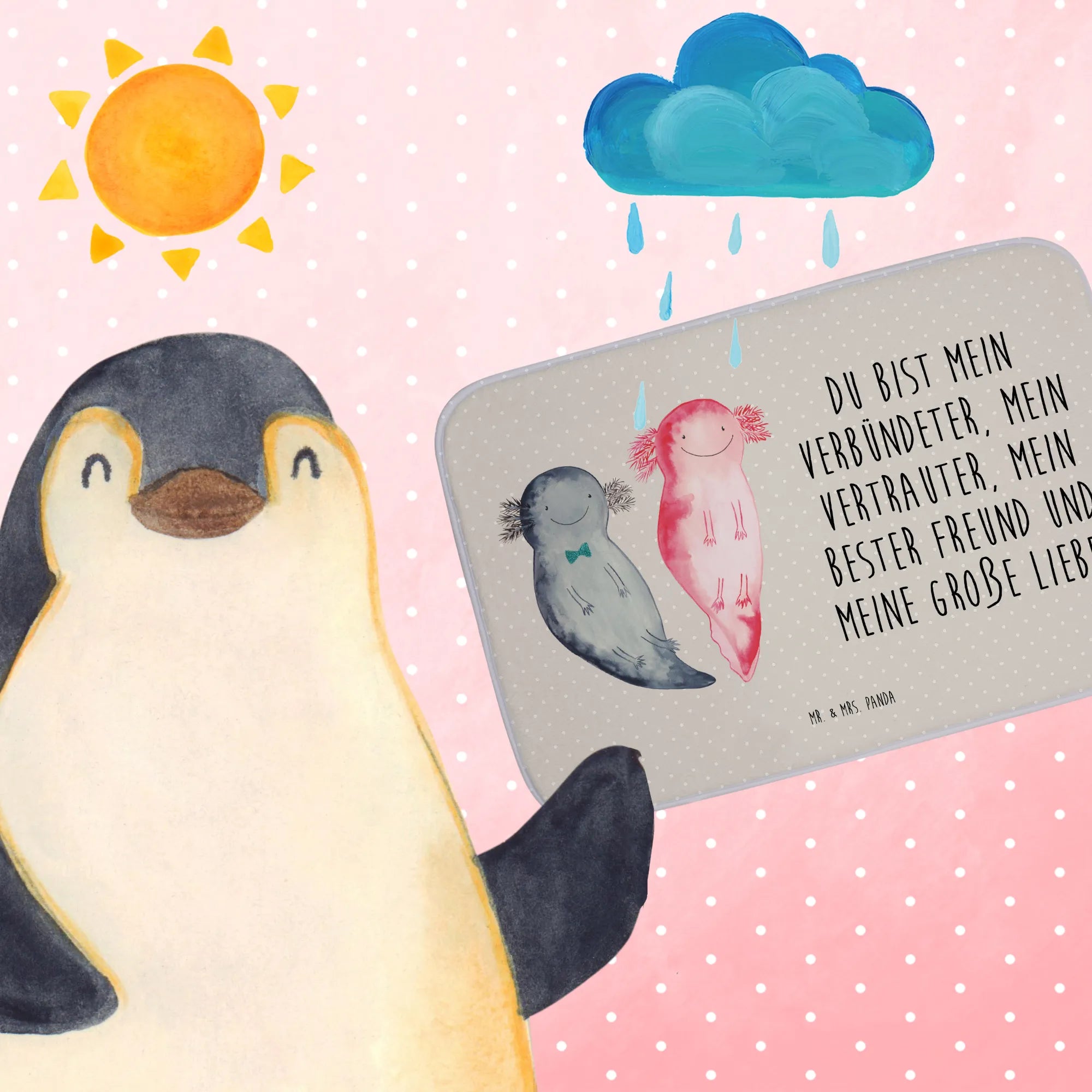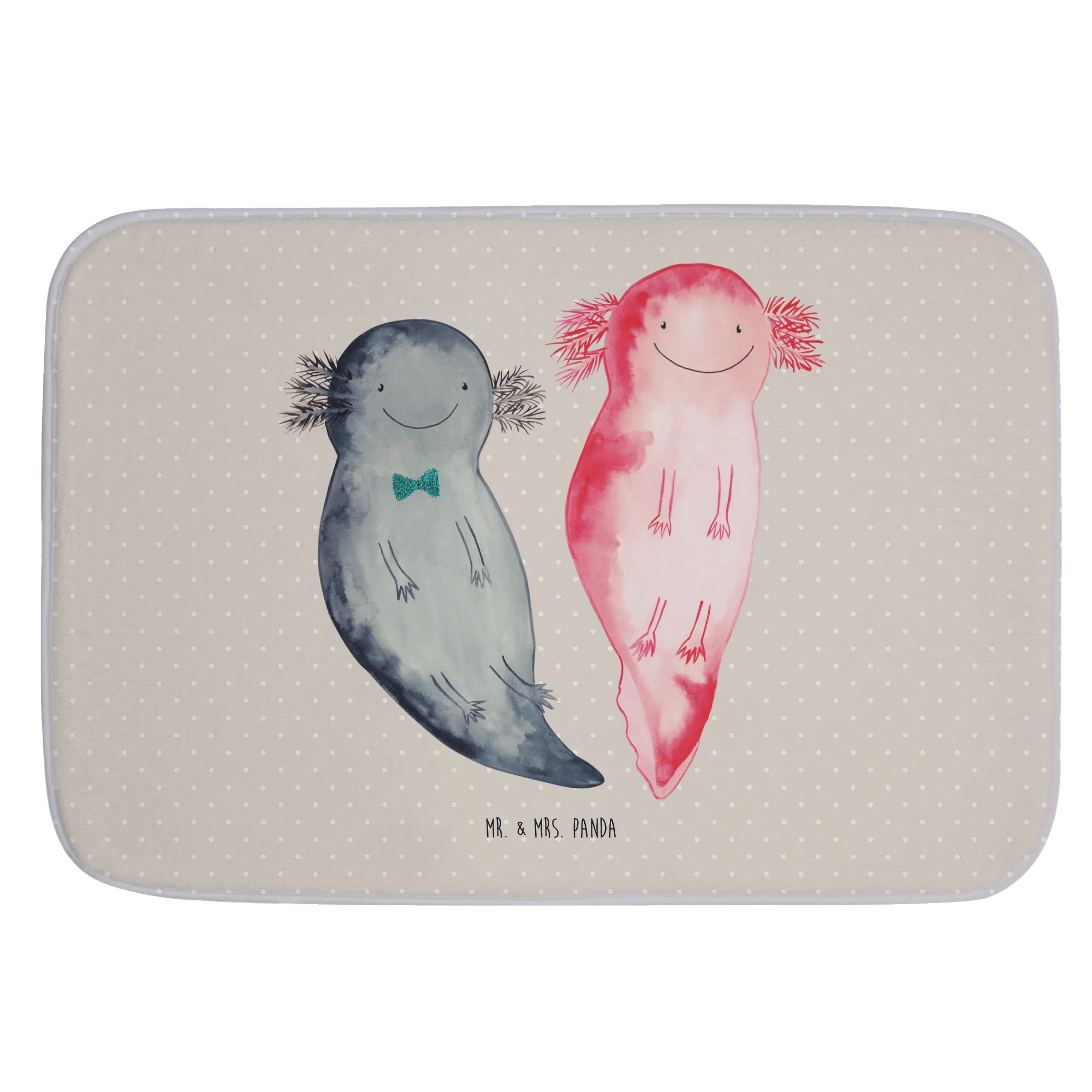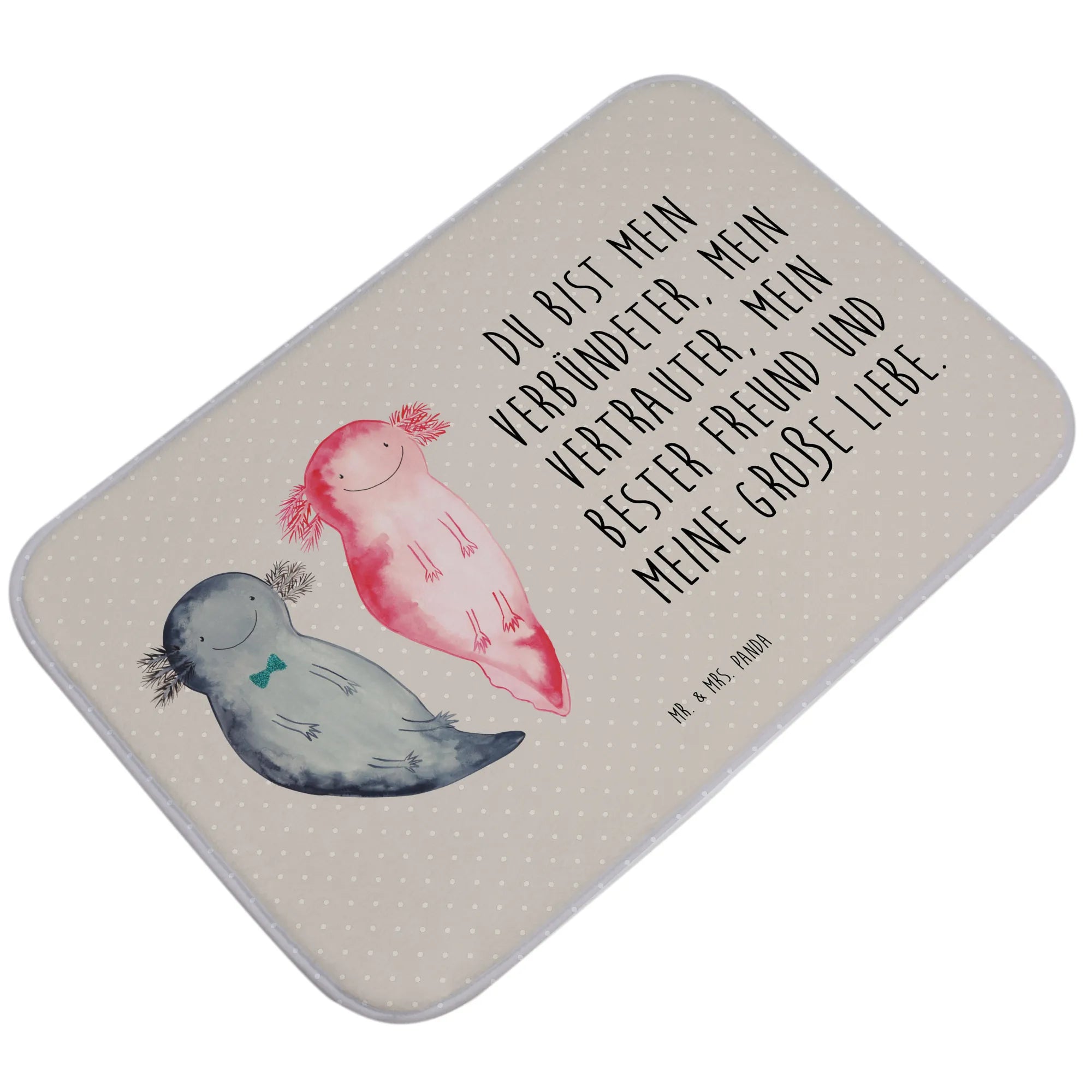 Der Badvorleger Axolotl Axel+Lotte von Mr. & Mrs. Panda ist das perfekte Wohnaccessoire für dein Badezimmer. Mit zwei niedlichen Axolotl, die fröhlich Seite an Seite schwimmen, bringt dieser Badteppich einen Hauch von Unterwasserwelt in dein Bad. Die liebevolle Aquarellzeichnung und die harmonische Farbgebung in pastelligen Tönen sorgen für eine angenehme Optik und schaffen eine entspannte Atmosphäre.