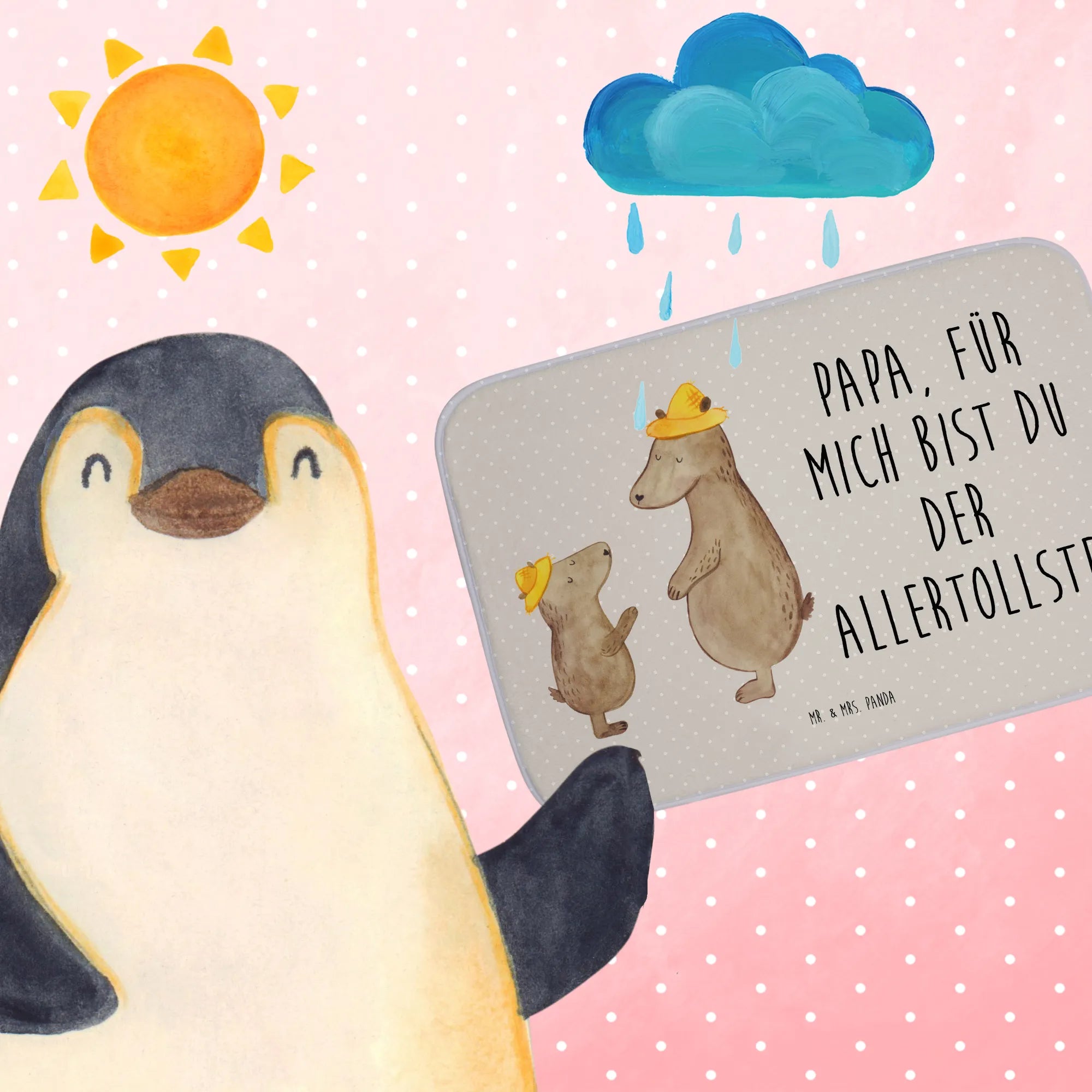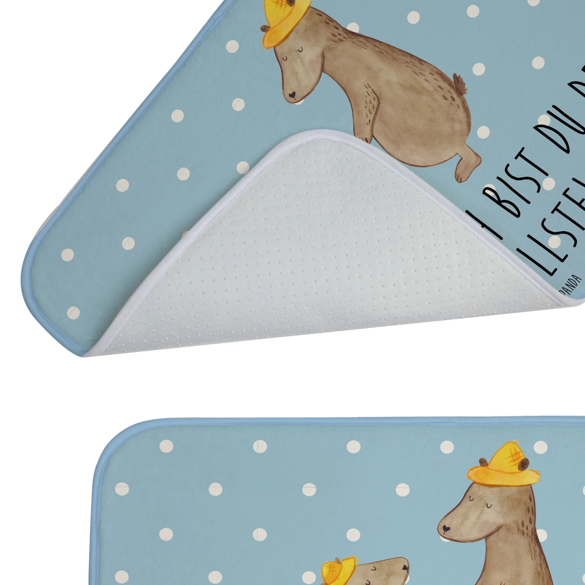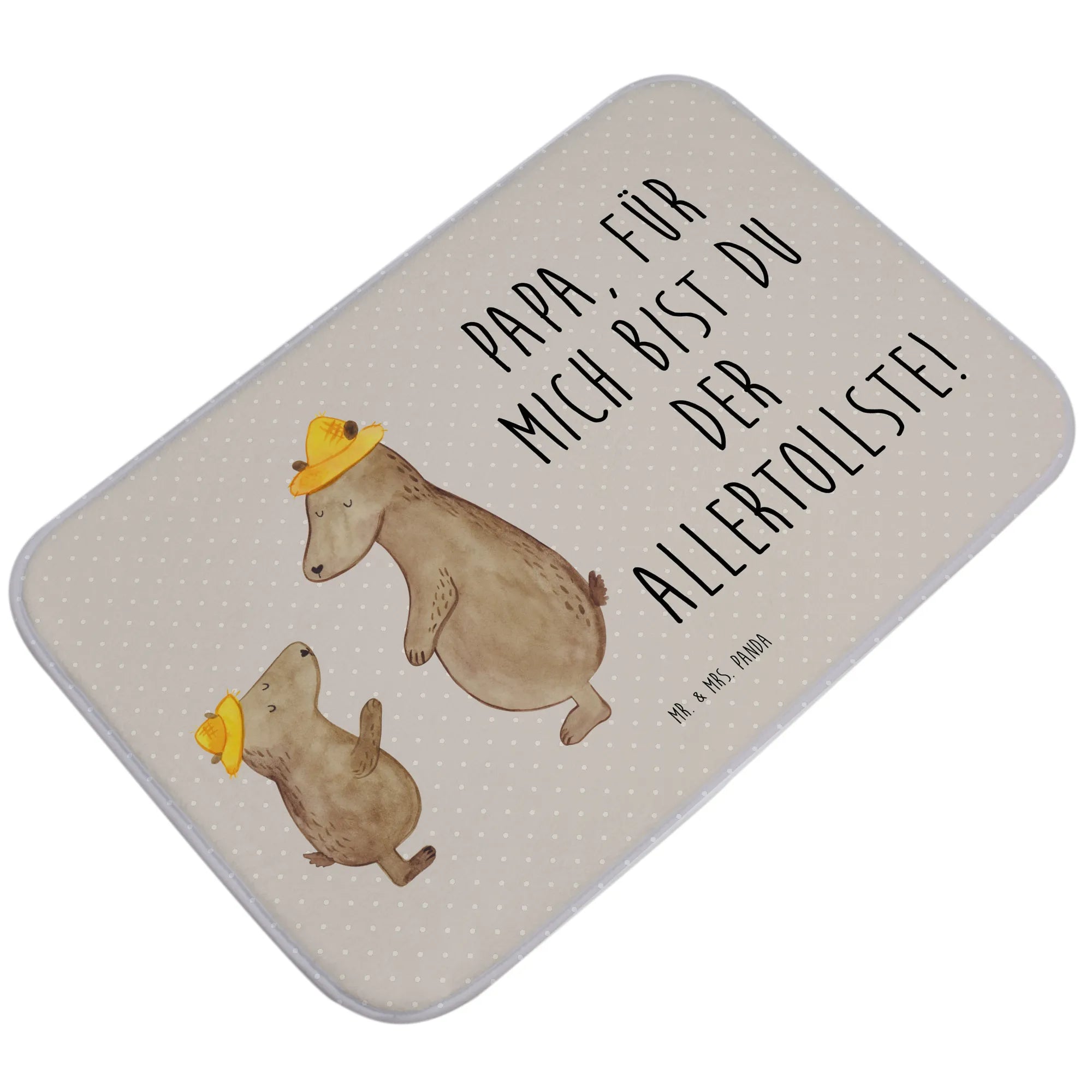 Unser Badvorleger mit dem bezaubernden Motiv der Bären mit Hut aus der Familienkollektion von Mr. & Mrs. Panda ist das perfekte Geschenk für jeden besonderen Anlass! Egal ob für den Vatertag, den Muttertag oder einfach nur, um deinem Lieblingsmenschen zu zeigen, wie viel er dir bedeutet – dieser Duschvorleger bringt Freude und Wärme in jedes Badezimmer. Die süßen Bären stehen für eine liebevolle Beziehung zwischen Papa und Sohn oder zwischen Geschwistern, und mit dem liebevollen Slogan 'Papa, für mich bist du der Allertollste!' zeigst du deinem Vater, wie wertvoll er für dich ist. Das Design ist nicht nur gelungen, sondern versprüht auch eine heitere und gemütliche Atmosphäre.