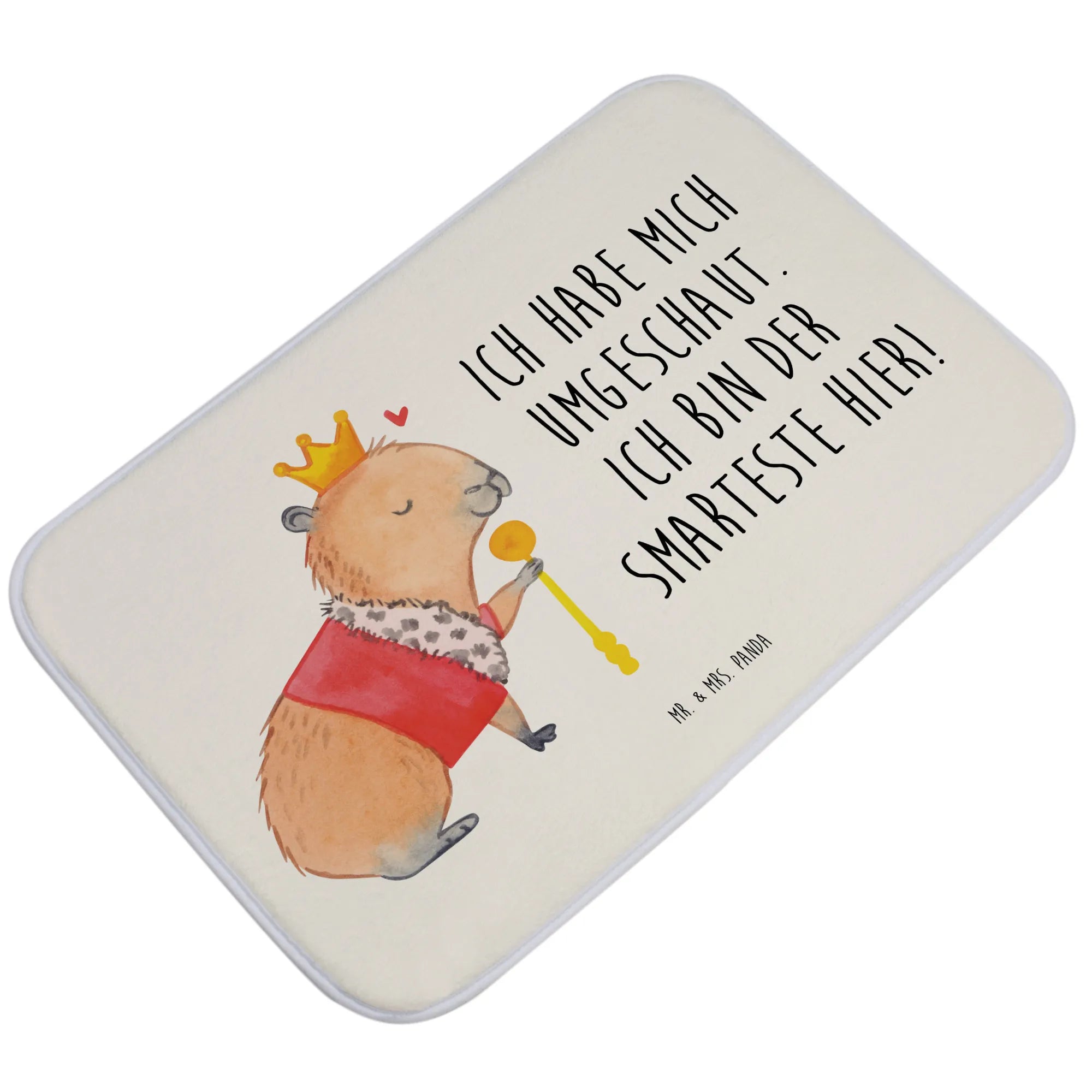 Das liebevoll handgezeichnete Design von Mrs. Panda zeigt das fröhliche Capybara in königlicher Robe mit einer goldenen Krone. Mit der Botschaft 'Ich habe mich umgeschaut. Ich bin der Smarteste hier!' gibt dieser Badvorleger Deinem Badezimmer das gewisse Etwas.