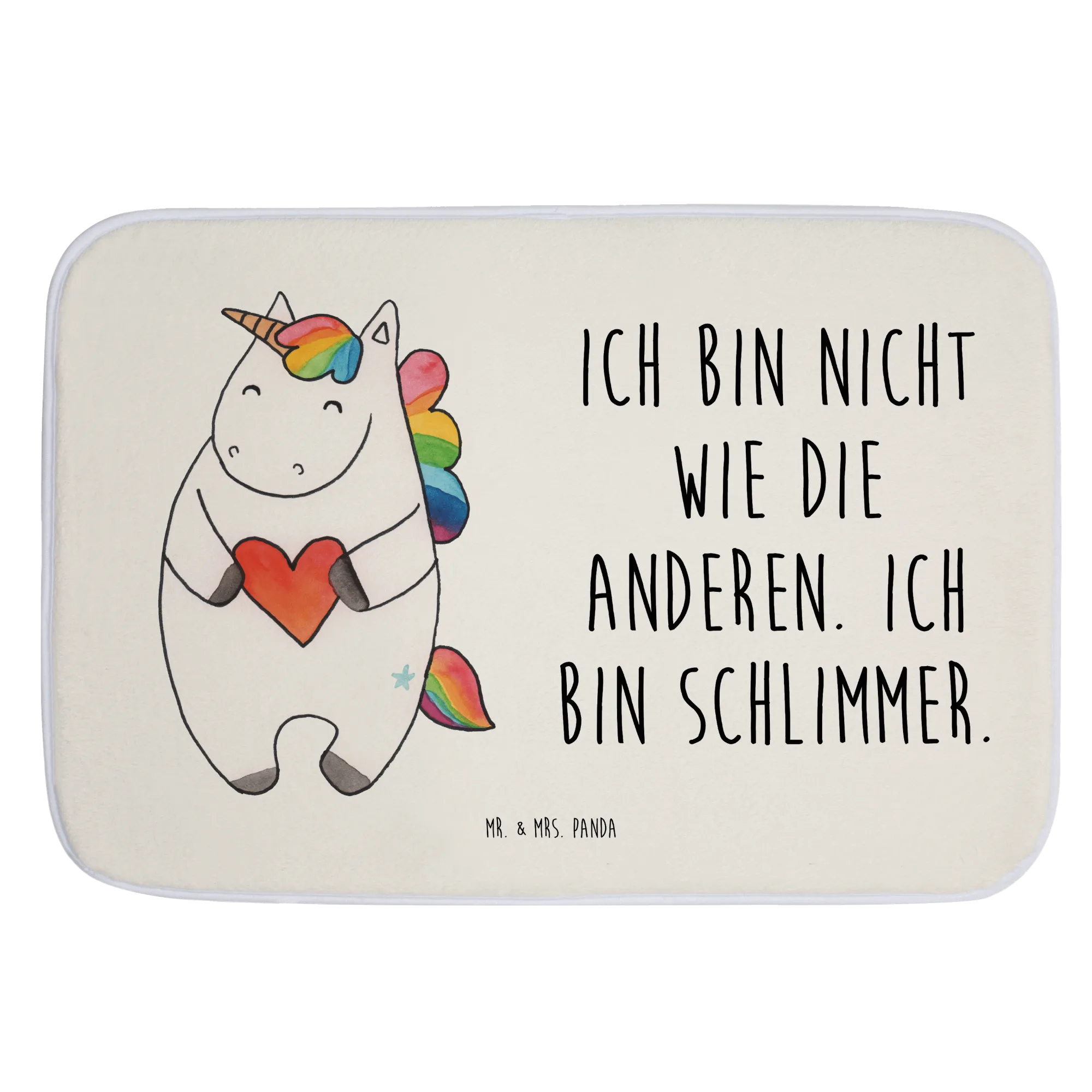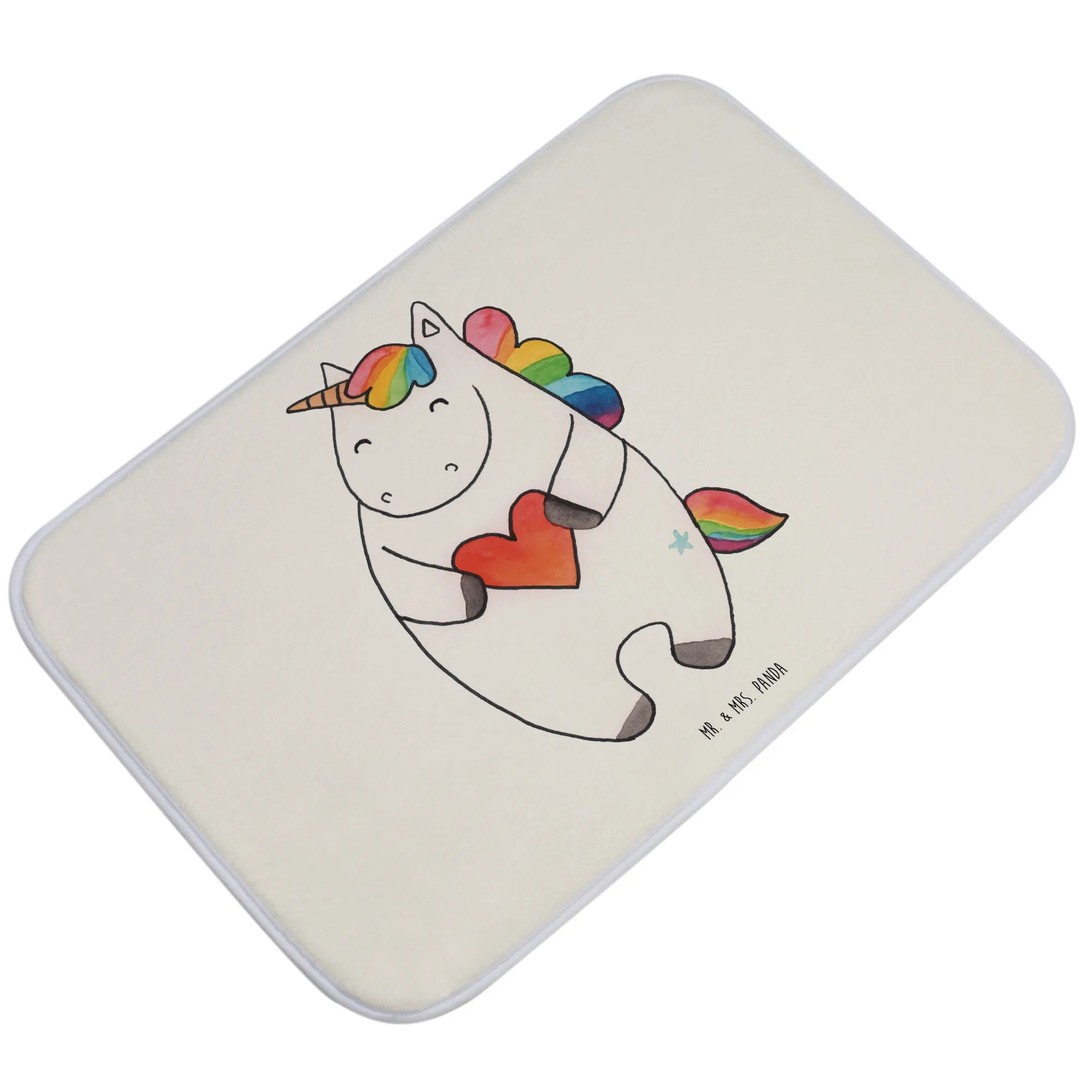 Wenn du auf der Suche nach dem perfekten Geschenk für eine besondere Freundin oder einfach einen tollen Farbtupfer für dein eigenes Badezimmer bist, dann ist unser Badvorleger Einhorn Herz aus der zauberhaften Einhorn - Kollektion genau das Richtige für dich! Dieser wunderschöne Badteppich besticht durch das süße Einhorn-Motiv, das freundlich ein Herz in der Hand hält und mit seiner Lebensfreude das Badezimmer zum Strahlen bringt. Die charmante Illustration wurde liebevoll von Mrs. Panda handgezeichnet und verleiht deinem Badezimmer einen einzigartigen und farbenfrohen Look.