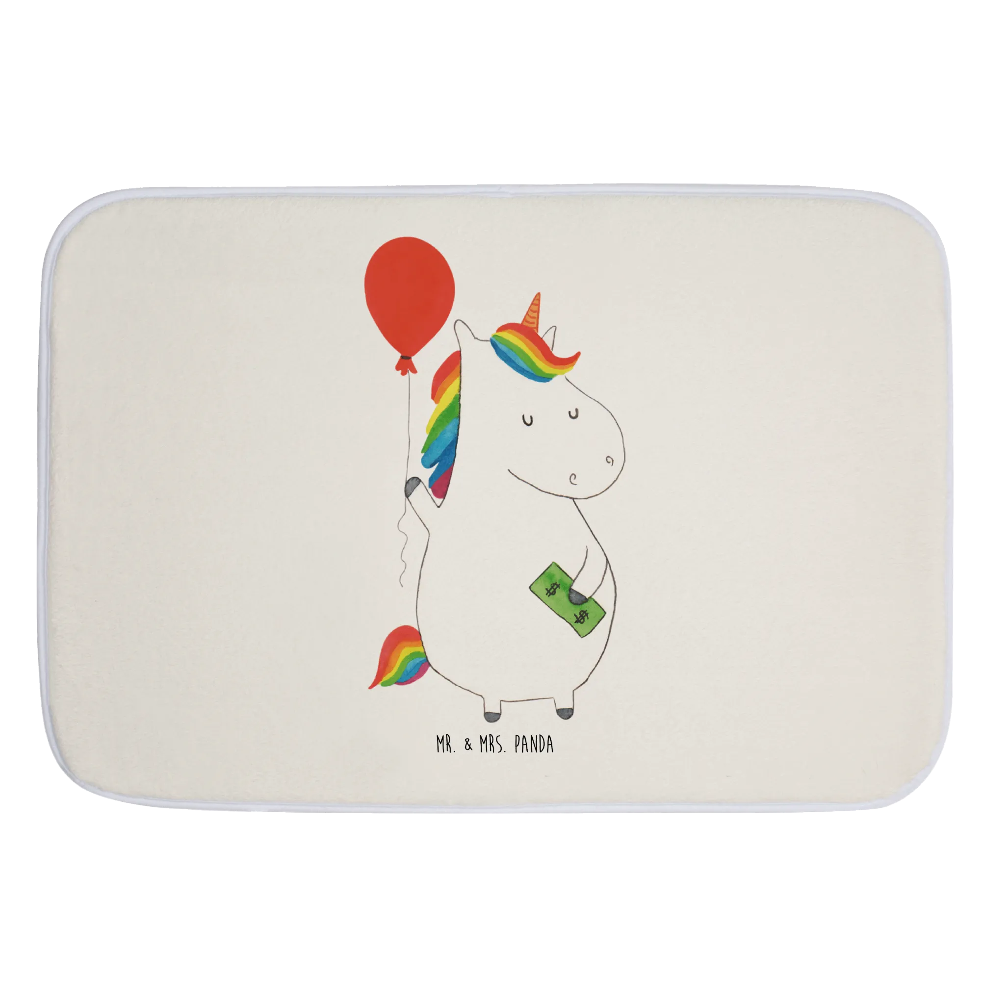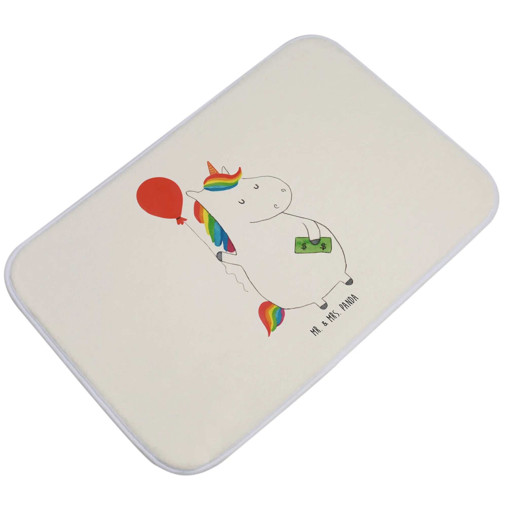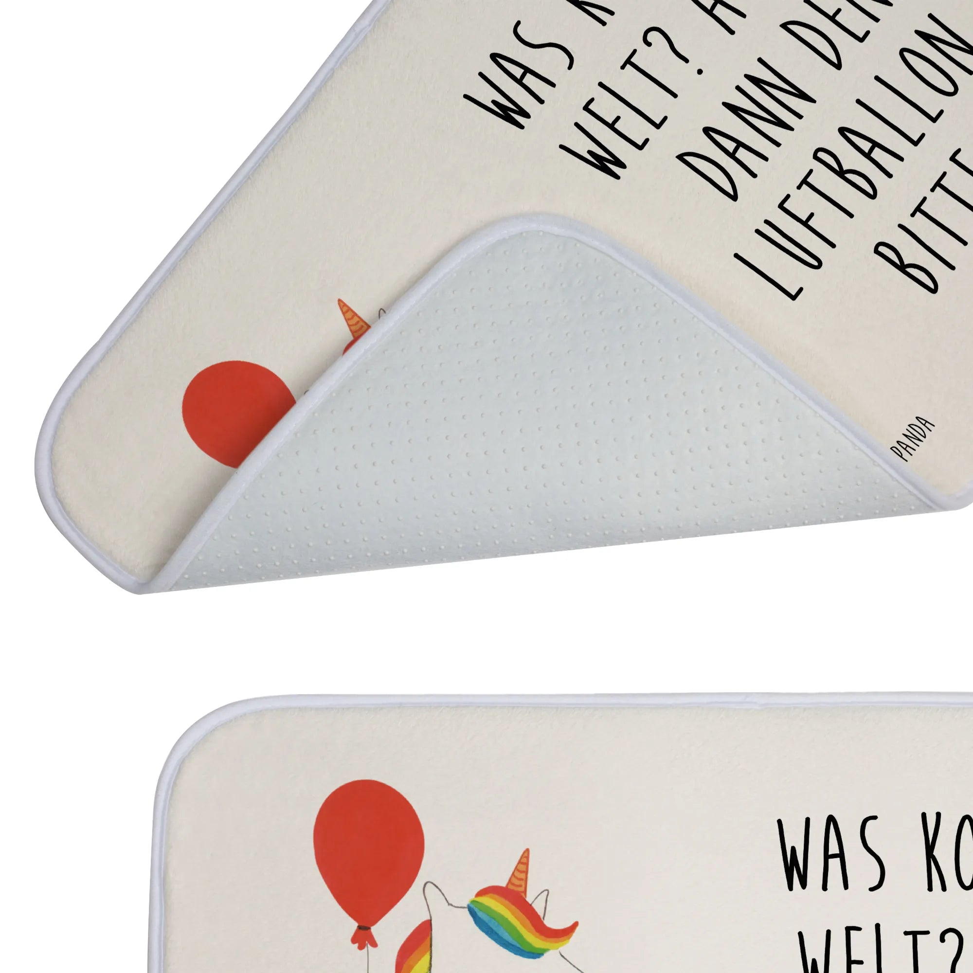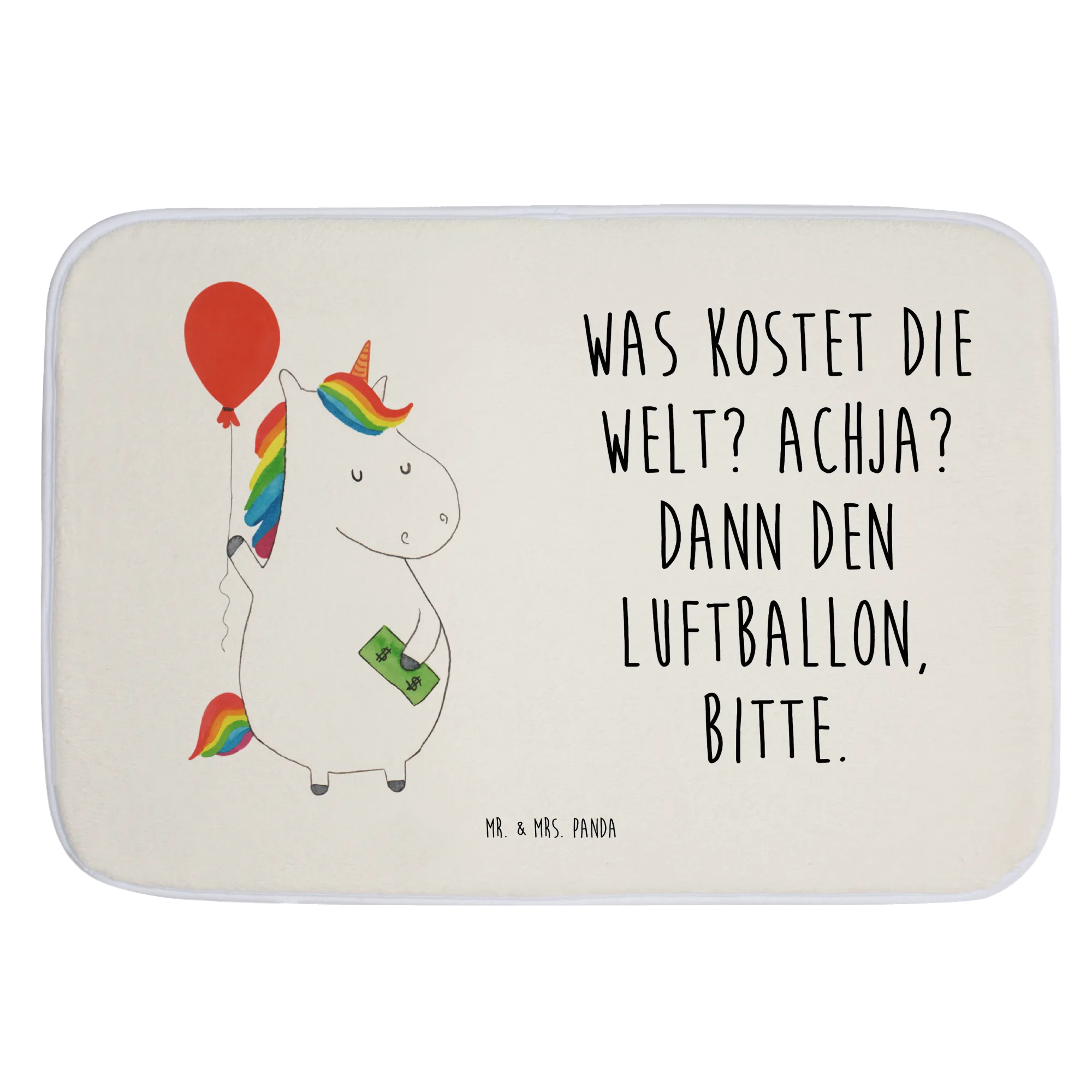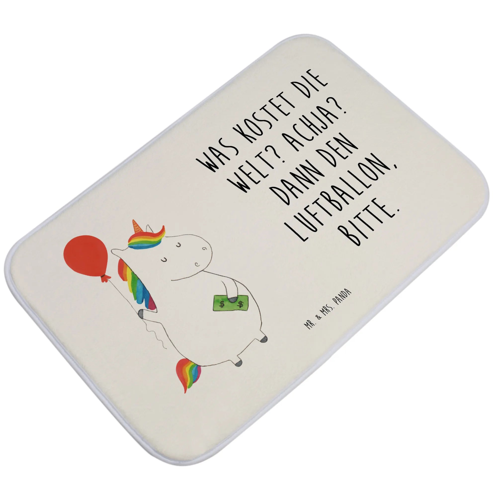 Willkommen in der zauberhaften Welt von Mr. & Mrs. Panda! Unser Badvorleger mit dem süßen Einhorn und dem fröhlichen Luftballon ist nicht nur ein echter Hingucker in deinem Badezimmer, sondern auch ein tolles Geschenk für alle Einhornliebhaber. Die liebevoll handgezeichnete Grafik zeigt ein knuffiges Einhorn, das mit einem Luftballon spielt, während es gleichzeitig den Spruch "Was kostet die Welt? Achja? Dann den Luftballon, bitte." präsentiert. Dieser Badvorleger mit den Maßen 590 mm x 400 mm sorgt dafür, dass dein Badezimmer nicht nur schön aussieht, sondern auch ausrutschsicher ist.