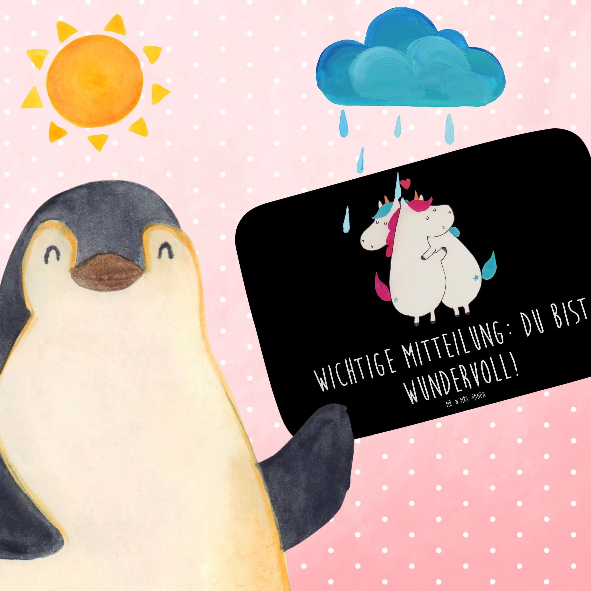 Das Motiv mit den zwei Einhörnern, die sich innig umarmen, strahlt Liebe und Freude aus. Der Spruch 'Wichtige Mitteilung: du bist wundervoll!' bringt die Essenz der Zuneigung perfekt auf den Punkt. Es ist nicht nur eine süße Darstellung für den Valentinstag, sondern auch eine schöne Erinnerung daran, jeden Tag die Liebe zu feiern. Die Einhörner, die für Hoffnung und Fantasie stehen, machen dieses Motiv besonders geeignet, um einem geliebten Menschen zu zeigen, wie wichtig er ist. Mr. und Mrs. Panda glauben, dass solche kleinen Kunstwerke unser Leben bereichern und uns daran erinnern, wie schön die Liebe wirklich ist.