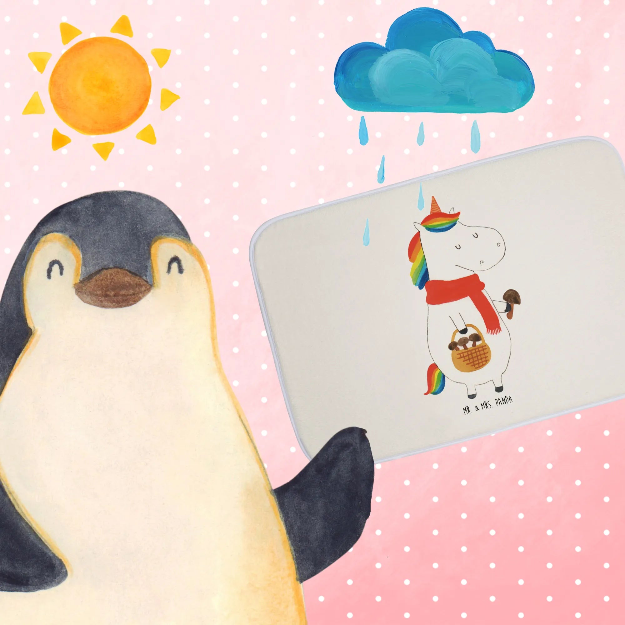 Der Badvorleger Einhorn Pilz von Mr. & Mrs. Panda ist der perfekte Begleiter für dein Badezimmer! Mit einem liebevoll handgezeichneten Motiv, das ein süßes Einhorn zeigt, das im Wald nach Pilzen sucht, bringt dieser Badteppich ein Stück Magie in deinen Alltag.