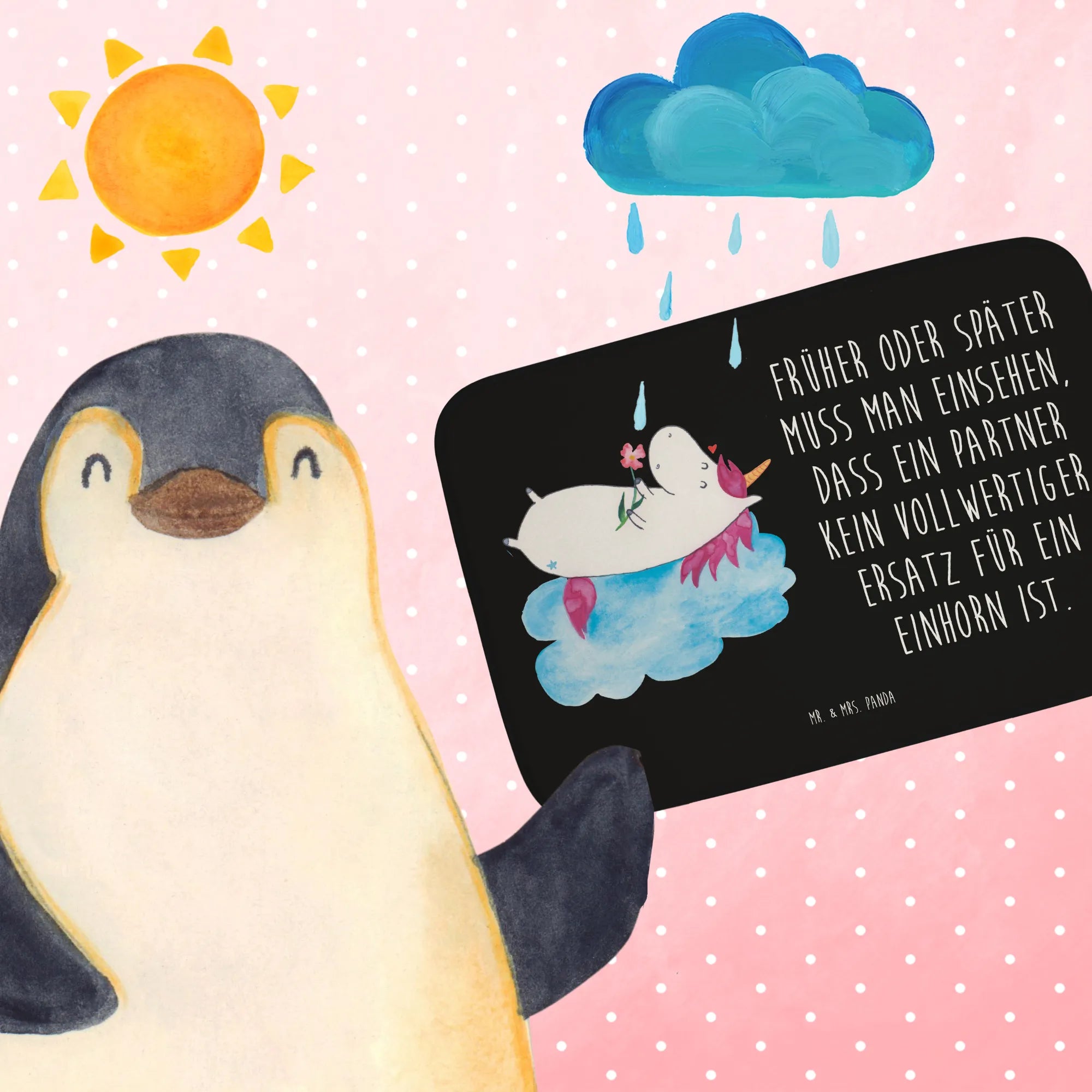 Hast du schon einmal von einem Einhorn gehört, das verliebt auf einer Wolke sitzt? In unserem liebenswerten Motiv von Mr. & Mrs. Panda wird dieser Traum Realität. Es zeigt, wie Liebe und Fantasie Hand in Hand gehen können. Mit dem zauberhaften Spruch 'Früher oder später muss man einsehen, dass ein Partner kein vollwertiger Ersatz für ein Einhorn ist,' bringen wir zum Ausdruck, dass es manchmal eine Herausforderung ist, die wahre Bedeutung der Liebe zu verstehen. Einhörner repräsentieren nicht nur das Besondere, sondern auch die Wünsche, die wir in unseren Herzen tragen. Wenn du dieses Motiv betrachtest, lass dich inspirieren, die Liebe um dich herum zu finden und zu schätzen. Jedes Stück Zauber, das du entdeckst, wird dich dichter an die Magie der Liebe bringen.