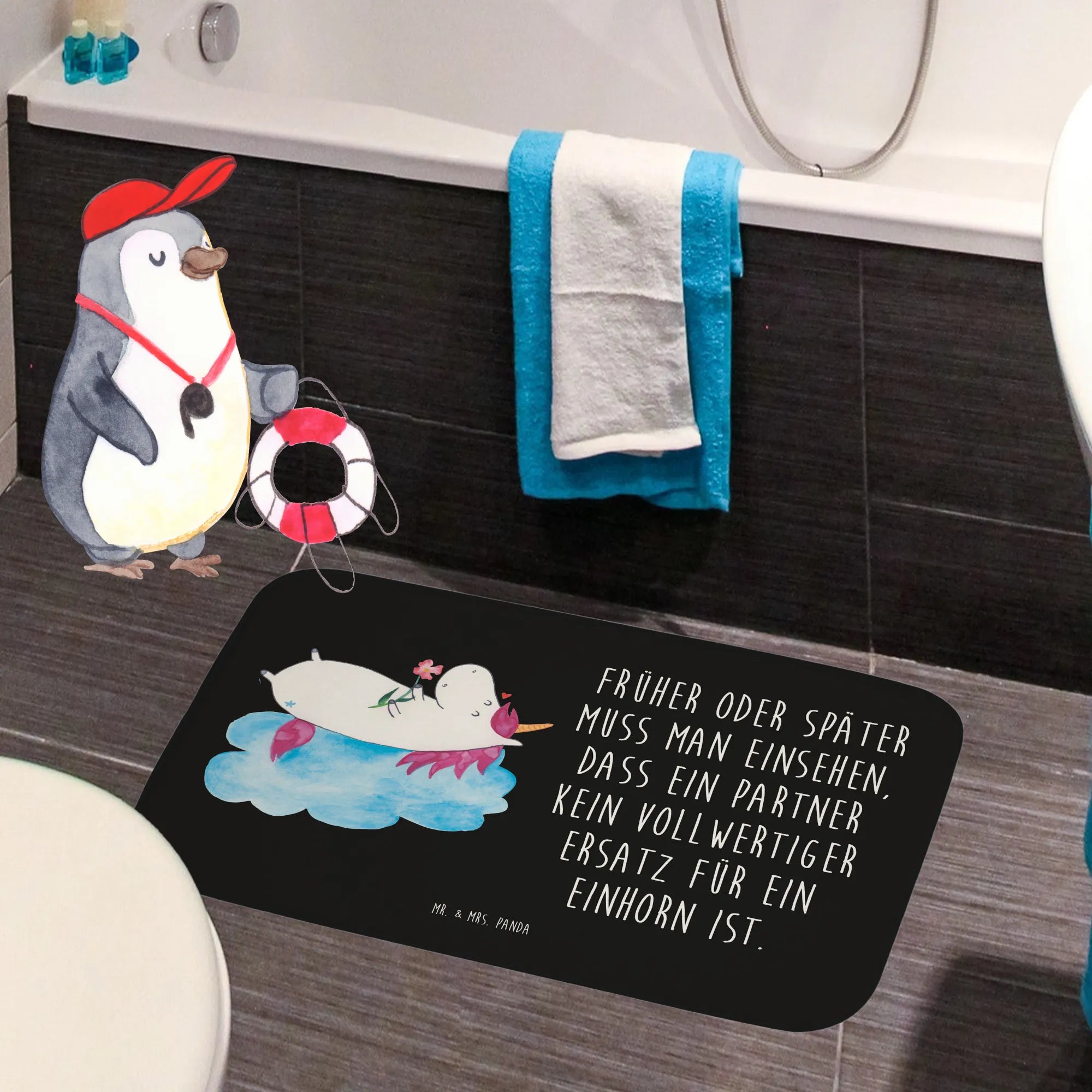 Verleih deinem Badezimmer mit dem Badvorleger von Mr. & Mrs. Panda eine ganz besondere Note! Mit einer Größe von 590 mm x 400 mm ist dieser Badvorleger perfekt für jedes Badezimmer. Hergestellt aus flauschiger Premium Kunstfaser, bietet er ein unglaublich angenehmes Gefühl bei jedem Schritt. Die Antirutsch-Gummibeschichtung gewährleistet Sicherheit und verhindert Ausrutschen. Ob mit motivierenden Sprüchen oder süßen Designs bedruckt – dieser Badvorleger bringt Freude und Stil in dein Zuhause. Zudem ist er besonders saugstark, sodass er Flüssigkeiten schnell aufnimmt. Und die Pflege ist einfach: bei 30°C in der Waschmaschine waschbar, bleibt der Badvorleger immer frisch und einladend!