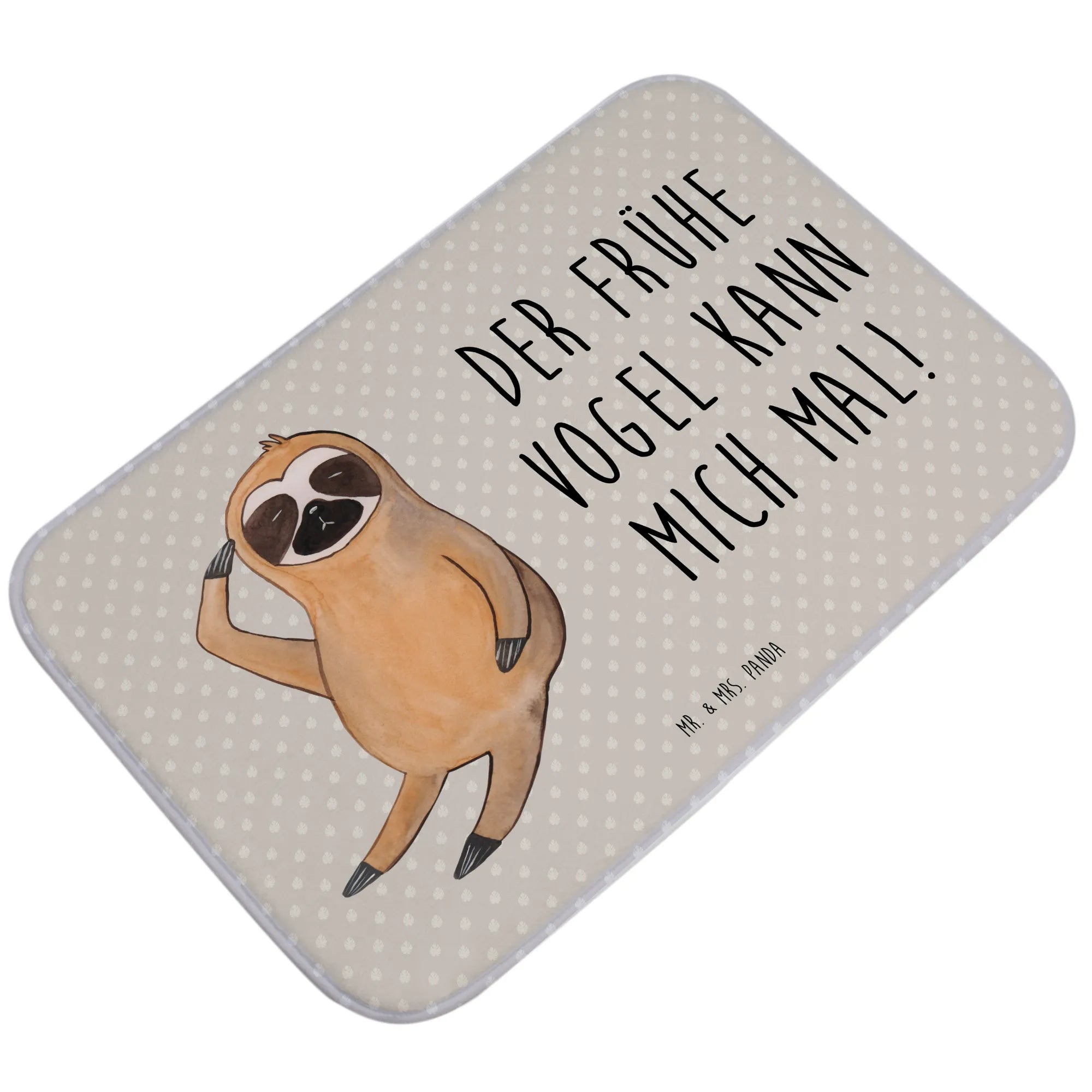 Die Maße von 590 mm x 400 mm sind ideal, um in jeden Badbereich zu passen und die flauschige Premium-Kunstfaser sorgt für eine tolle Haptik. Mit seiner besonderen Saugkraft und der Anti-Rutsch Gummibeschichtung ist die Badmatte nicht nur stylisch, sondern auch extrem praktisch. Du musst dir keine Sorgen machen, dass du beim Aussteigen aus der Dusche ausrutschen könntest! Das Faultier-Motiv, begleitet von dem humorvollen Slogan 'Der frühe Vogel kann mich mal!', ist perfekt für alle Morgenmuffel und Nicht-Frühaufsteher.