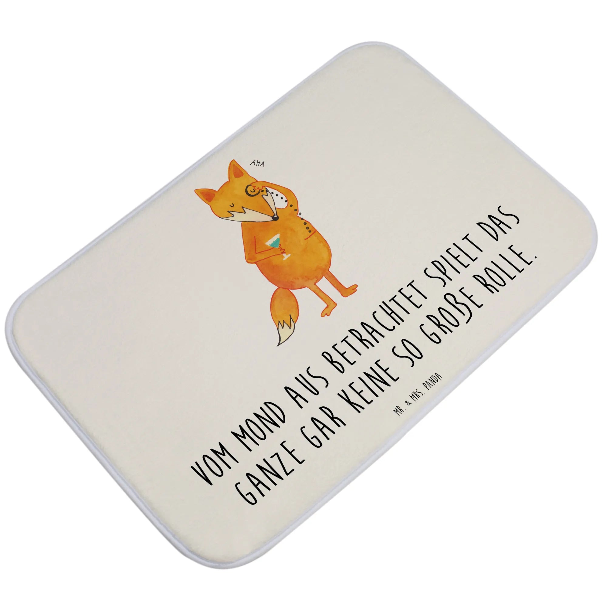 Die Oberseite dieser Badematte besteht aus einer besonders flauschigen Premium-Kunstfaser, die nicht nur angenehm unter den Füßen ist, sondern auch dafür sorgt, dass dein Badezimmer toll aussieht. Die außergewöhnliche Illustration des stattlichen Füchses mit Monokel ist farbenfroh und handgezeichnet. Das Design ist nicht nur niedlich, sondern auch ein echtes Highlight für jedes Badezimmer. Der Spruch "Vom Mond aus betrachtet spielt das Ganze gar keine so große Rolle" sorgt zudem für einen humorvollen Touch.