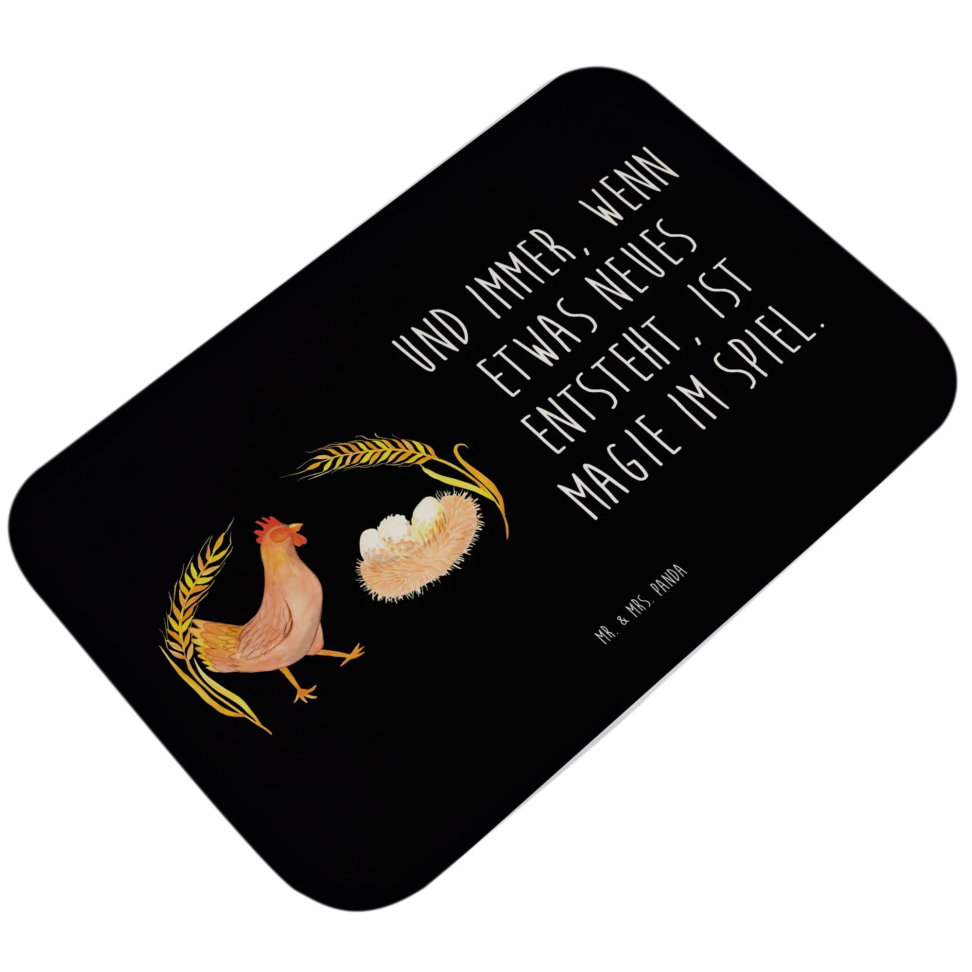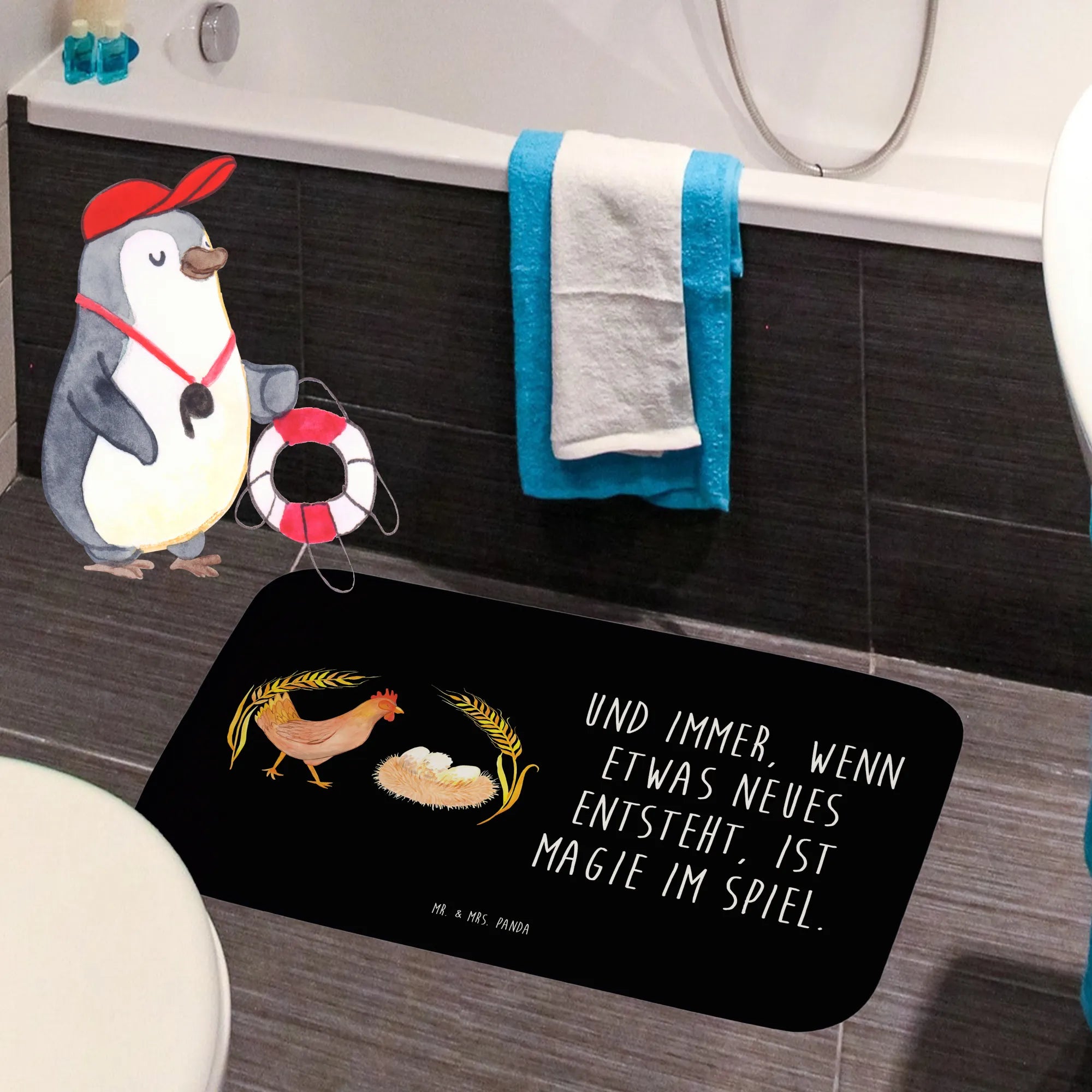 Das niedliche Motiv von Berta Henne, die stolz durch die Gegend stolzieren, kombiniert mit dem inspirierenden Spruch "Und immer, wenn etwas Neues entsteht, ist Magie im Spiel." bringt eine magische Note in dein Badezimmer. Diese Botschaft strahlt Positivität und Lebensfreude aus und macht diesen Badvorleger zu einem wunderbaren Geschenk für werdende Mütter, Hausbesitzer, oder einfach für dich selbst.