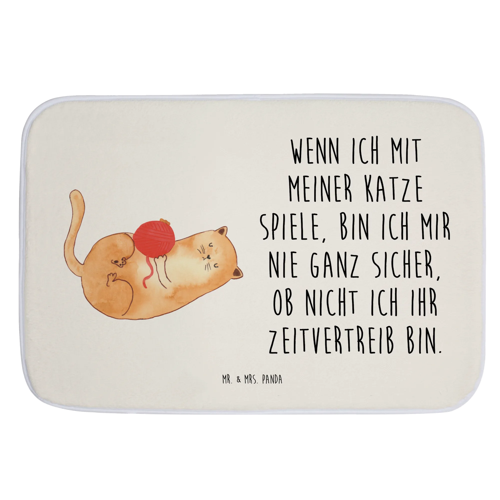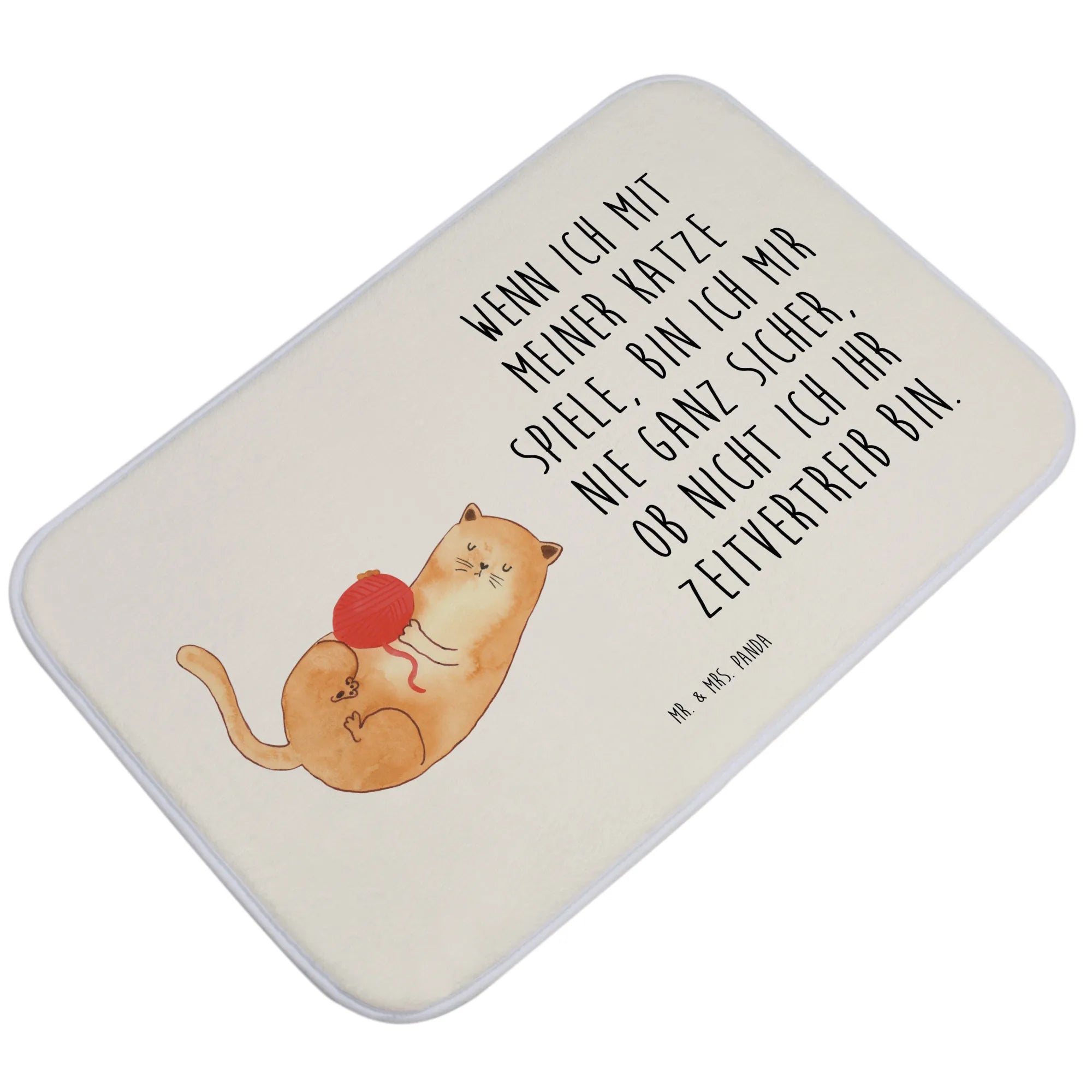 Zauber dein Badezimmer in eine kleine Wohlfühloase für Katzenfans: Unsere flauschige Badematte mit dem handgezeichneten Katzenmotiv zeigt eine süße Mietze, die begeistert mit ihrem Wollknäul spielt. Der liebevoll gedruckte Spruch „Wenn ich mit meiner Katze spiele, bin ich mir nie ganz sicher, ob nicht ich ihr Zeitvertreib bin.“ macht diese Badezimmerdeko besonders charmant.