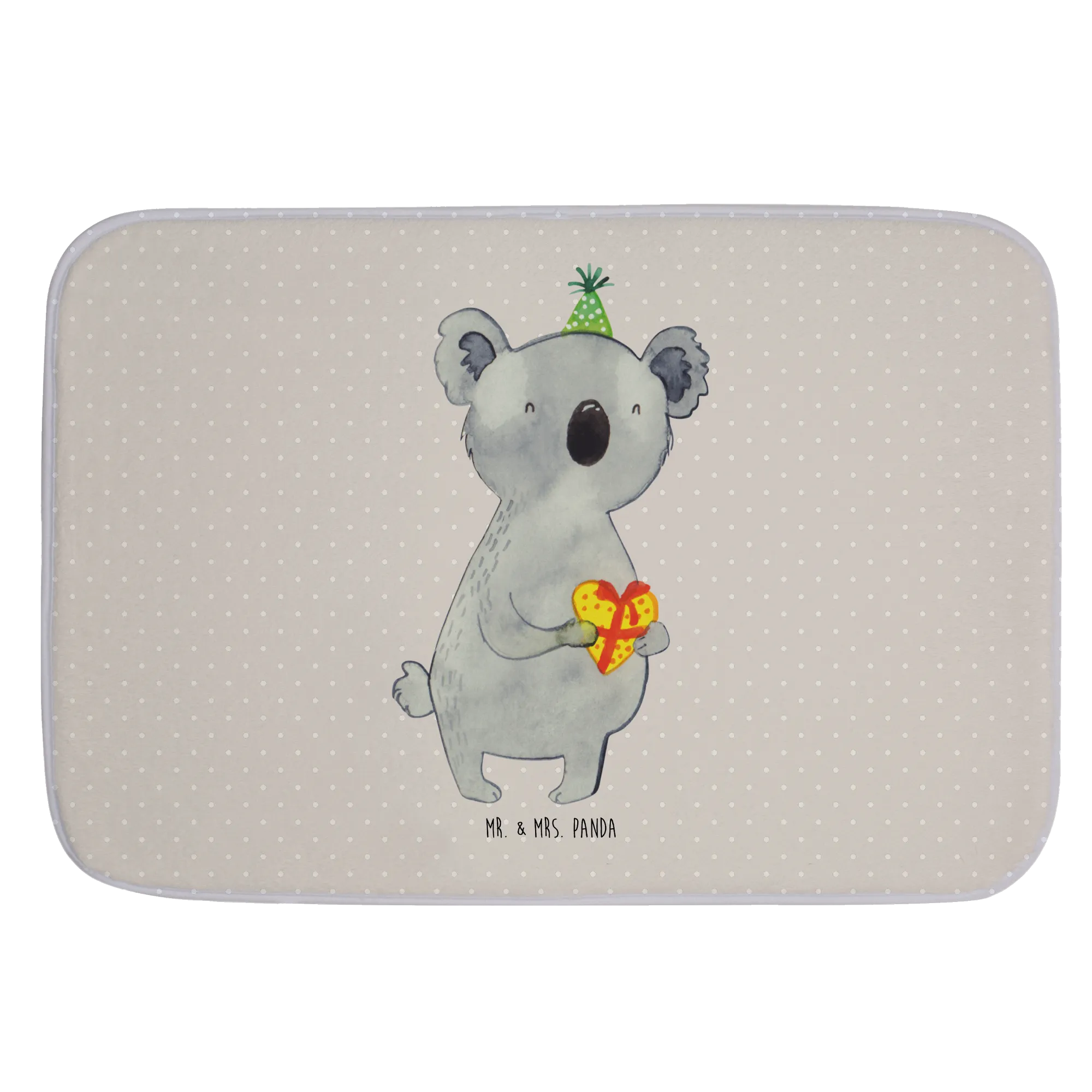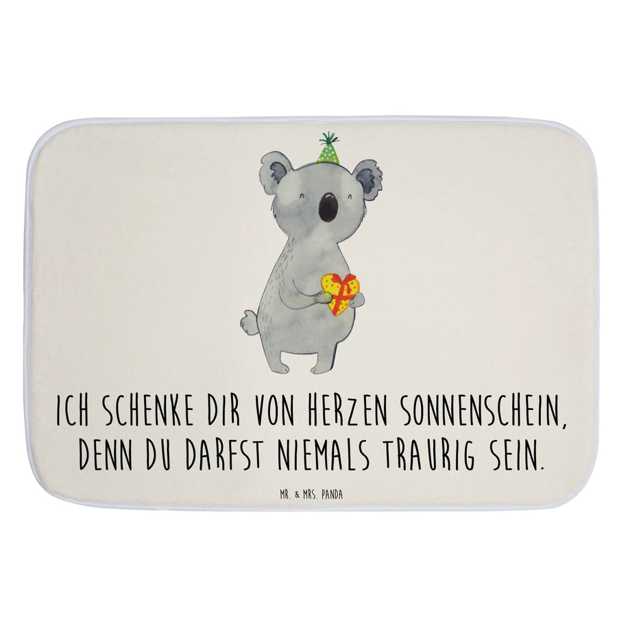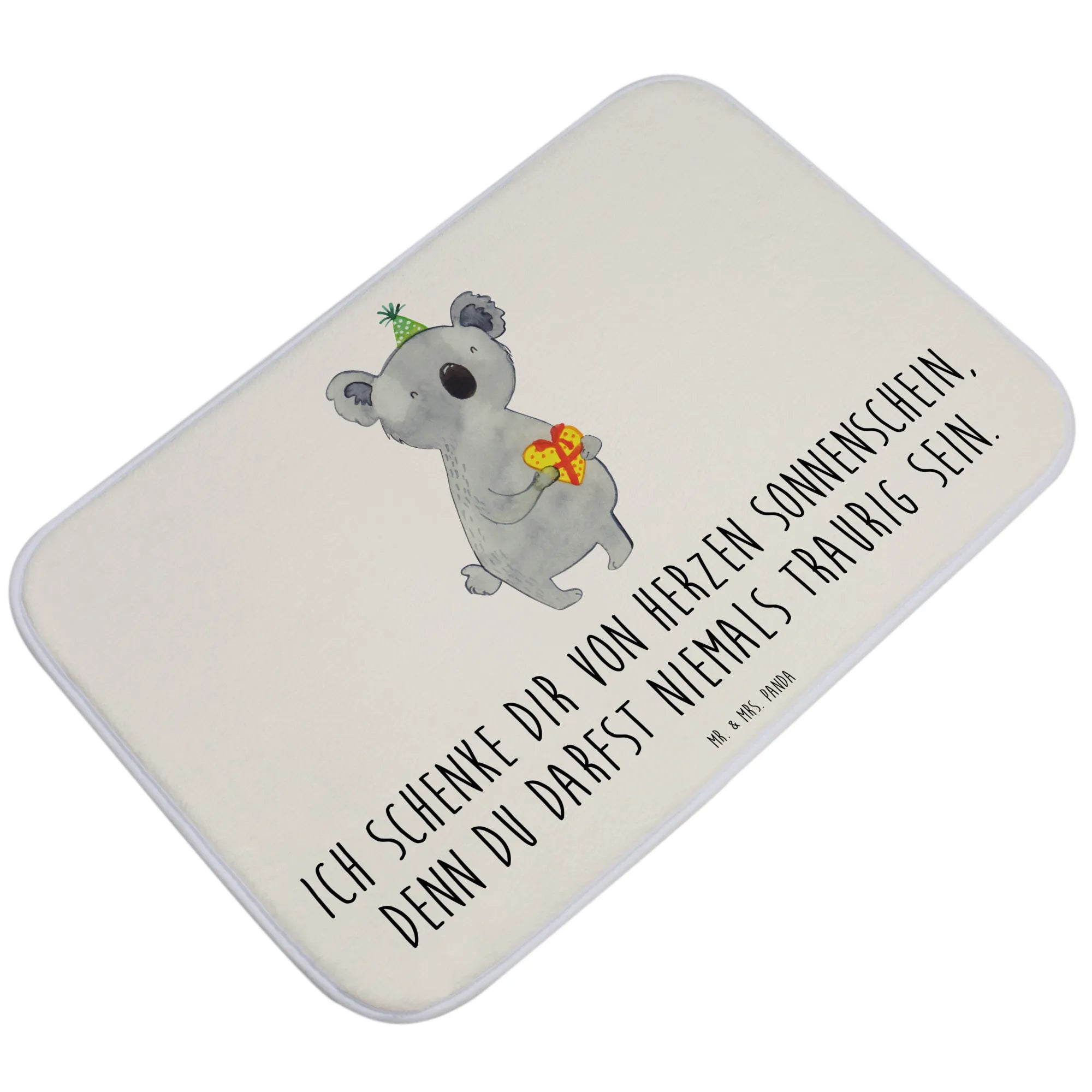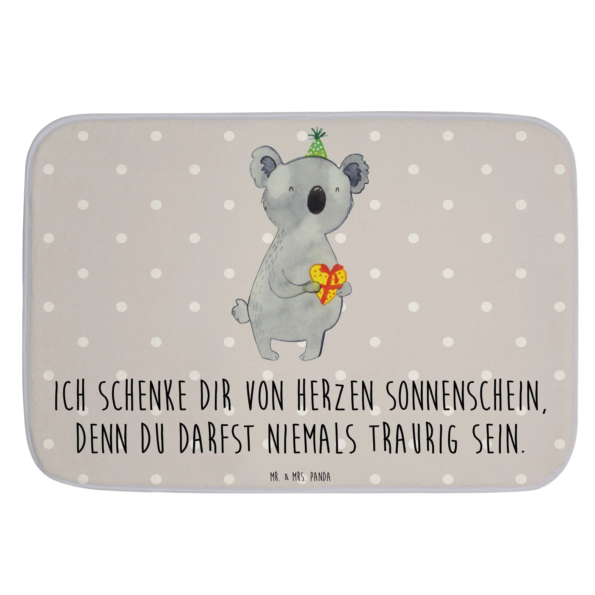 Der Badvorleger Koala Geschenk von Mr. & Mrs. Panda ist das perfekte Geschenk für jeden Anlass! Egal, ob zum Geburtstag, zur Einweihungsparty oder einfach nur, um jemandem eine Freude zu machen – dieser wunderschöne Badvorleger bringt nicht nur Farbe, sondern auch eine herzliche Botschaft in jedes Badezimmer. Mit dem niedlichen Koala-Motiv, das einen Partyhut trägt und ein herzförmiges Geschenk hält, zaubert er garantiert ein Lächeln in jedes Gesicht. Der Slogan 'Ich schenke dir von Herzen Sonnenschein, denn du darfst niemals traurig sein.' unterstreicht die liebevolle Botschaft und macht diesen Badteppich zu einem besonders persönlichen Geschenk.