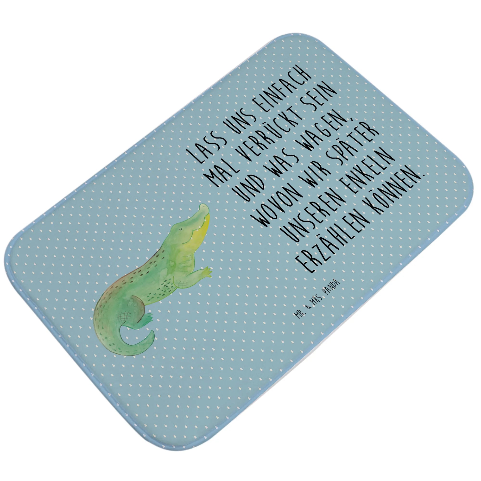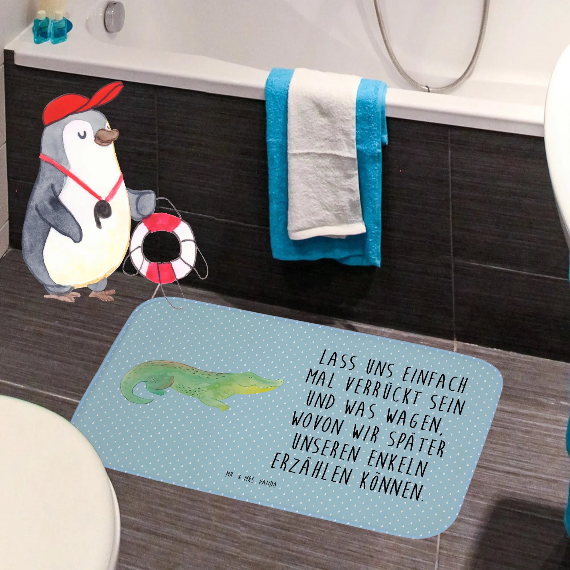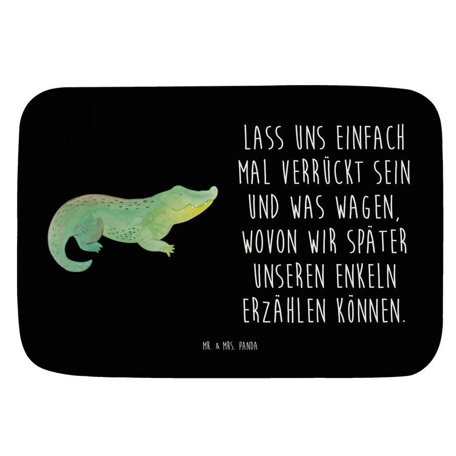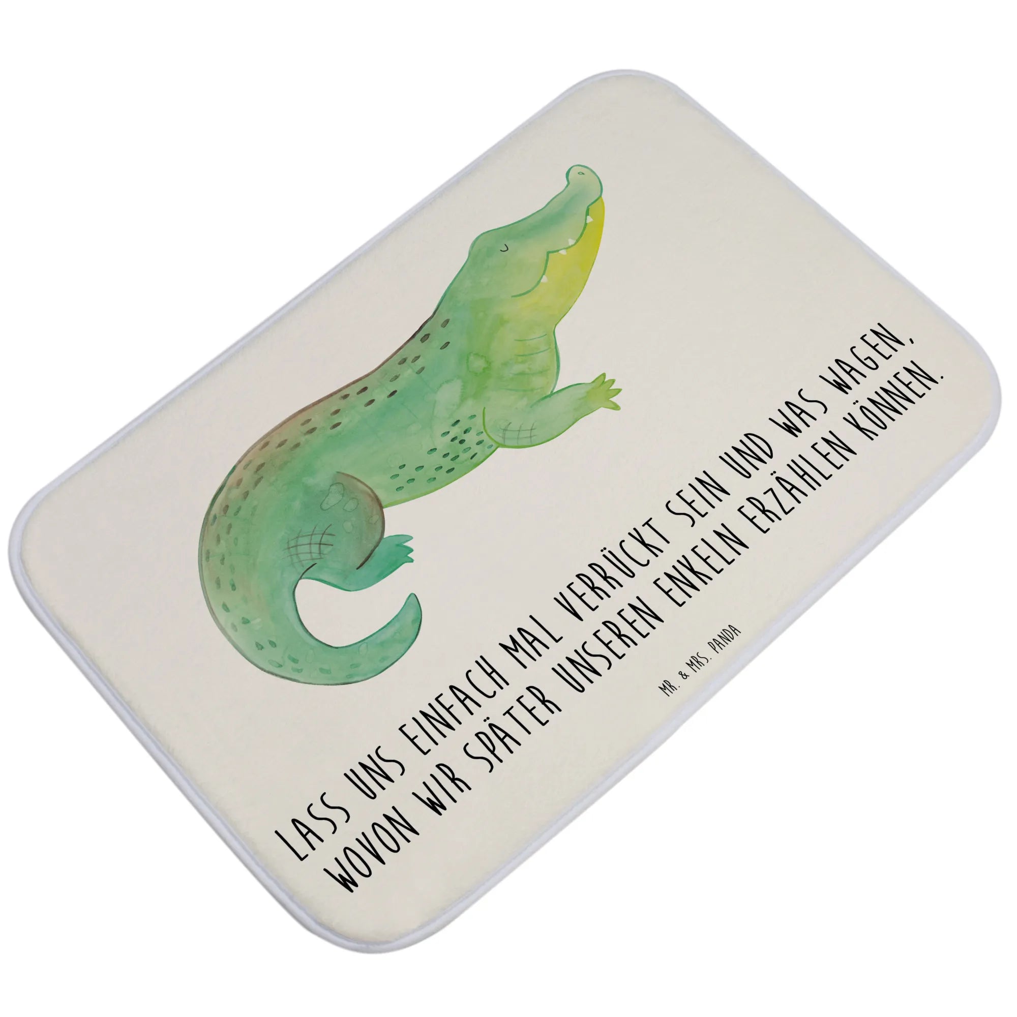 Der Badvorleger Krokodil von Mr. & Mrs. Panda ist nicht nur praktisch, sondern auch ein echter Hingucker in jedem Badezimmer! Mit seinem freundlichen Krokodil-Motiv in sanften Grün- und Blautönen zaubert er eine entspannte Atmosphäre und bringt eine Prise Abenteuerlust in deinen Alltag. Der Spruch 'Lass uns einfach mal verrückt sein und was wagen, wovon wir später unseren Enkeln erzählen können.' lädt dazu ein, das Leben in vollen Zügen zu genießen.