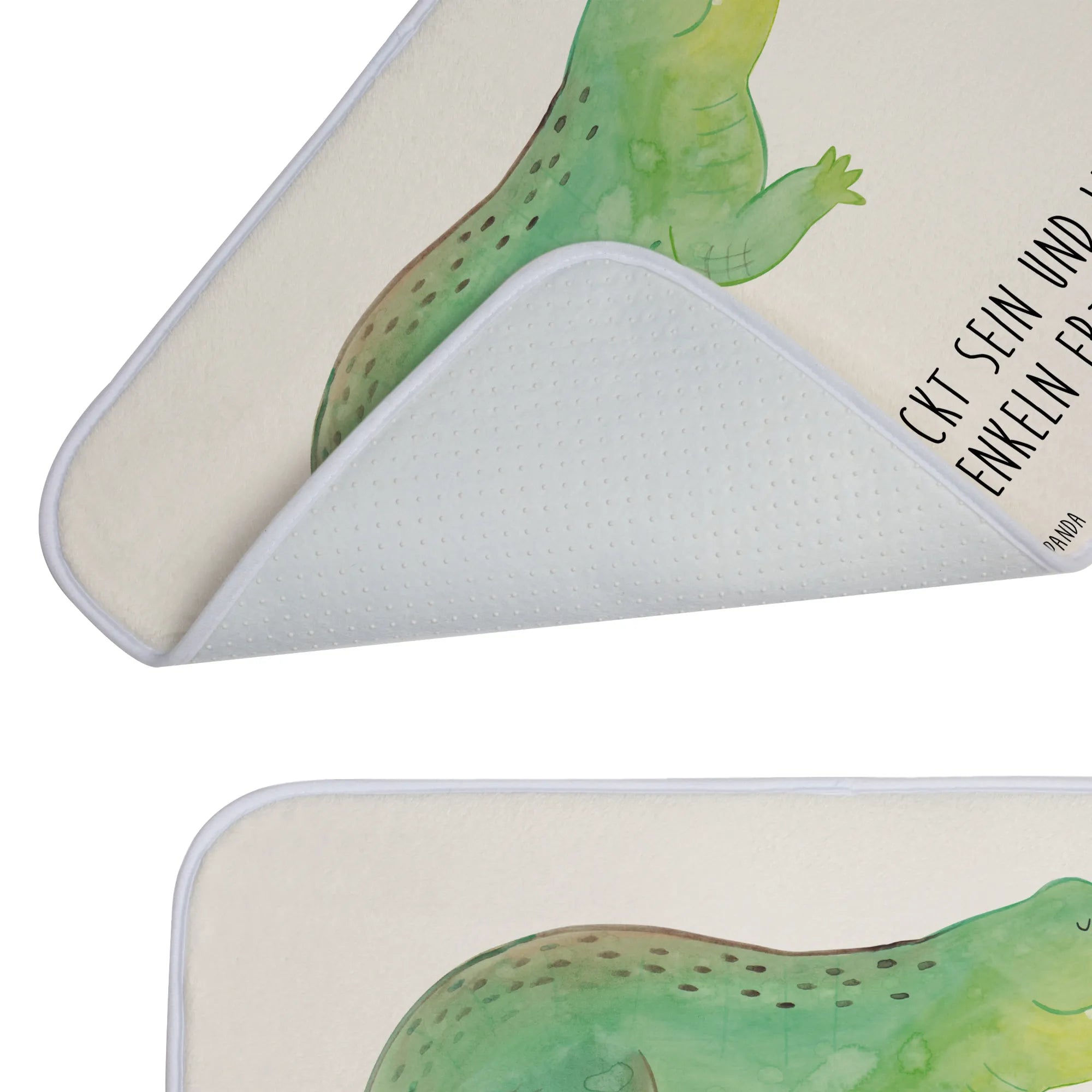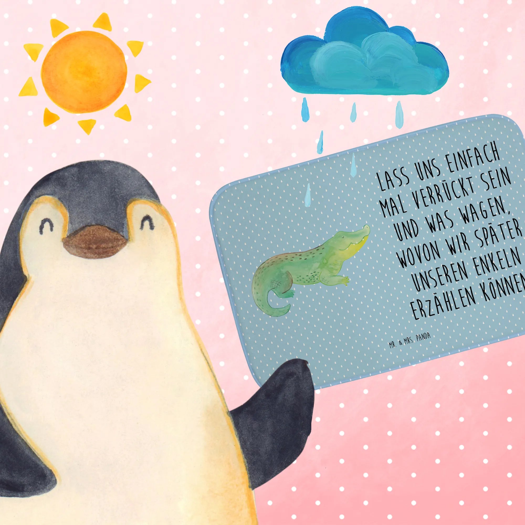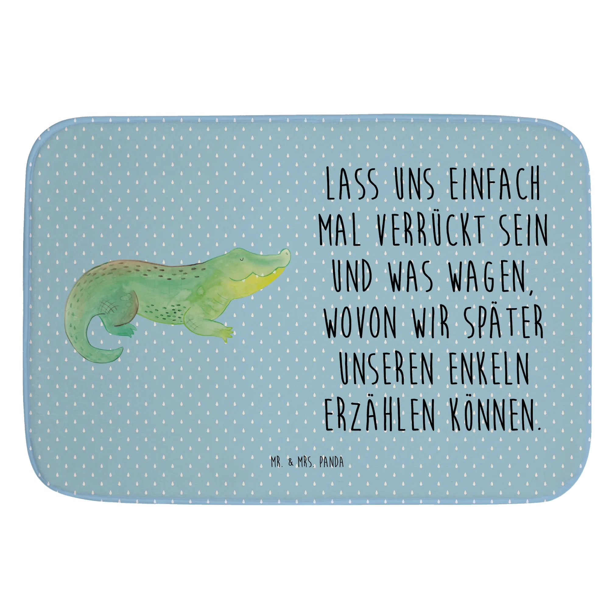 Der Badvorleger Krokodil von Mr. & Mrs. Panda ist nicht nur praktisch, sondern auch ein echter Hingucker in jedem Badezimmer! Mit seinem freundlichen Krokodil-Motiv in sanften Grün- und Blautönen zaubert er eine entspannte Atmosphäre und bringt eine Prise Abenteuerlust in deinen Alltag. Der Spruch 'Lass uns einfach mal verrückt sein und was wagen, wovon wir später unseren Enkeln erzählen können.' lädt dazu ein, das Leben in vollen Zügen zu genießen.