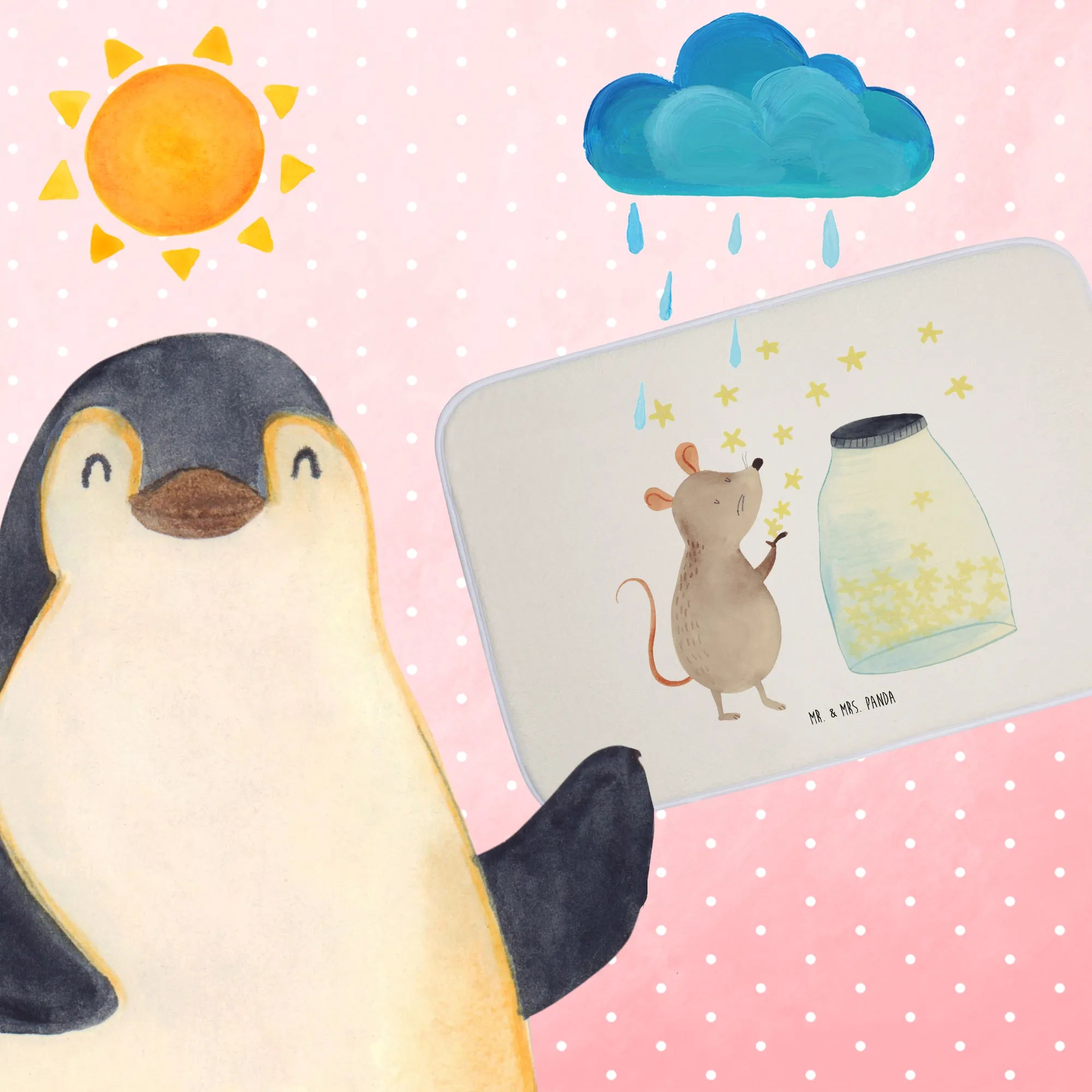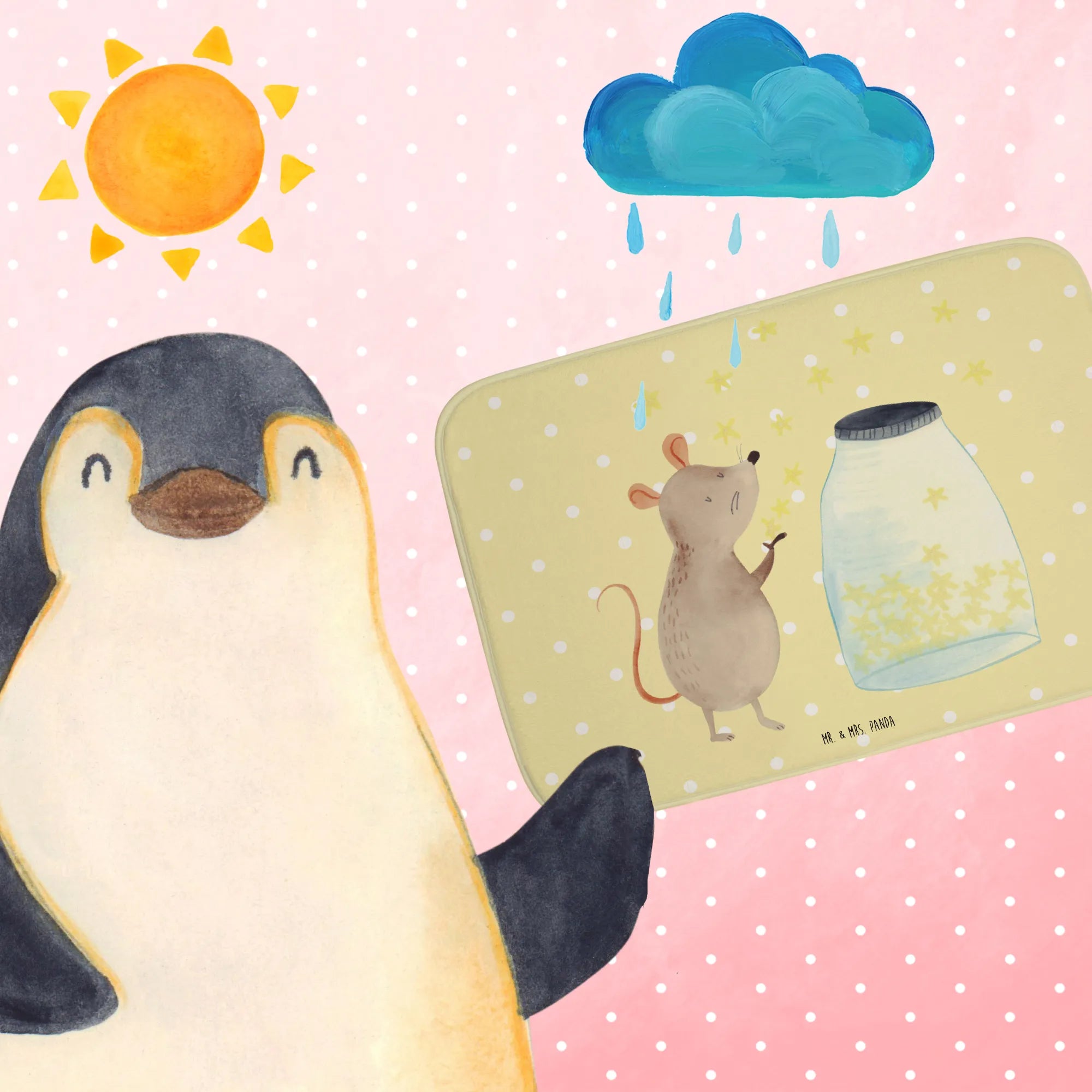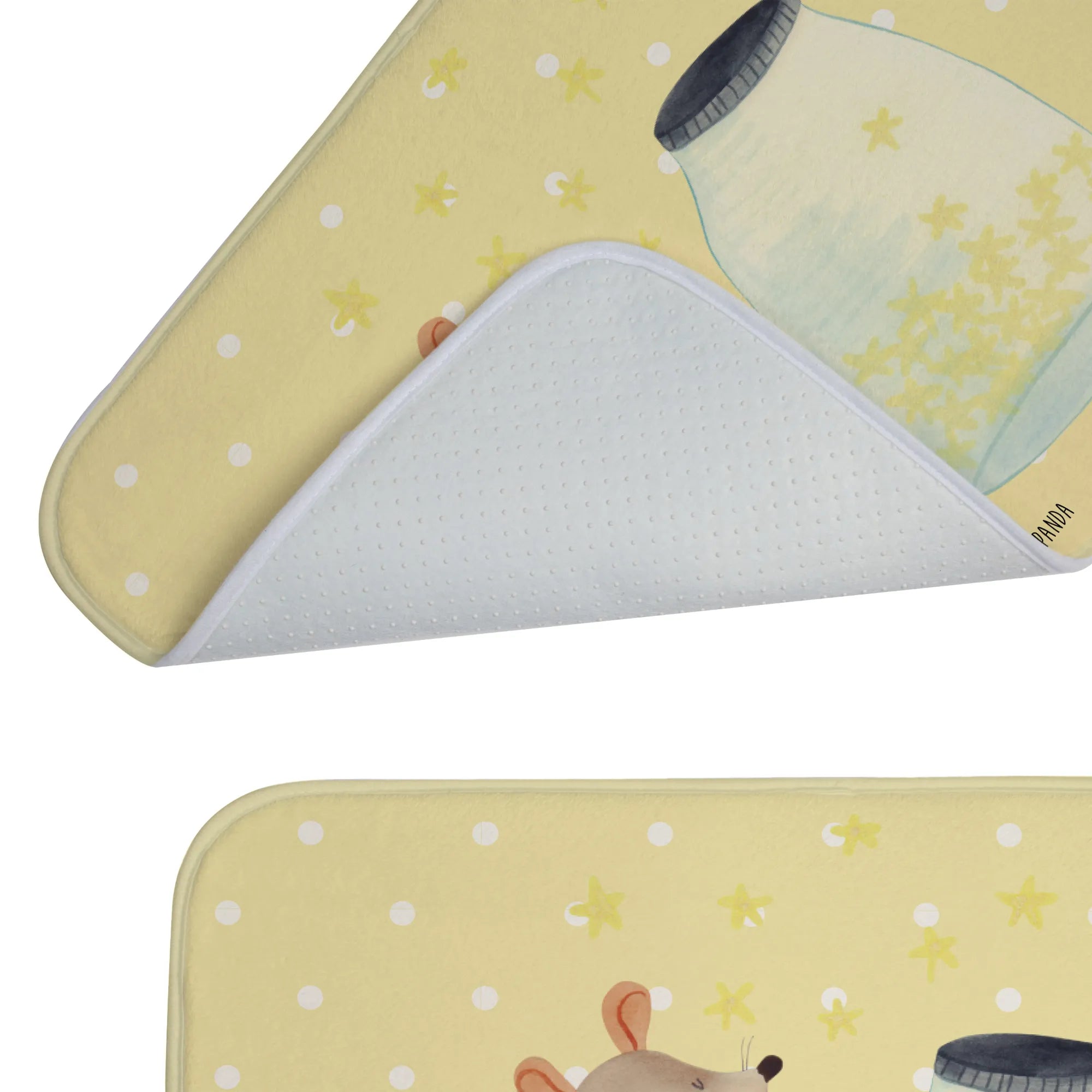 Der Badvorleger Maus Sterne von Mr. & Mrs. Panda bringt nicht nur Farbe, sondern auch Freude in dein Badezimmer! Mit seinem zauberhaften Design einer kleinen Maus, die von einem Glas voller leuchtender Sterne träumt, verwandelt dieser Badteppich jeden Raum in eine Oase der Gemütlichkeit.