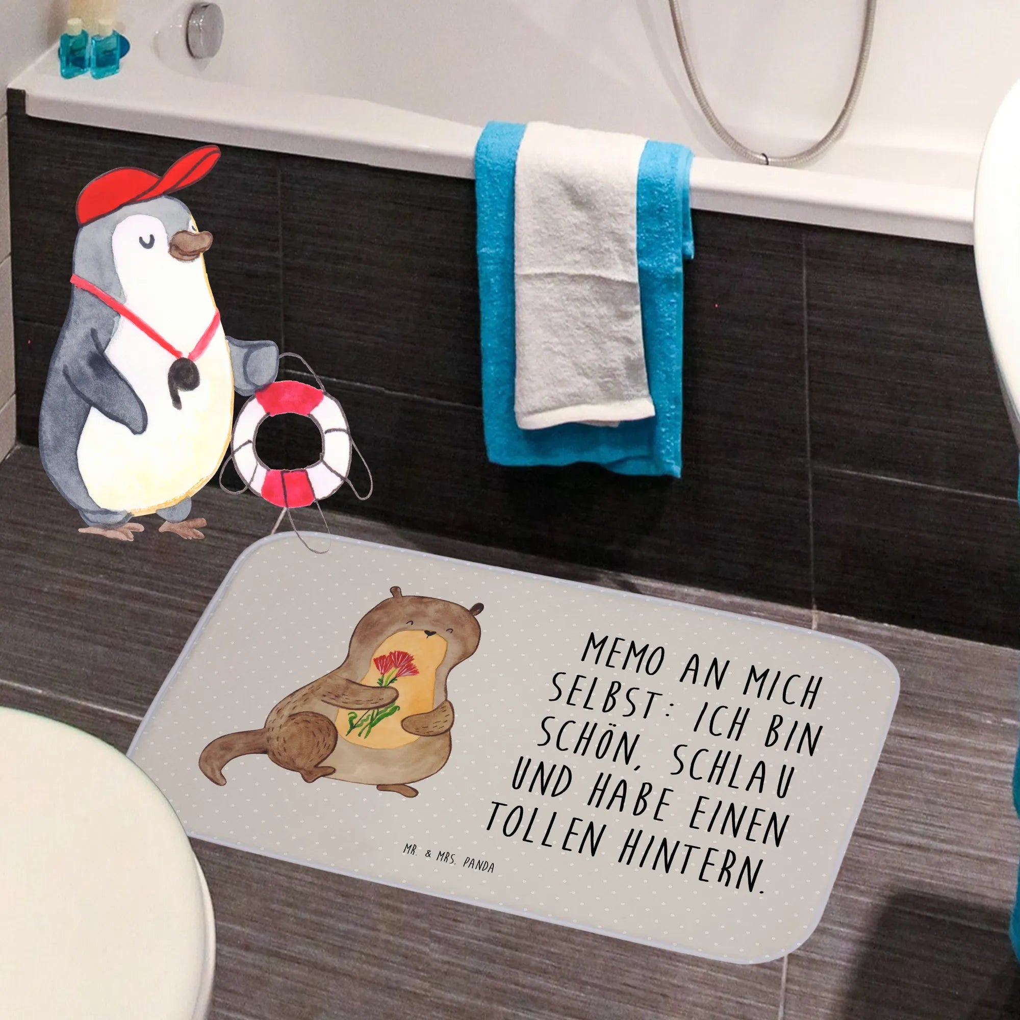 Schau dir diesen wunderschönen Badvorleger "Otter Blumenstrauß" von Mr. & Mrs. Panda an! Mit einem süßen kleinen Otter, der einen bunten Blumenstrauß hält und dich fröhlich anlächelt, bringt diese Matten dein Badezimmer zum Strahlen.