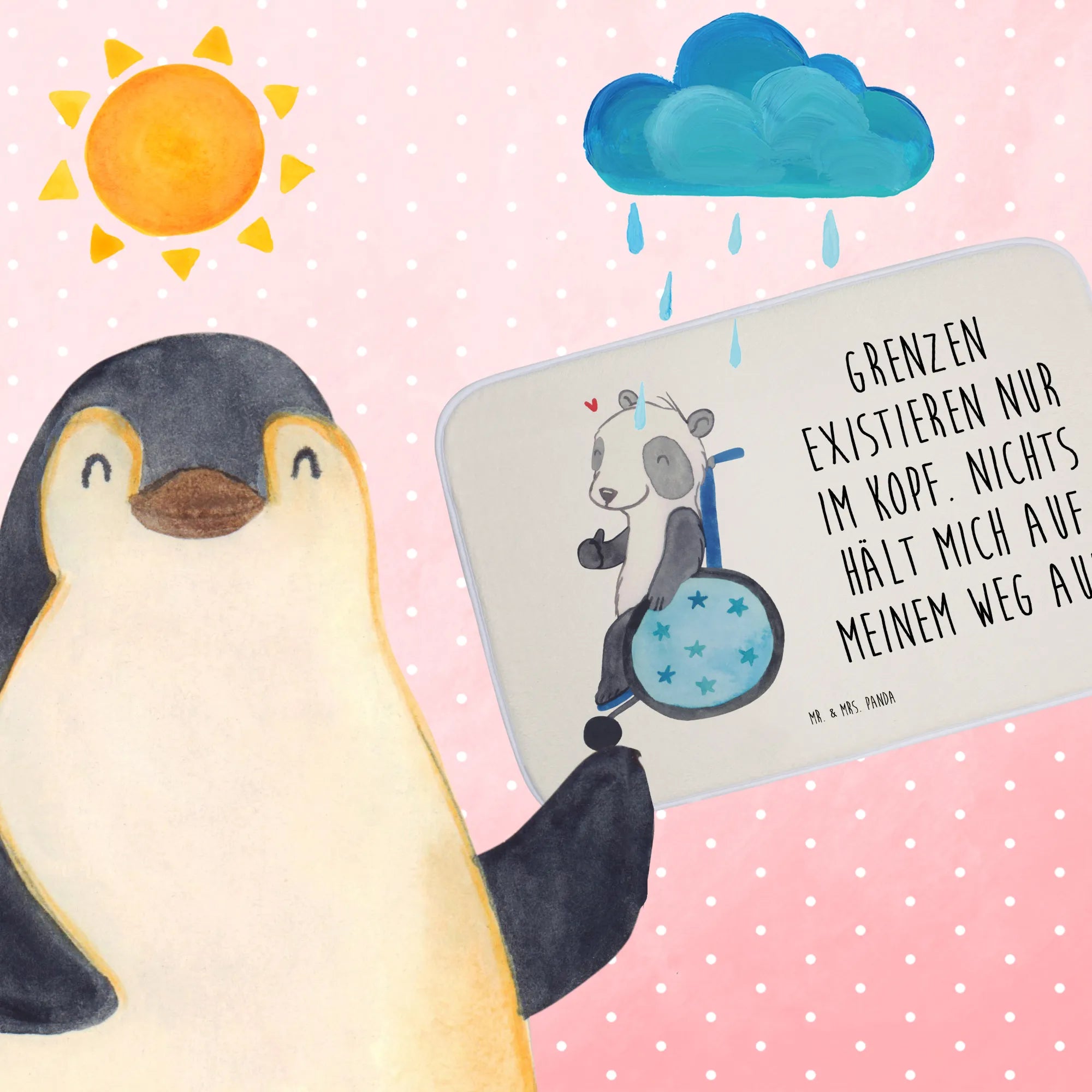 Ein Bild voller Positivität und Lebensfreude: Ein Panda, der trotz seiner Herausforderungen im Rollstuhl sitzt, lächelt und mutig den Daumen nach oben zeigt. Dieses Motiv von Mr. & Mrs. Panda symbolisiert die Botschaft, dass wir über unsere Grenzen hinauswachsen können, wenn wir nur daran glauben. 'Grenzen existieren nur im Kopf. Nichts hält mich auf meinem Weg auf', dieser Spruch ermutigt uns, die Barrieren in unseren Köpfen zu durchbrechen und unser volles Potenzial zu entfalten. Es ist eine liebevolle Erinnerung daran, dass das echte Hindernis oft unsere eigene Wahrnehmung ist und wie machtvoll wir sind, wenn wir unsere innere Stärke und unsere besonderen Fähigkeiten erkennen. Mr. & Mrs. Panda möchten mit diesem Motiv ein Zeichen für Mut, Hoffnung und die Wichtigkeit von Inklusion setzen. Jeder verdient es, seinen Platz in dieser Welt zu finden und zu glänzen, unabhängig von den Herausforderungen, denen er sich gegenübersieht.