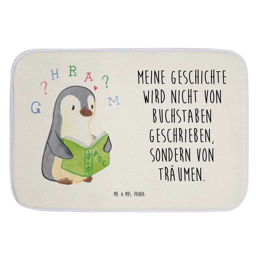 Die Badematte Pinguin Legasthenie von Mr. & Mrs. Panda ist nicht nur ein praktisches Accessoire für dein Badezimmer, sondern auch eine liebevolle Hommage an Menschen mit Legasthenie. Mit ihrem einzigartigen Design zeigt diese Duschmatte einen Pinguin, der in einem Buch liest, umgeben von Buchstaben. Der Slogan "Meine Geschichte wird nicht von Buchstaben geschrieben, sondern von Träumen" spricht für sich und erinnert uns daran, dass jeder Mensch, unabhängig von Herausforderungen, besondere Stärken hat.