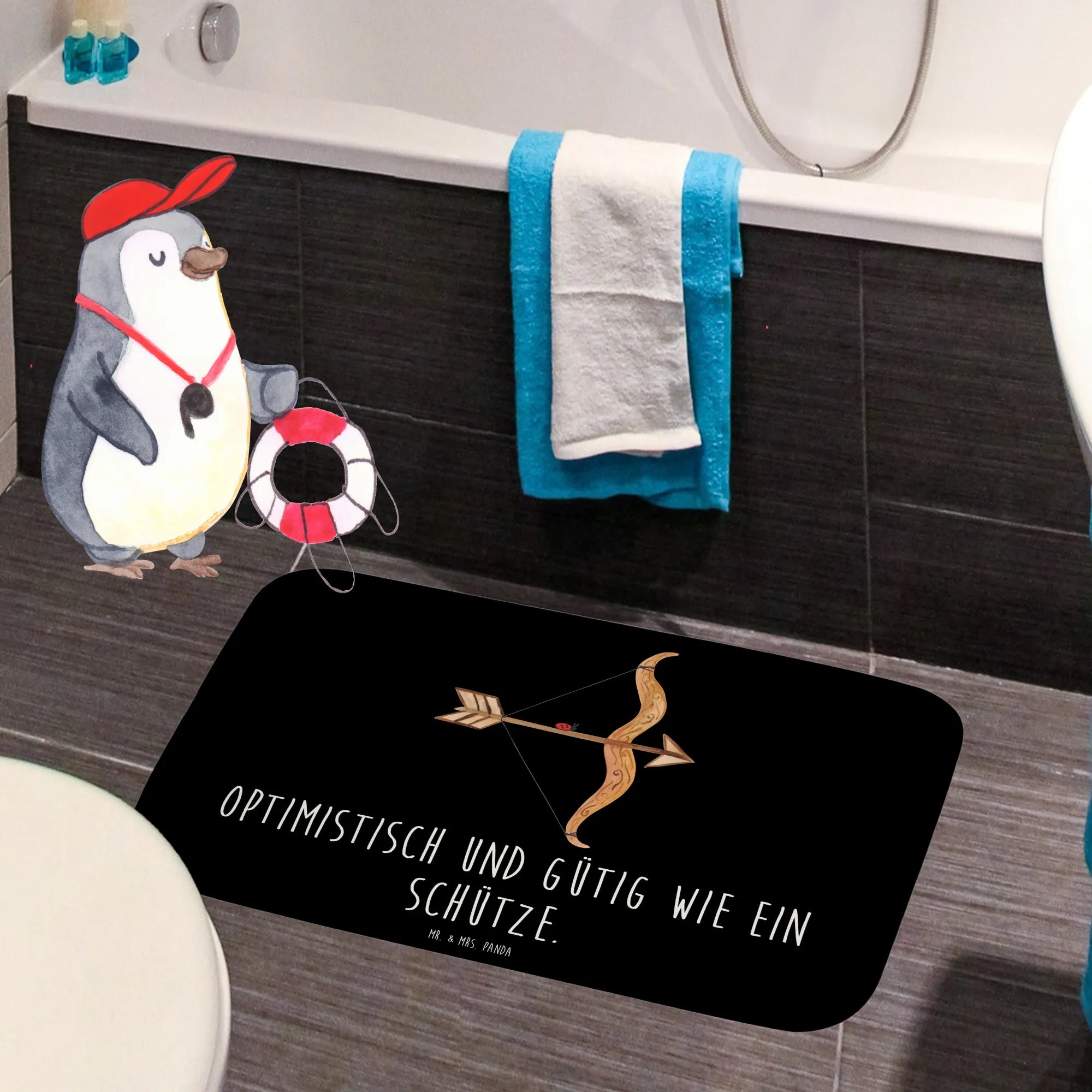 Entdecke die perfekte Ergänzung für dein Badezimmer mit dem wunderschönen Badvorleger "Sternzeichen Schütze" von Mr. & Mrs. Panda. Dieser Badteppich ist nicht nur ein praktisches Accessoire, sondern auch ein echter Hingucker! Mit dem Motto "Optimistisch und gütig wie ein Schütze" bringt er Freude in jeden Raum.