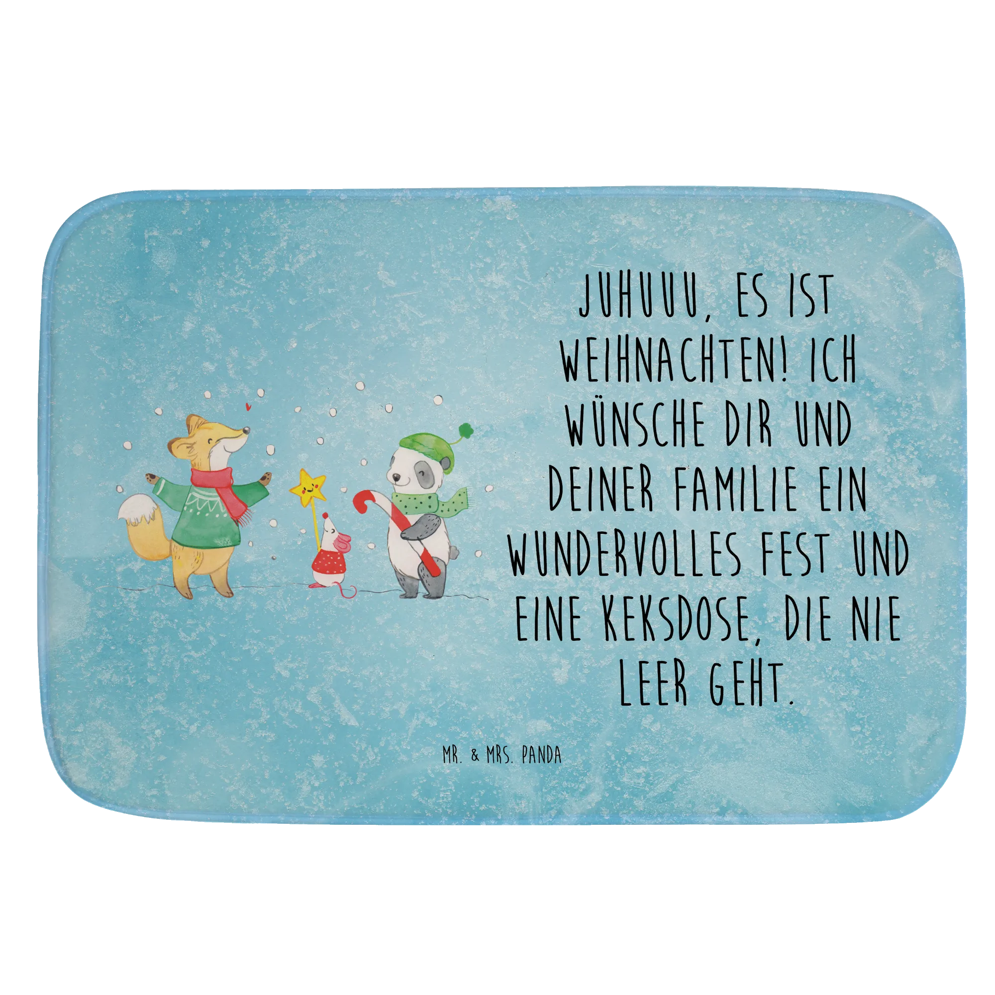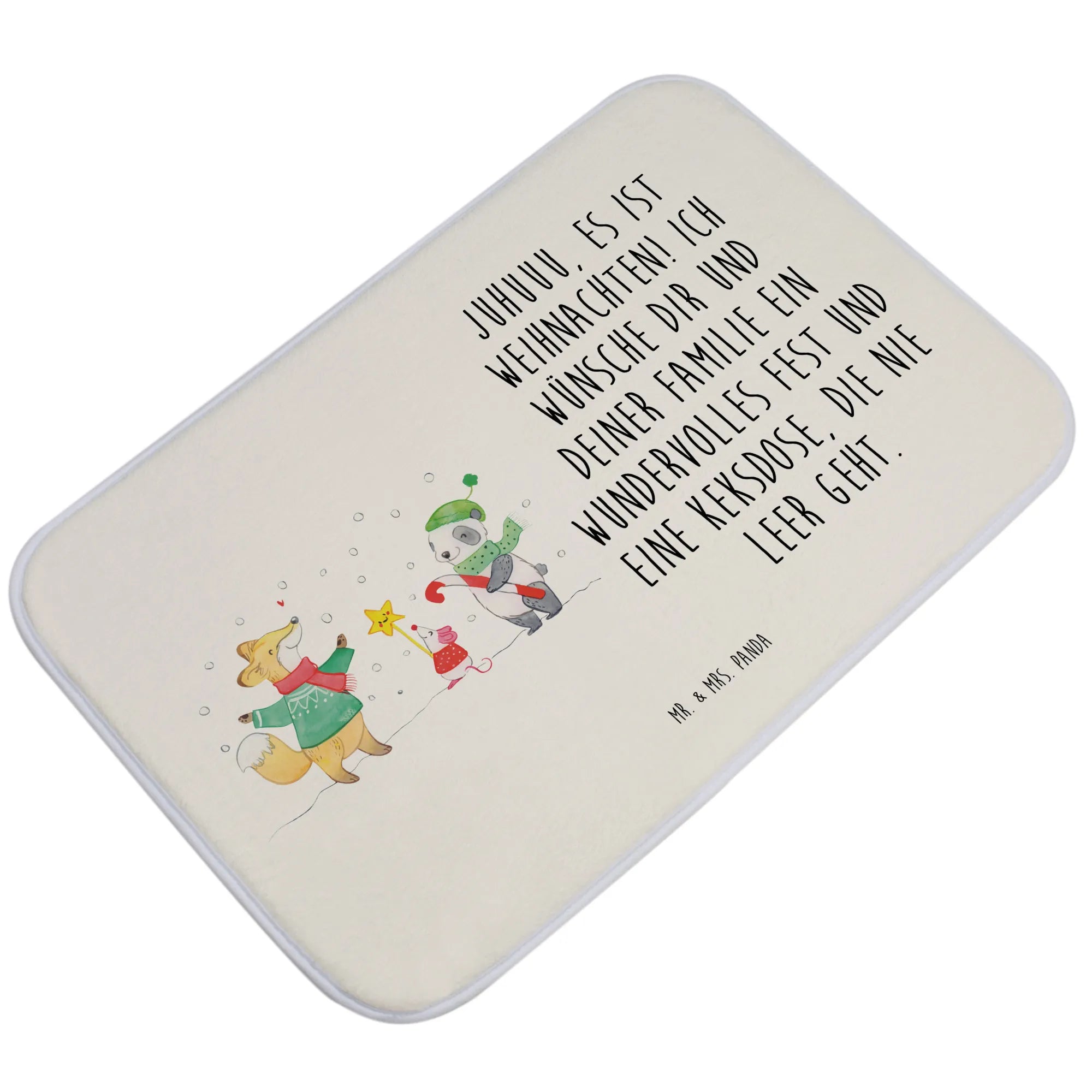 Mit einem entzückenden Motiv, das einen fröhlichen Fuchs, eine Maus und einen Panda in warmen Schals und Mützen zeigt, die im schneeweißen Winterwonderland stehen, zaubert dieser Badteppich sofort Weihnachtsfreude in dein Zuhause. Der liebevolle Slogan "Juhuuu, es ist Weihnachten! Ich wünsche dir und deiner Familie ein wundervolles Fest und eine Keksdose, die nie leer geht!" macht ihn zu einem perfekten Geschenk für die ganze Familie oder als kleine Überraschung für Freunde.