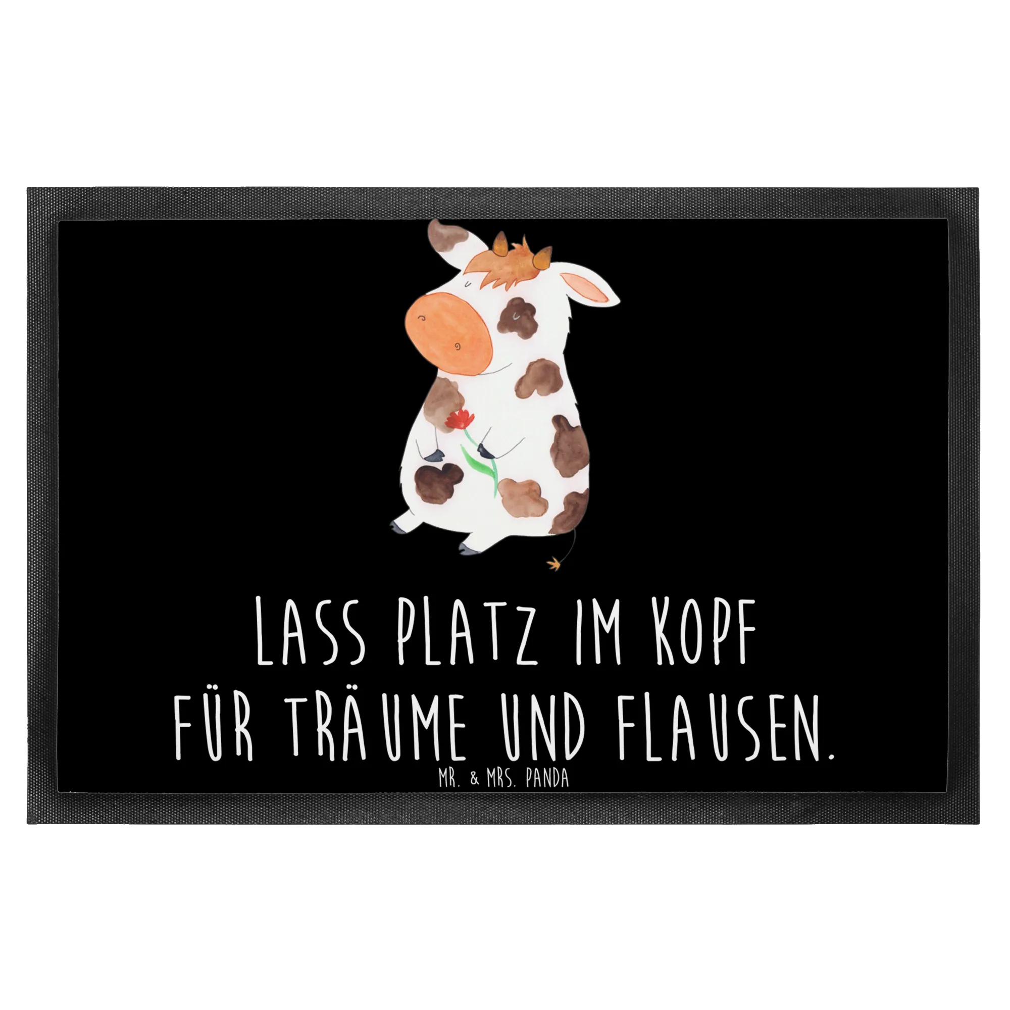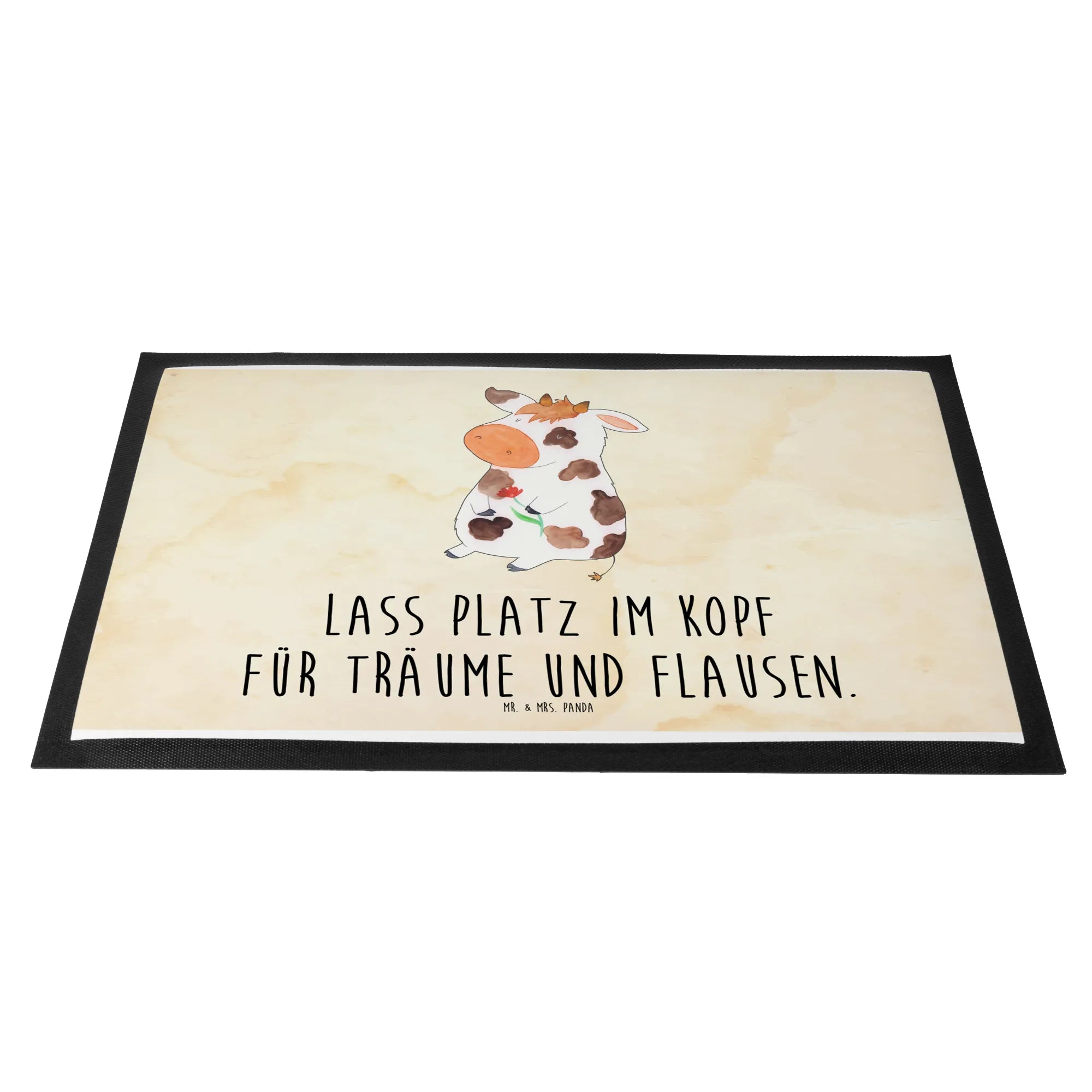 Willkommen auf dem Hof der guten Laune! Unsere Mr. & Mrs. Panda Fußmatte mit niedlicher Kuh ist mehr als nur ein Türvorleger – sie ist ein kleines Begrüßungsritual für Dein Zuhause. Die verträumte Kuh mit Blume und der liebevolle Spruch „Lass Platz im Kopf für Träume und Flausen.“ bringt Bauernhof-Charme und ein Lächeln an Deine Haustür. 🐮
