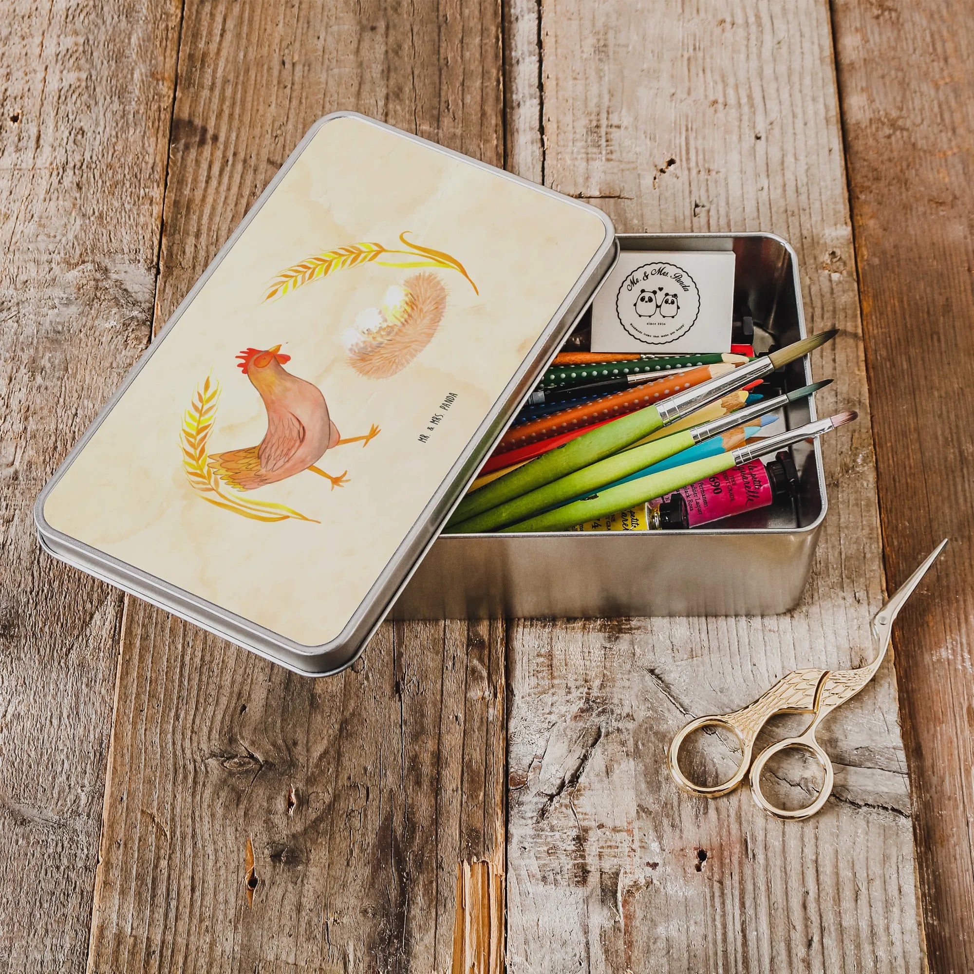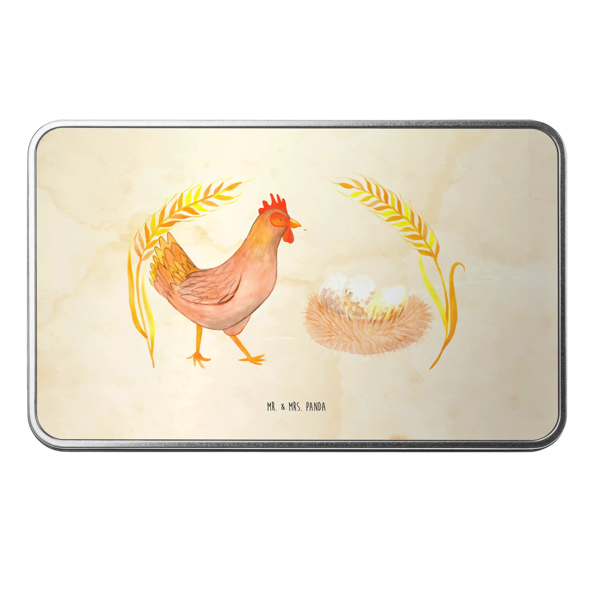 Die rechteckige Metalldose von Mr. & Mrs. Panda mit dem stolzen Huhn-Motiv ist der perfekte Begleiter für alle, die das Landleben und die Magie des Neuanfangs lieben. Ob als Vorratsdose für deine frisch gebackenen Kekse oder als Aufbewahrungsbox für tolle Erinnerungen – dieses Döschen ist nicht nur besonders stabil, sondern besticht auch durch sein einzigartiges Design. Die wunderschöne Aquarellzeichnung von Berta Henne bringt frischen Wind und Lebensfreude in jede Küche!