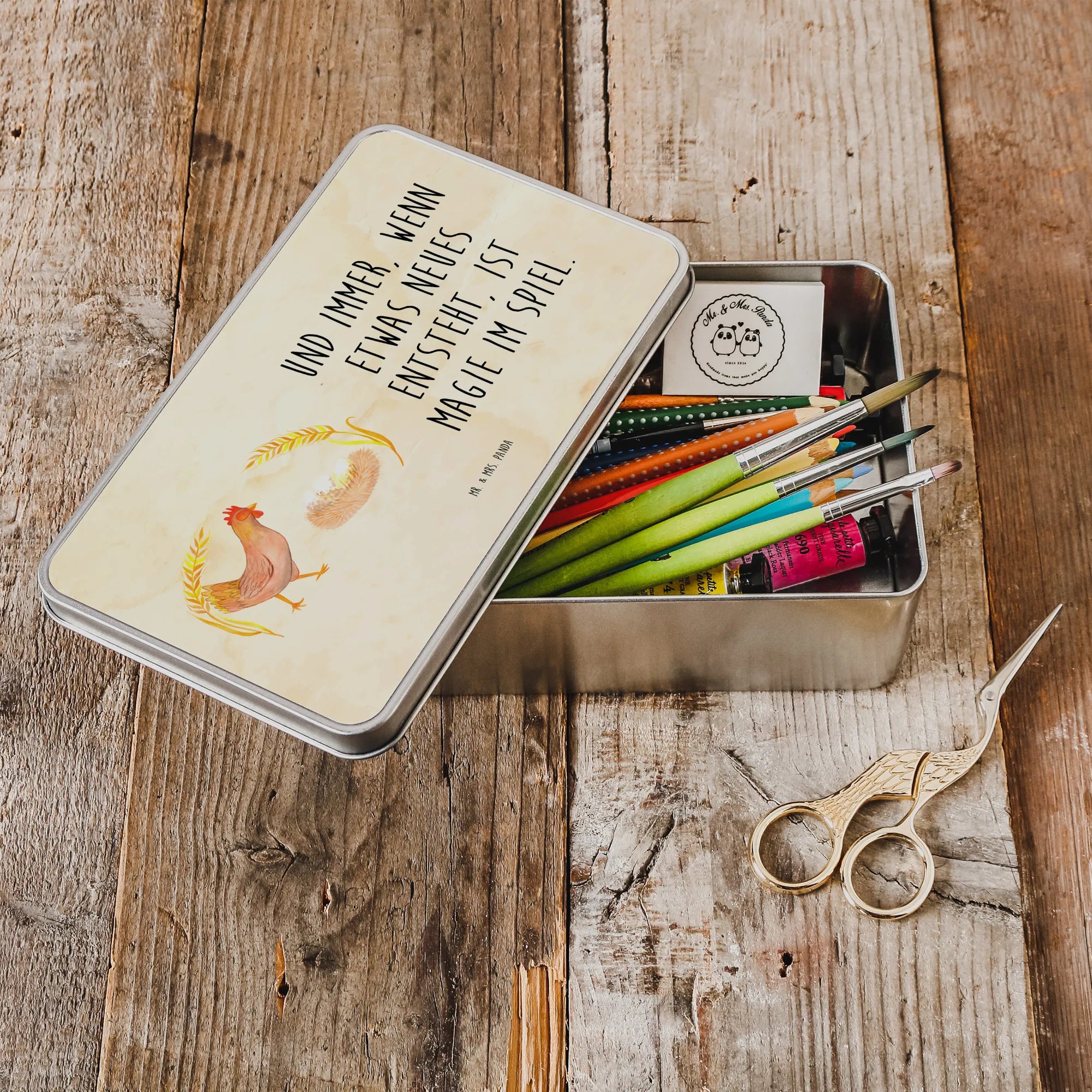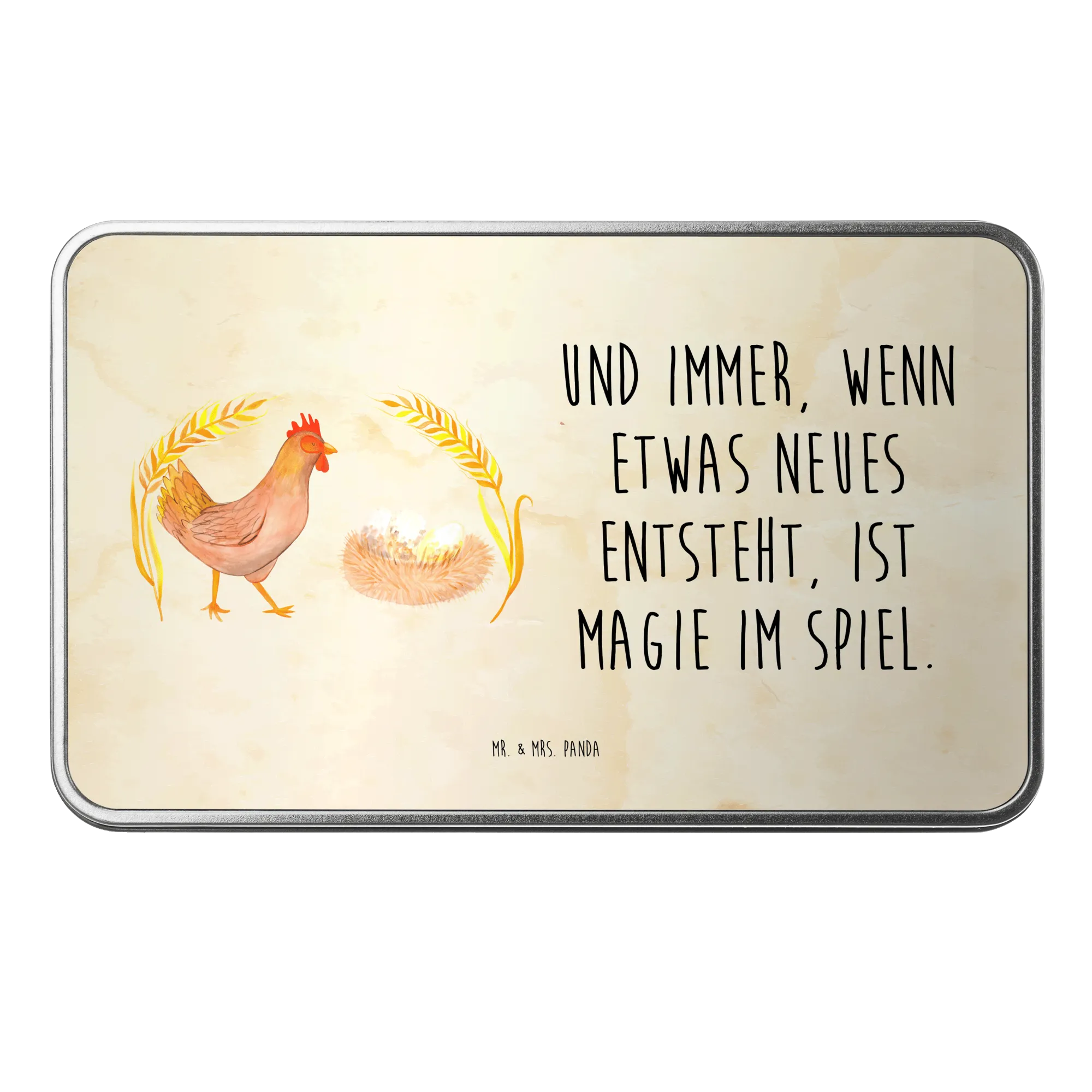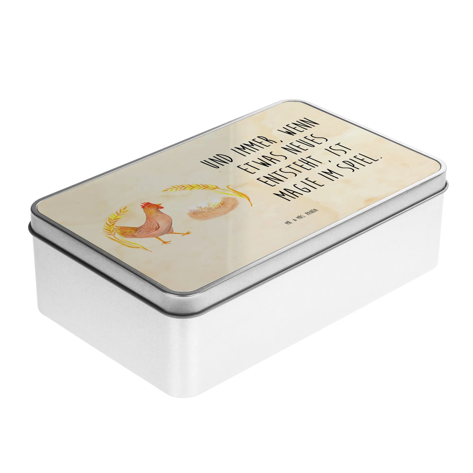 Die wunderschöne rechteckige Metalldose von Mr. & Mrs. Panda mit dem stolzen Huhn ist nicht nur ein Blickfang, sie ist auch die perfekte Aufbewahrungslösung für all deine Lieblingssnacks, Kekse oder kleine Erinnerungen. Aus hochwertigem Metall gefertigt, verbindet sie Funktionalität mit einem liebevollen Design, das jedes Herz höherschlagen lässt. Die Dose, farbenfroh bedruckt mit dem niedlichen Motiv "Huhn stolz" und dem Spruch "Und immer, wenn etwas Neues entsteht, ist Magie im Spiel", verkörpert das wunderbare Gefühl des Landlebens.