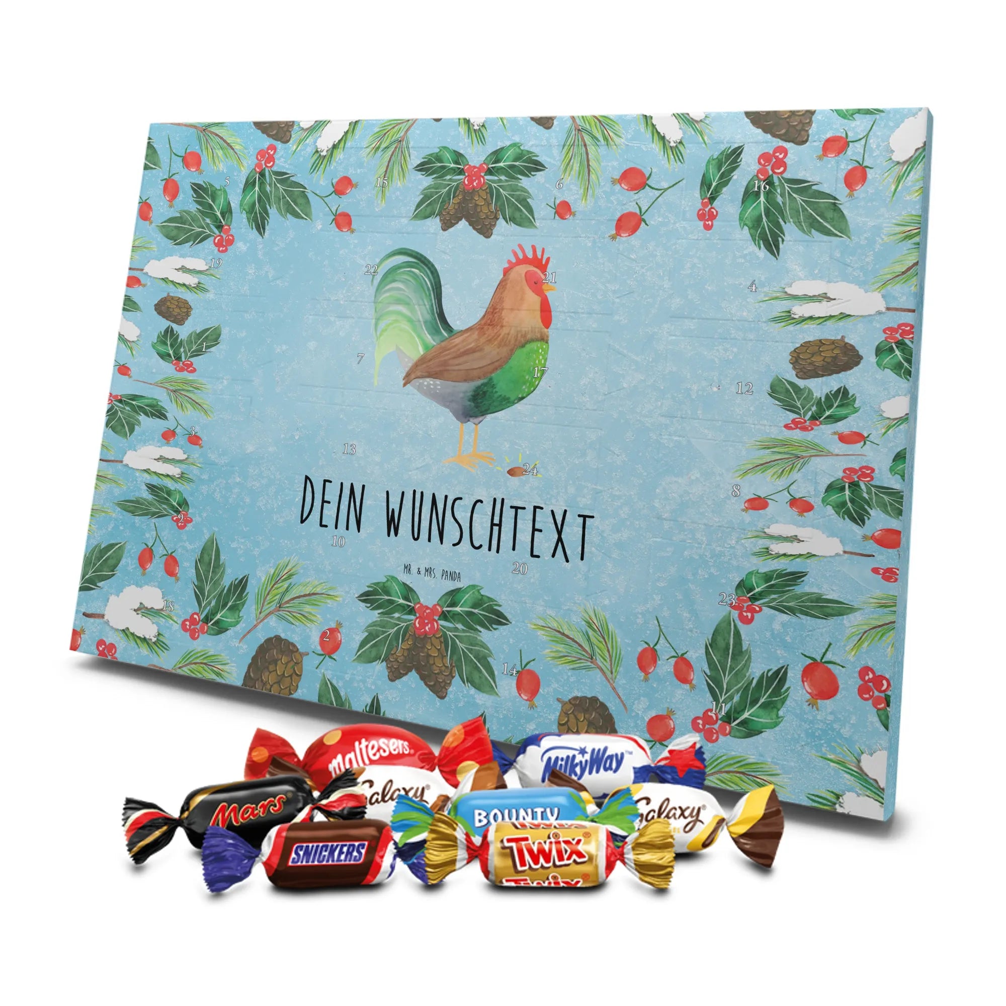 Adventskalender mit deinem Namen – individuell, süß und mit ganz viel Mr. & Mrs. Panda Charme! Dieser personalisierbare Schoko Adventskalender wird mit liebevollen Motiven & frechen Sprüchen bedruckt und lässt sich mit deinem Wunschnamen oder Wunschtext individualisieren. Durch die brillante Druckqualität und die seidenmatte Oberflächenveredelung wirken die Farben besonders intensiv und hochwertig. Auch die Seitenflächen sind bedruckt, sodass das Gesamtbild stimmig ist. Du hast die Wahl: Häng den Kalender auf oder stell ihn auf – beides funktioniert super. Der Kalender ist gefüllt mit Celebrations und enthält 24 hochwertige Füllungen in 8 verschiedenen Sorten, darunter Maltesers, Mars, Snickers, Twix, Milky Way, Bounty, Galaxy und Galaxy Caramel, die dir jeden Tag im Dezember ein Lächeln schenken. Maße: 325 mm x 225 mm x 27 mm – ideal dimensioniert für schöne Türchen-Überraschungen. Verschenke persönliche Vorfreude an Freunde, Familie oder gönn dir selbst diese zuckersüße Adventsüberraschung von Mr. & Mrs. Panda.