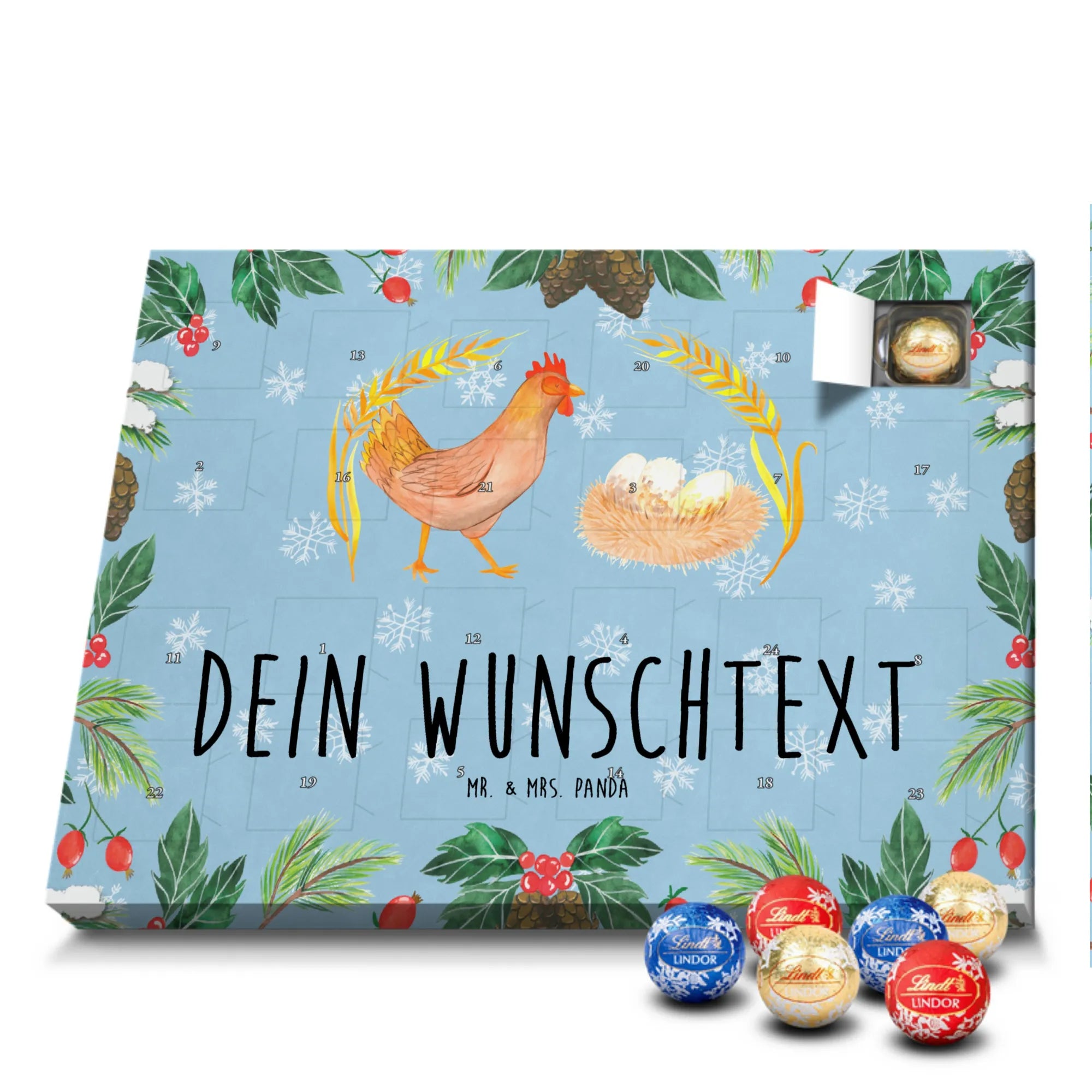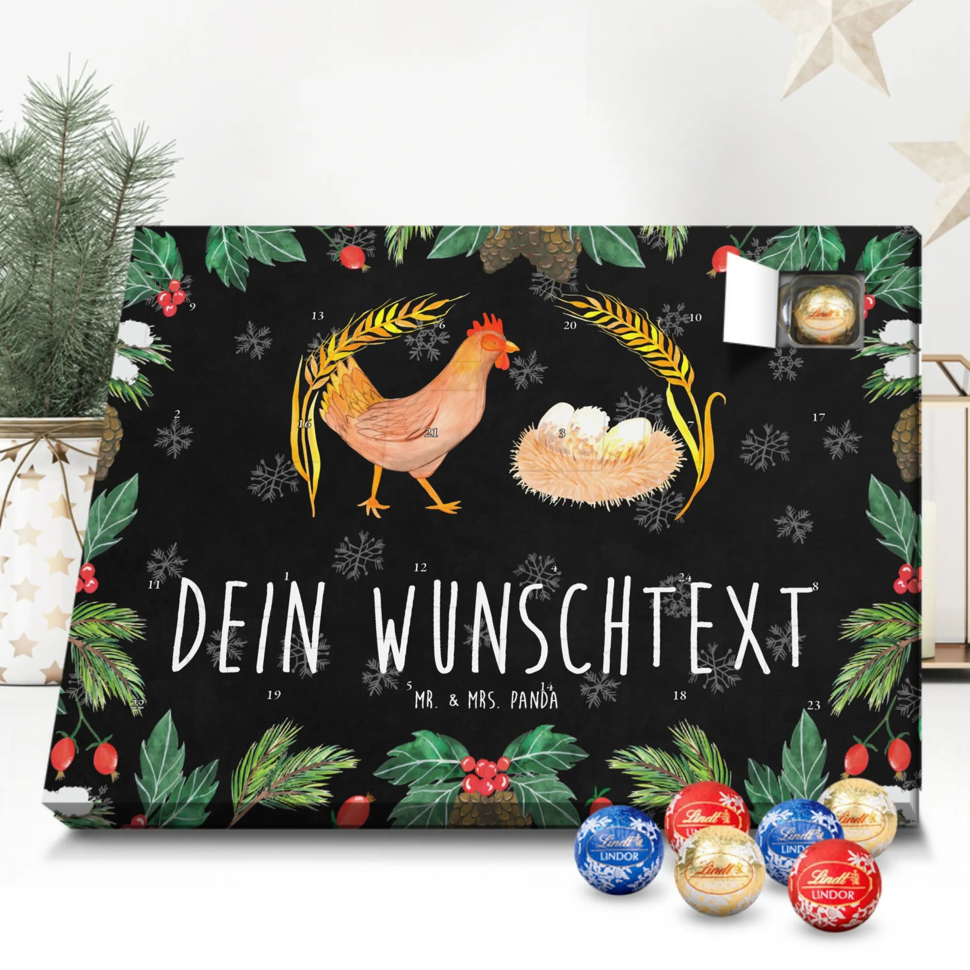 Personalisierter Schoko-Adventskalender von Mr. & Mrs. Panda – dein persönlicher Begleiter bis Weihnachten! Dieser zauberhafte Adventskalender ist bedruckt mit liebevollen Motiven und witzigen Sprüchen von Mr. & Mrs. Panda und lässt sich ganz einfach mit deinem Wunschtext oder Namen individualisieren. Die brillante Druckqualität in Kombination mit einer seidenmatten Oberflächenveredelung verleiht dem Kalender eine hochwertige Optik; auch die Seitenflächen sind bedruckt für ein rundum schönes Erscheinungsbild. Maße: 233 mm x 178 mm x 24 mm. Besonders praktisch: Du kannst den Kalender aufstellen oder an die Wand hängen – je nachdem, wo er am besten wirkt. Gefüllt mit Lindt Lindor Schokolade: 24 einzeln verpackte Markenschokoladen Kugeln in drei leckeren Sorten. Geschmacksrichtungen: Vollmilch, Feinherb und Weiße Schokolade. Zutaten: Zucker, pflanzliches Fett (Kokosnuss, Palmkern), Kakaobutter, Vollmilchpulver, Kakaomasse, Milchzucker, Magermilchpulver, Butterreinfett, Emulgator (Sojalecithin), Gerstenmalzextrakt, Aromen. Besondere Hinweise: Kann Haselnüsse und Mandeln enthalten. Ideal als Geschenk für Kinder, Partner oder beste Freunde – ein täglicher Schoko-Moment mit persönlicher Note.