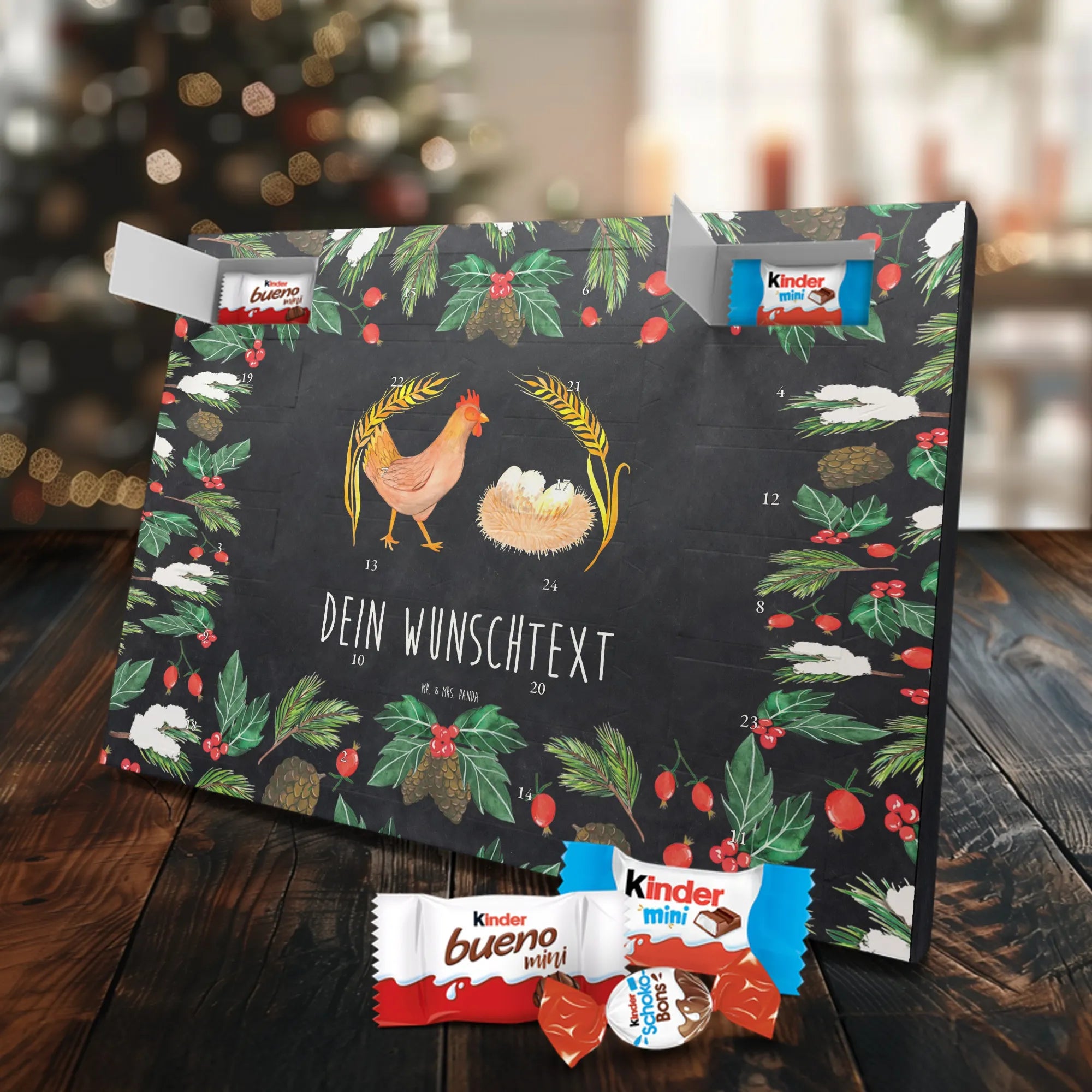 Fröhlich, persönlich und süß – unser Personalisierter Schoko Adventskalender von Mr. & Mrs. Panda bringt Wärme in die Adventszeit. Der Kalender ist liebevoll bedruckt mit wunderschönen Motiven & Sprüchen von Mr. & Mrs. Panda und lässt sich mit deinem Wunschnamen oder Wunschtext personalisieren, sodass jedes Türchen eine kleine, persönliche Überraschung wird. Die brillante Druckqualität in Kombination mit seidenmatter Oberflächenveredelung verleiht dem Kalender eine hochwertige Haptik. Auch die Seitenflächen sind bedruckt, damit dein Geschenk von allen Seiten überzeugt. Maße: 355 mm x 245 mm x 11 mm – praktisch und stilvoll. Besonderheit: kann aufgehängt oder aufgestellt werden, perfekt für Fensterbank, Kommode oder als Dekoration an der Wand. Gefüllt mit kinder® Schokolade: Adventskalender gefüllt mit kinder® Schokolade; Inhalt: kinder® Schoko-Bons, kinder® Bueno mini und kinder® Schokolade mini. Ob als Geschenk für die Liebsten oder als süße Belohnung für dich selbst – dieser Adventskalender verbindet tolles Design mit leckerem Inhalt und persönlicher Note.