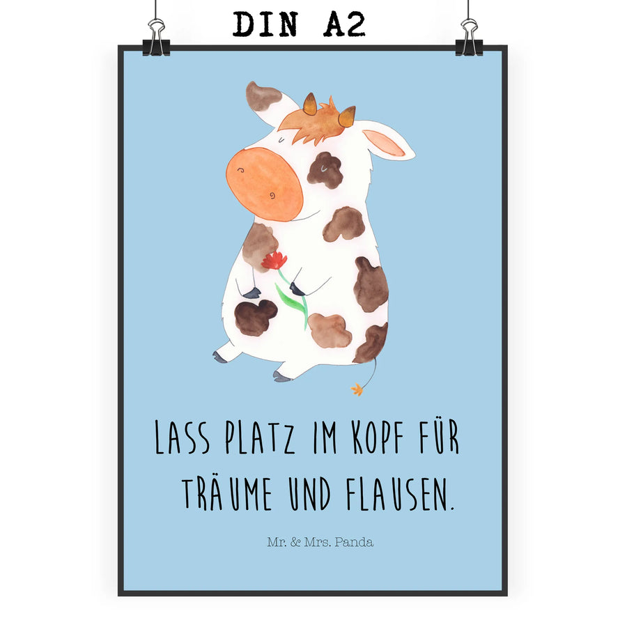Vielfalt ist Trumpf in der Bauernhof Kollektion von Mr. & Mrs. Panda! Unsere Designs zeigen liebevoll handgemalte Motive, die Kinder- und Erwachsenenherzen höherschlagen lassen. Dieses Poster zeigt eine süße Kuh, die stolz mit einer Blume in der Hand posiert und somit den perfekten Akzent für jedes Kinderzimmer oder Klassenzimmer setzt. Der alltagsnahe Spruch auf dem Poster motiviert dazu, die eigene Fantasie und Kreativität auszuleben.