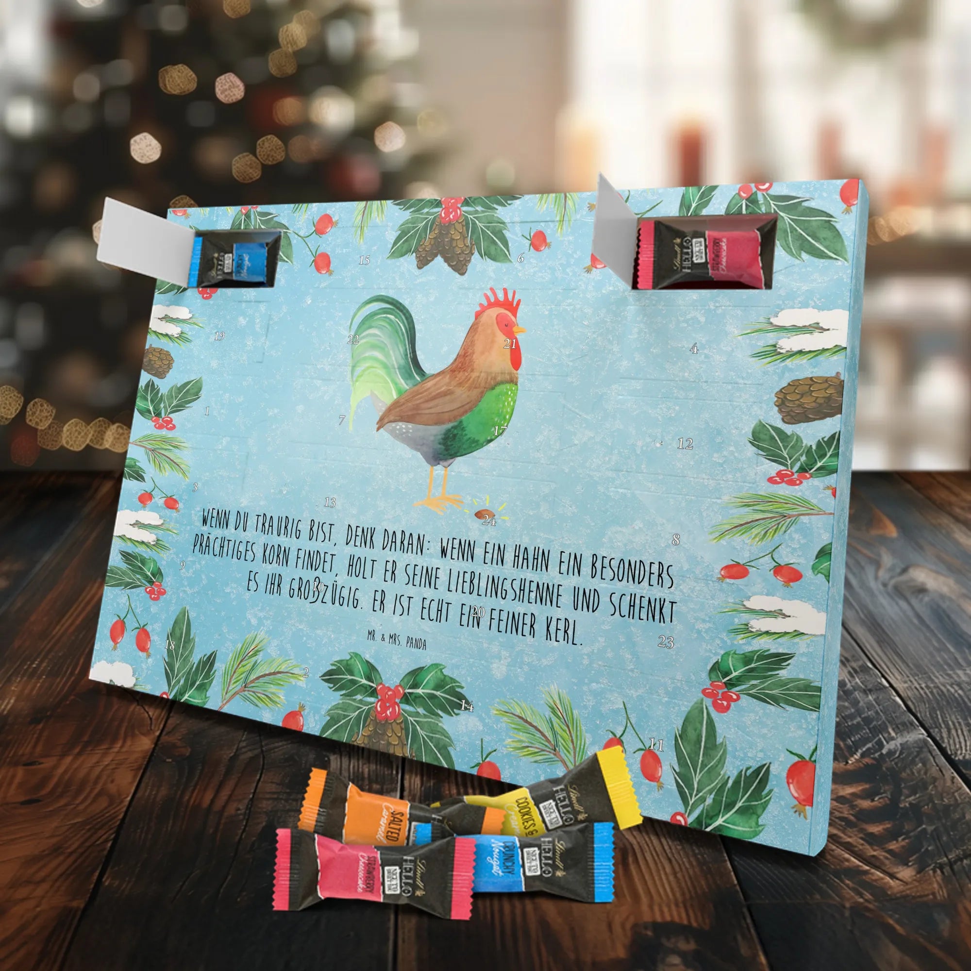 Unser Adventskalender Schokolade von Mr. & Mrs. Panda bringt dir jeden Tag eine kleine Freude. Das Design ist liebevoll bedruckt mit unseren typischen Motiven und lustigen Sprüchen – ein echter Blickfang in deinem Zuhause. Der Kalender ist nicht personalisierbar, überzeugt aber durch brillante Druckqualität und seidenmatte Oberflächenveredelung. Zusätzlich sind die Seitenflächen bedruckt, sodass das Motiv rundum zur Geltung kommt. Maße: 325 mm x 225 mm x 27 mm. Dank seines cleveren Aufhängemechanismus kannst du ihn entweder an die Wand hängen oder frei aufstellen. Gefüllt mit Lindt Hello Schokolade: 24 einzeln verpackte Schokoladen Mini Sticks in den Sorten Karamell-Schokoladenkuchen, Kekse, Knuspriger Nougat und Erdbeer-Cheesecake. Zutatenliste enthält u. a. Zucker, Kakaomasse, Vollmilchpulver, Haselnüsse; Allergene: Milcheiweiß, Milchzucker, Soja, Weizen und Haselnüsse, kann Mandeln und andere Schalenfrüchte enthalten. Perfekt als Geschenk für Kinder, Freunde oder als kleines Mitbringsel in der Adventszeit.