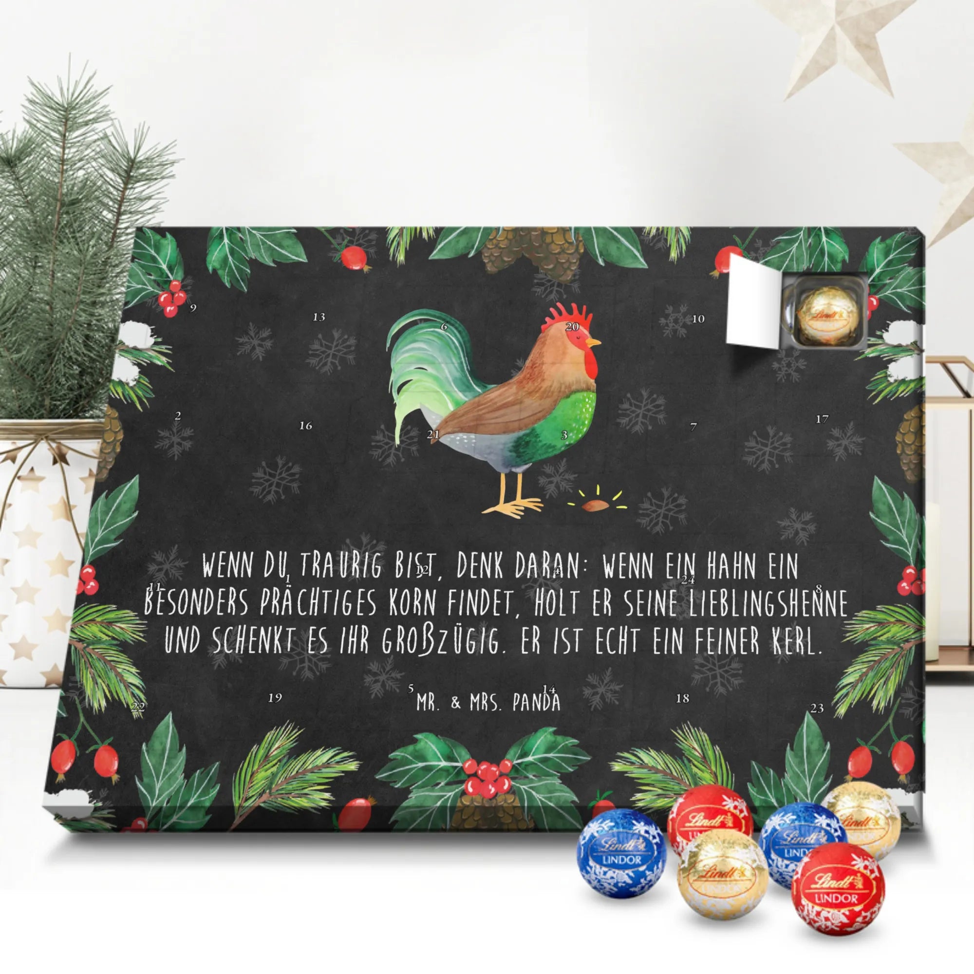 Der Schokolade Adventskalender von Mr. & Mrs. Panda ist ein liebevoll gestaltetes Highlight für deine Adventsdeko. Bedruckt mit wunderschönen Motiven & Sprüchen, nicht personalisierbar, bietet er eine charmante Optik für jeden Haushalt. Die brillante Druckqualität mit seidenmatter Oberflächenveredelung sorgt für edle Akzente, und die bedruckten Seitenflächen machen den Kalender rundum schön. Maße: 233 mm x 178 mm x 24 mm. Besonderheit: kann aufgehängt oder aufgestellt werden – richtig praktisch! Gefüllt mit Lindt Lindor: 24 einzeln verpackte Markenschokoladen Kugeln in drei köstlichen Varianten – Vollmilch, Feinherb und Weiße Schokolade – sorgen für tägliche Freuden. Zutaten: Zucker, pflanzliches Fett (Kokosnuss, Palmkern), Kakaobutter, Vollmilchpulver, Kakaomasse, Milchzucker, Magermilchpulver, Butterreinfett, Emulgator (Sojalecithin), Gerstenmalzextrakt, Aromen. Besondere Hinweise: Kann Haselnüsse und Mandeln enthalten. Ob als Geschenk oder für dich selbst – dieser Kalender ist eine wunderbare Mischung aus Design und feiner Markenschokolade.