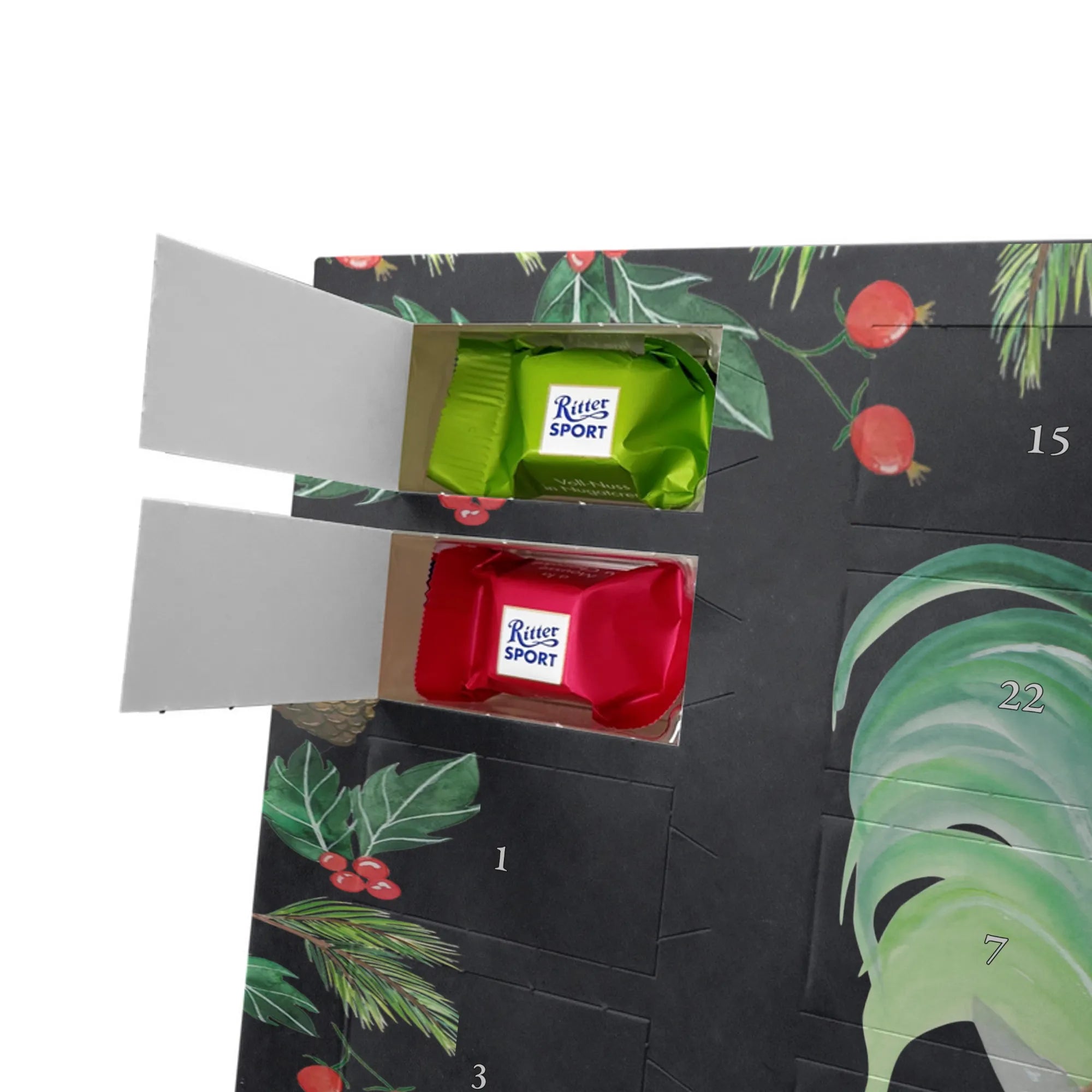 🐼 Schoko-Adventskalender: Liebevolles Design, seidenmatt, brillanter Druck – ein Hingucker.